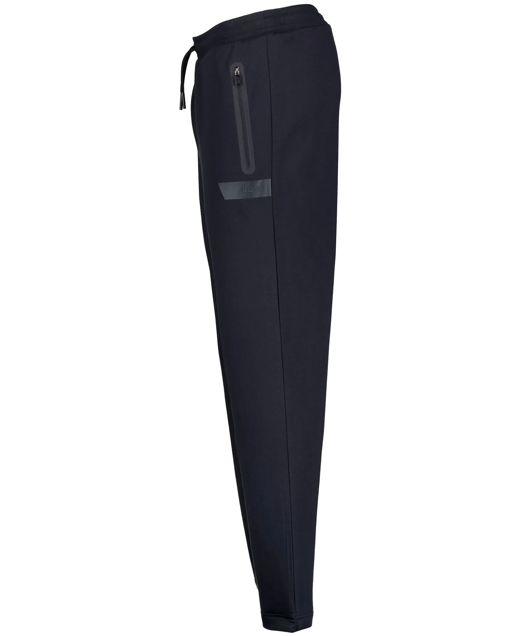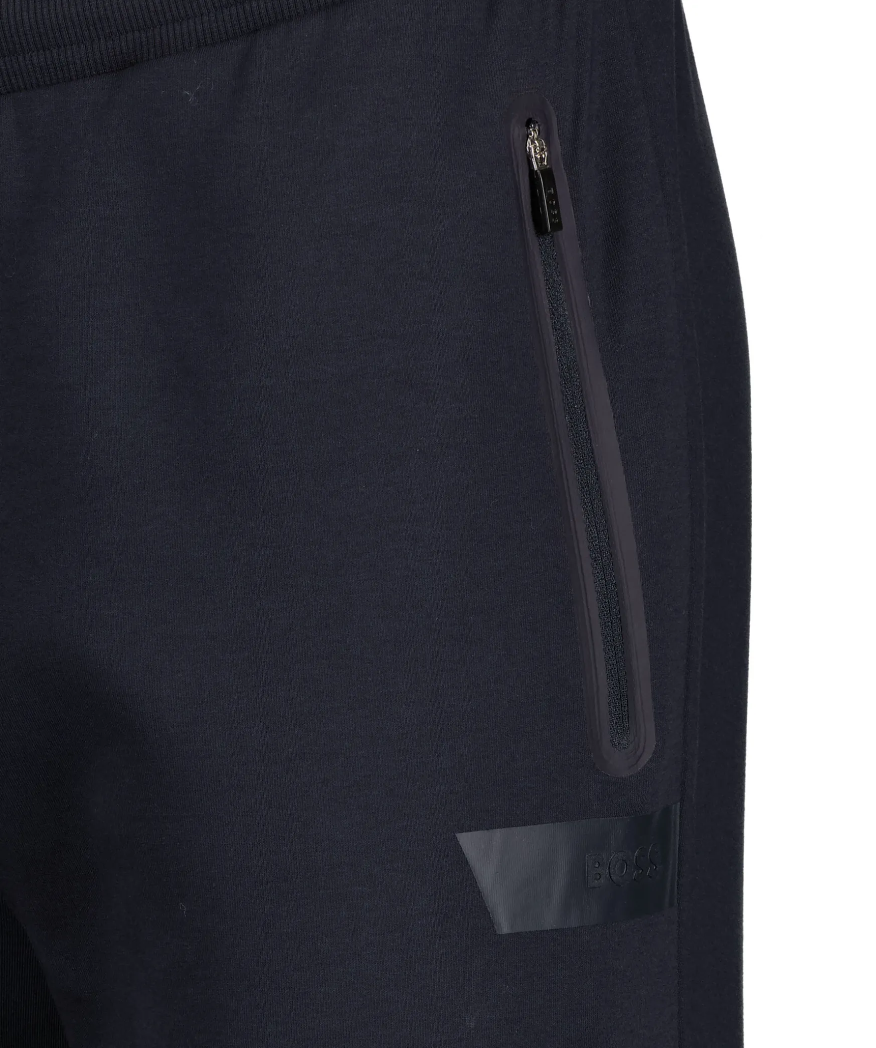 Morkbla Mjukisbyxor Fran Boss Green. Dragsko I Midjan. Tva Fickor Framtill Som Stangs Med Dragkedjor I Svart. Bakficka Pa Hoger Sida. Gummerad Logotyp Pa Vanster Lar Med Vit Bakgrund. Vita Detaljer.