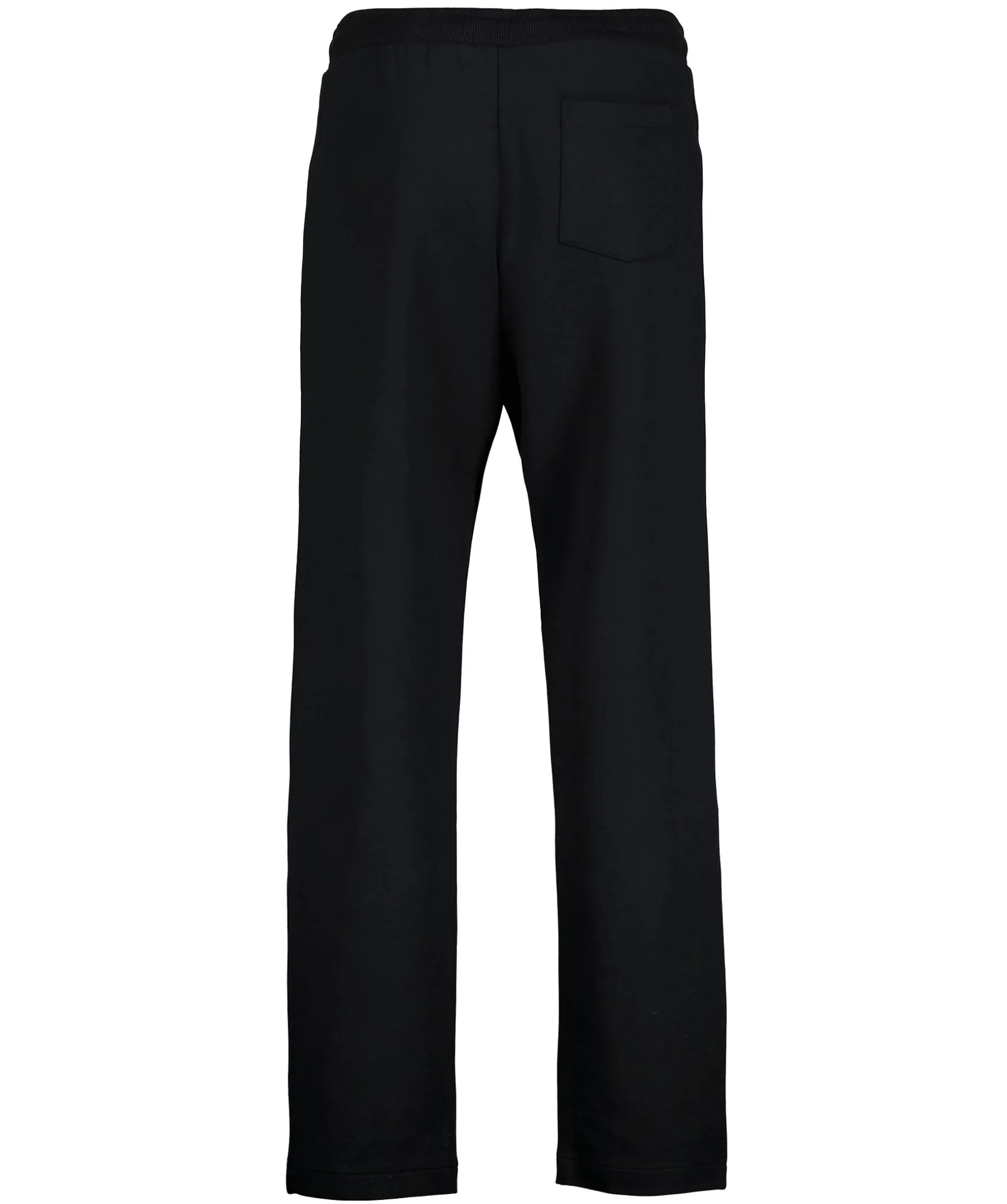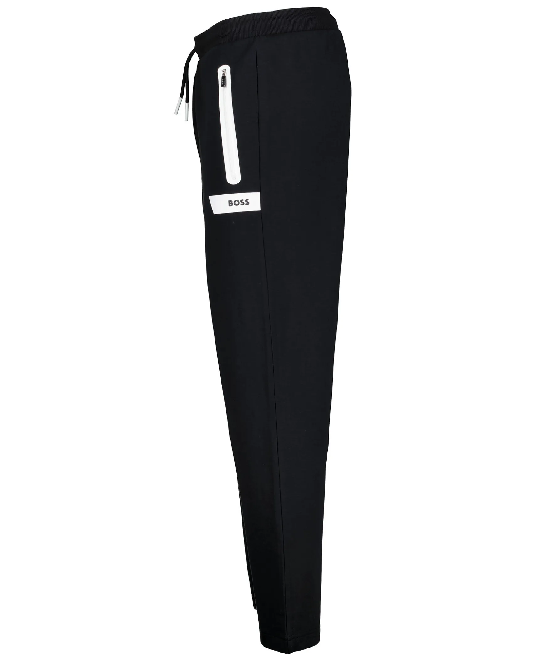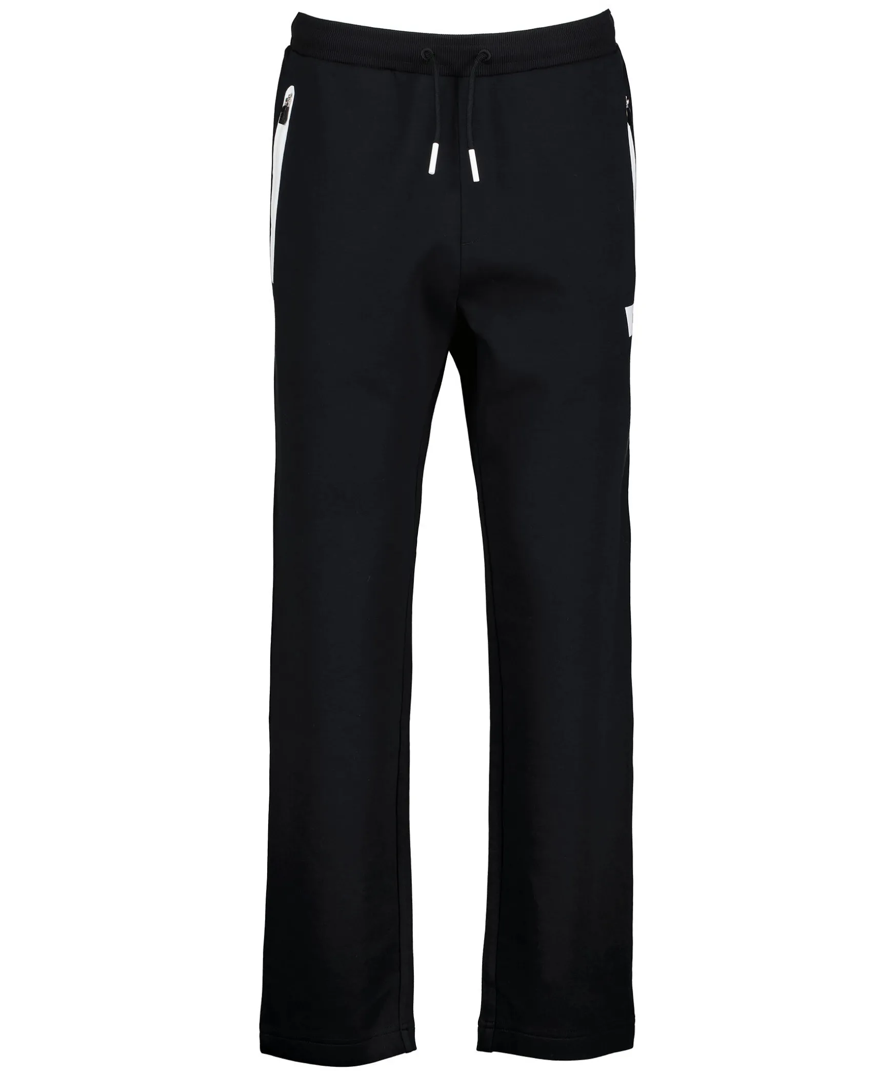 Svarta Mjukisbyxor Fran Boss Green. Rak Passform. Tva Dragkedjor Framtill Som Stangs Med Dragkedja I Vitt. Ribbstickad Mudd I Midjan Med Dragsko, Vita Detaljer Pa Snorningen. Tryckt Och Gummerad Logotyp I Svart Och Vitt Pa Vanster Lar.