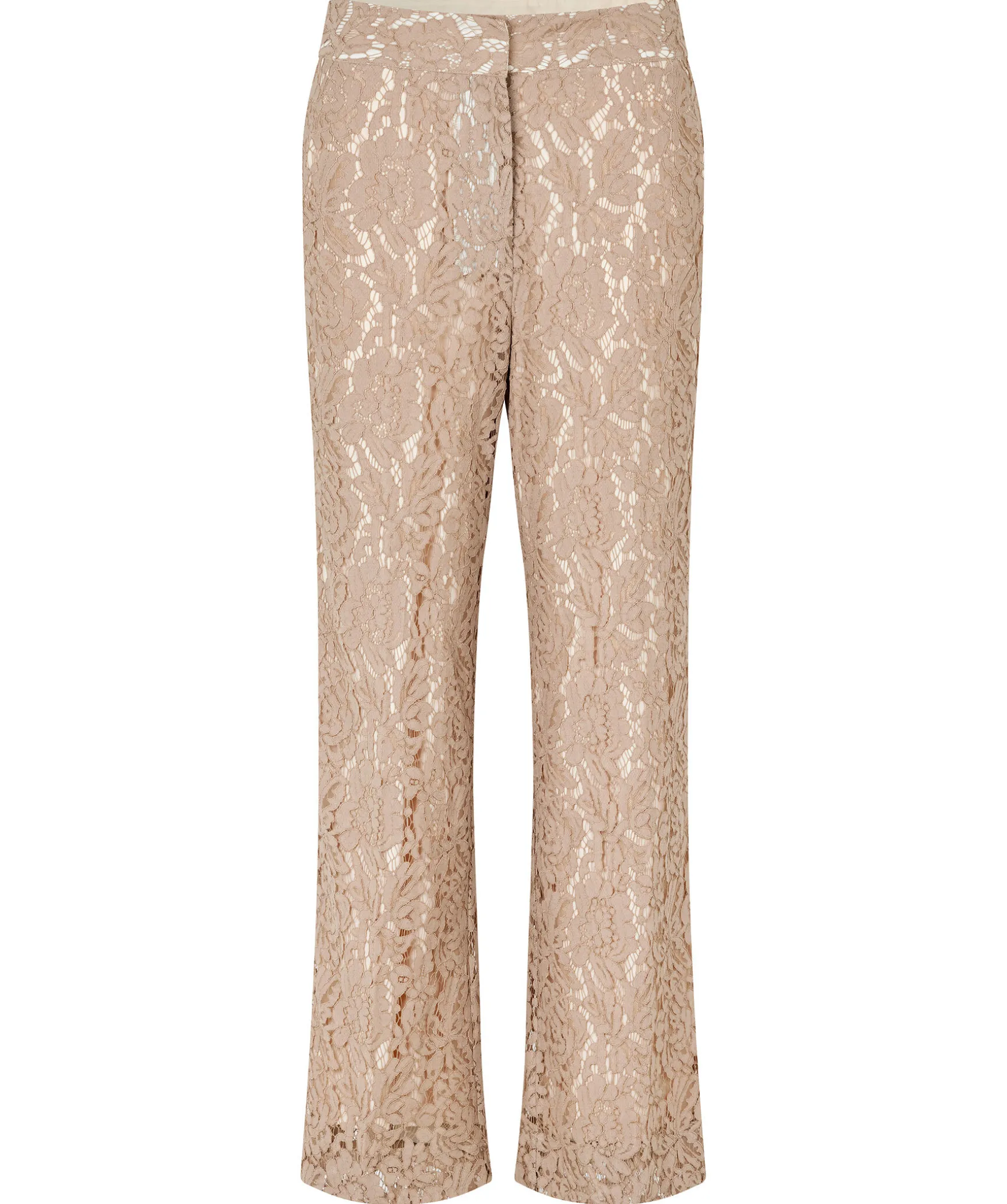 Beigea Spetsbyxor Fran Second Female. Tillverkad I Ett Bomullsblommigt Spetstyg Med Kontrasterande Viskosfoder. Har En Dold Dragkedja Framtill Med Hakar Och Knapp Inuti Midjebandet. Tva Snedstallda Fickor Fram Och Tva Dekorativa Jetfickor Bak. Raka Ben.