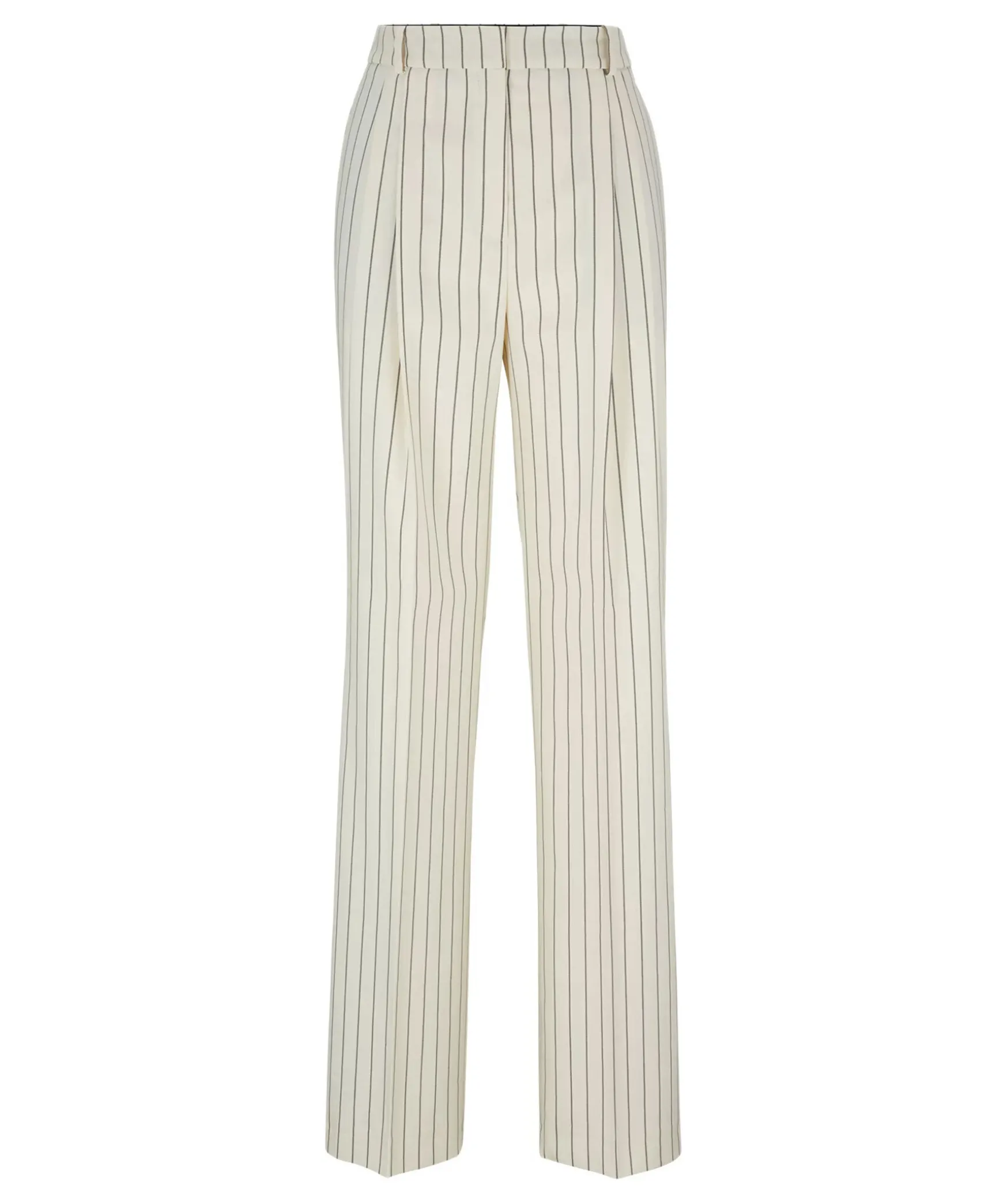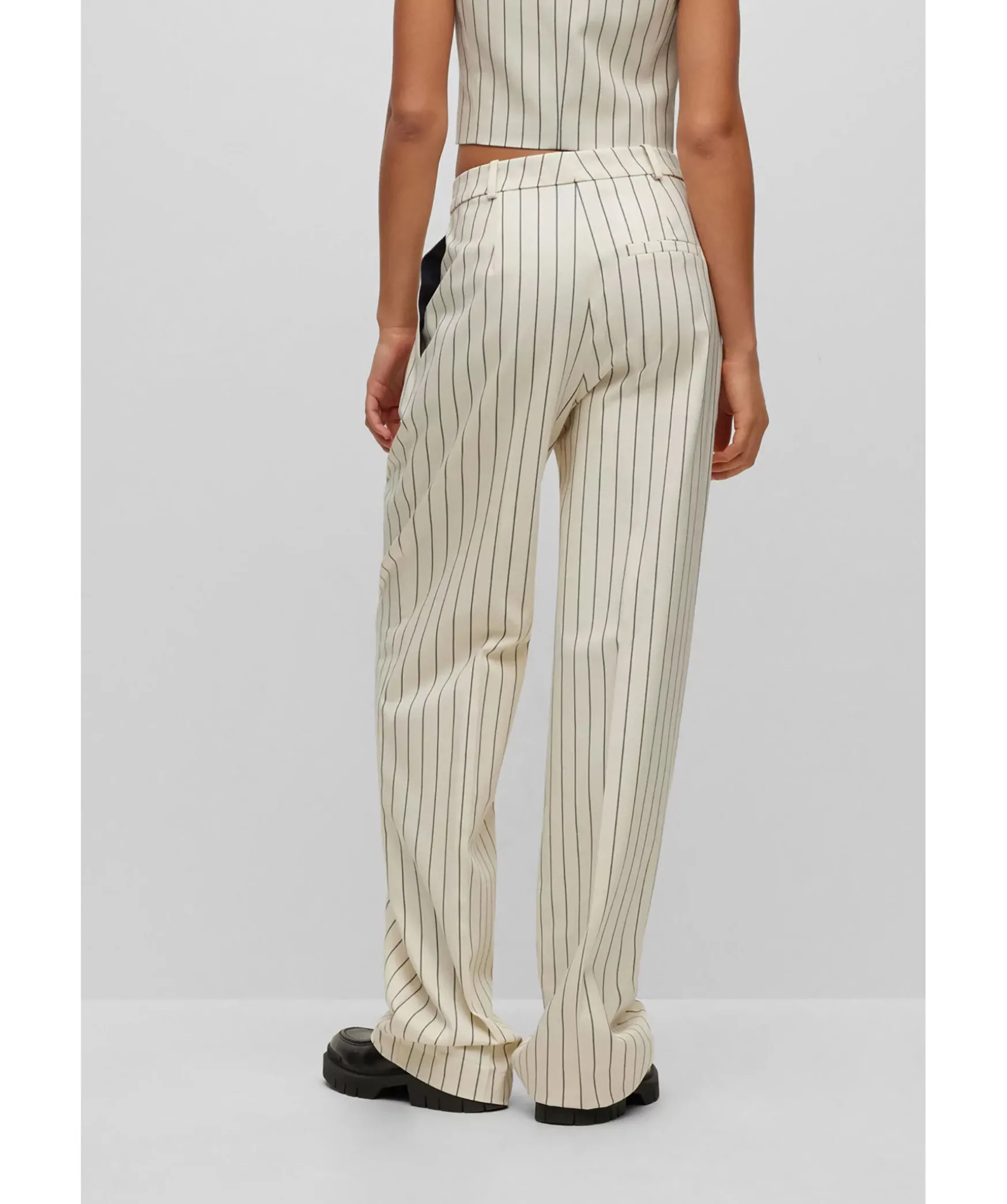 Benvita Mellanhoga Byxor Fran Hugo Womenswear Med Vertikala Rander. Tillverkade Av En Blandning Med Stretch, Bomull Och Ull. Skurna Till En Avslappnad Passform Med Vida Ben Och Dubbla Veck Fram. Byxorna Har Tva Sidfickor, En Passpoalficka I Bak Samt Balteshallor.