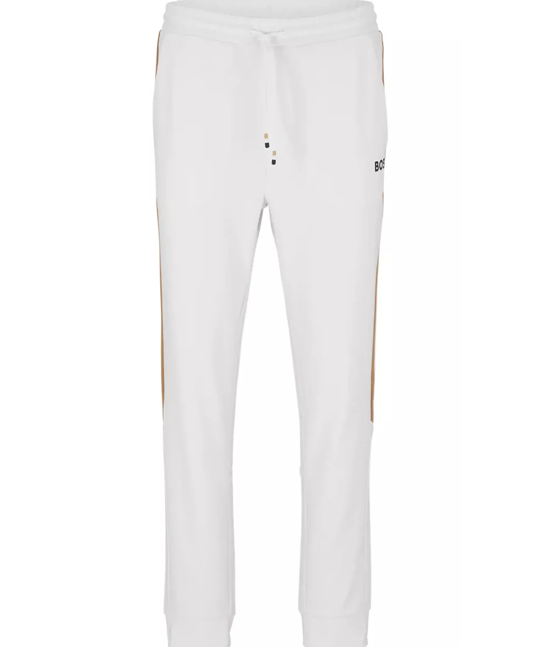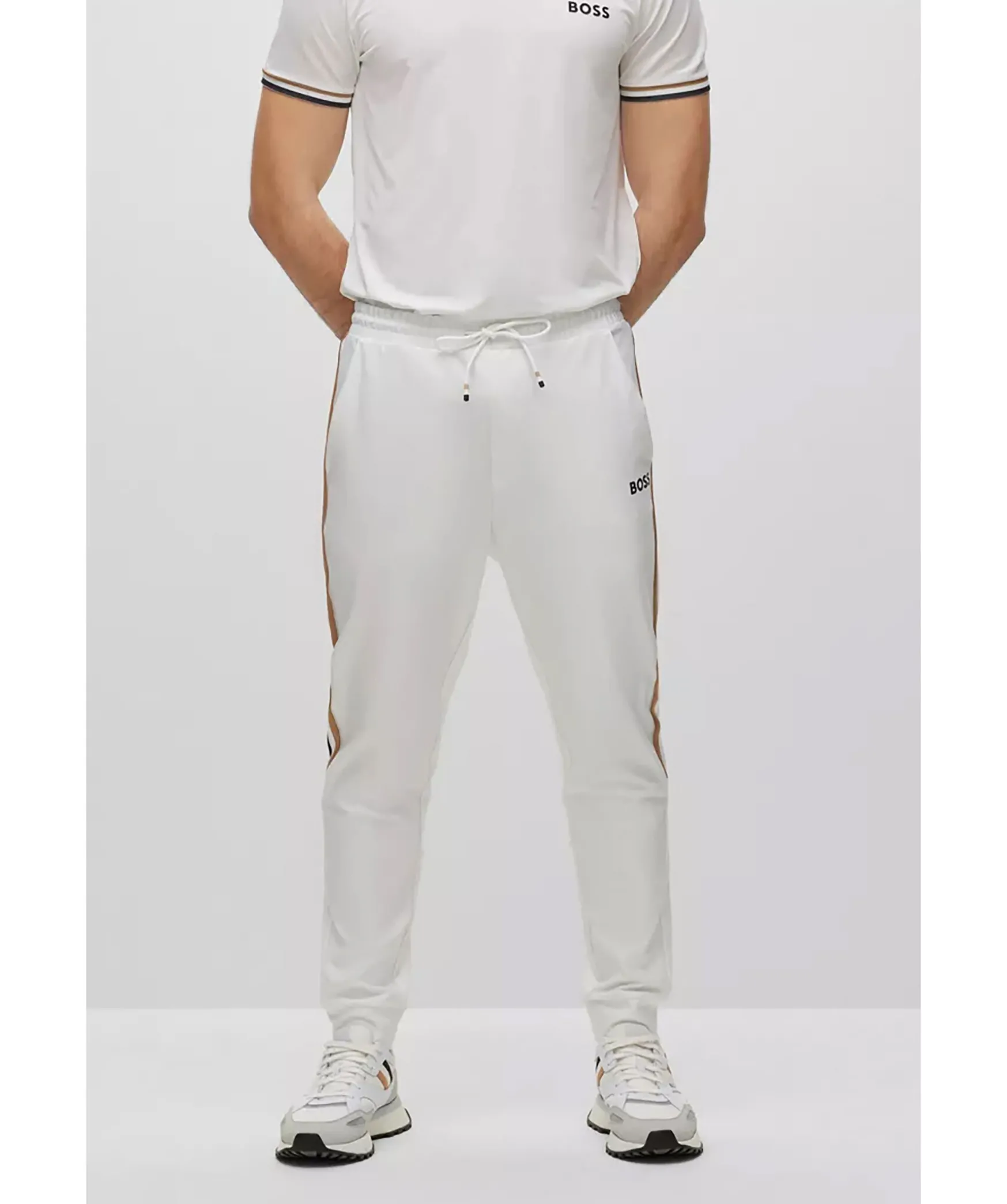 Vita Tracksuitbyxor Fran Boss Green. Vit, Liten Boss-Logotyp Under Den Vanstra Fickan Och Detaljerade Med Signaturrander Vid Varje Sidosom. Dragsko I Midjan Med Snorning, Fickor I Sidorna. Prestandastretchtyget Ger Enkel Komfort Pa Aktiva Dagar. En Del Av Den Dynamiska Kapselkollektionen Boss X Matteo Berrettini, Skapad Av Den Italienska Professionella Tennisspelaren.