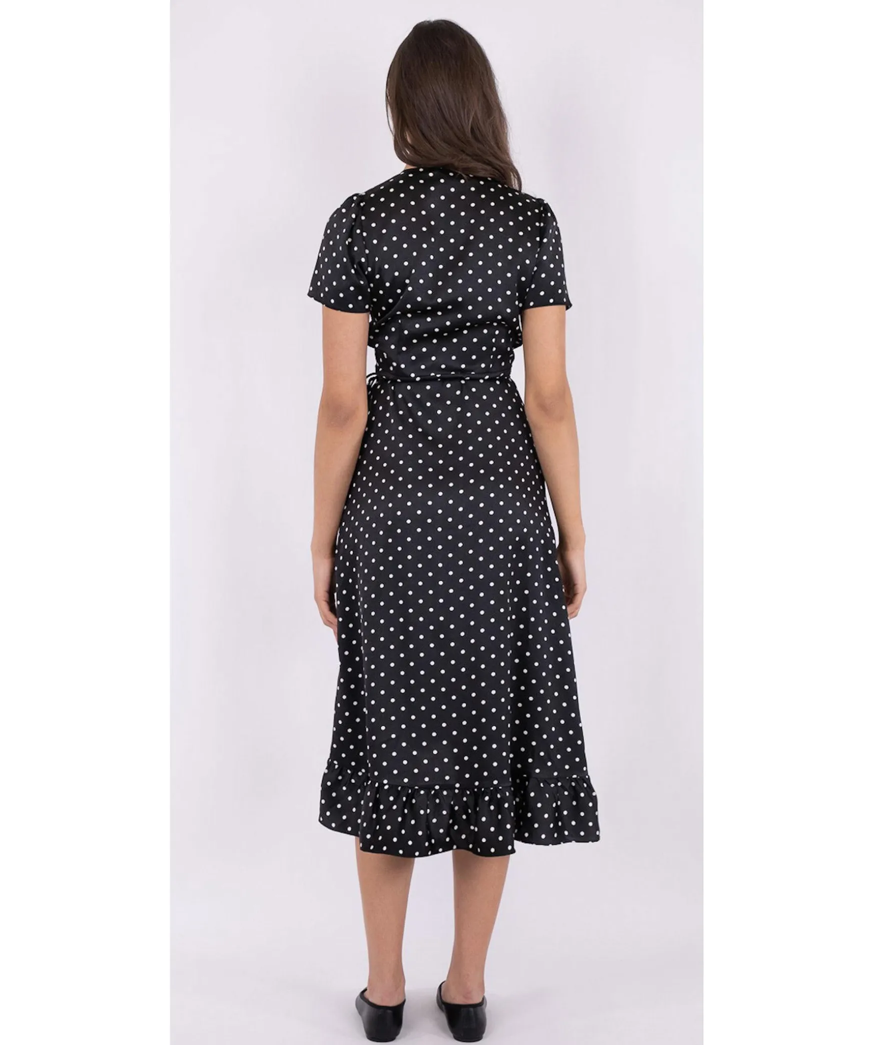 Svart Och Vit Prickig Klanning I Omlott-Modell Fran Neo Noir. V-Ringad. Kjol Med Volanger. Snorning I Midjan. Korta Armar. Klanningen Slutar Strax Nedanfor Knana.