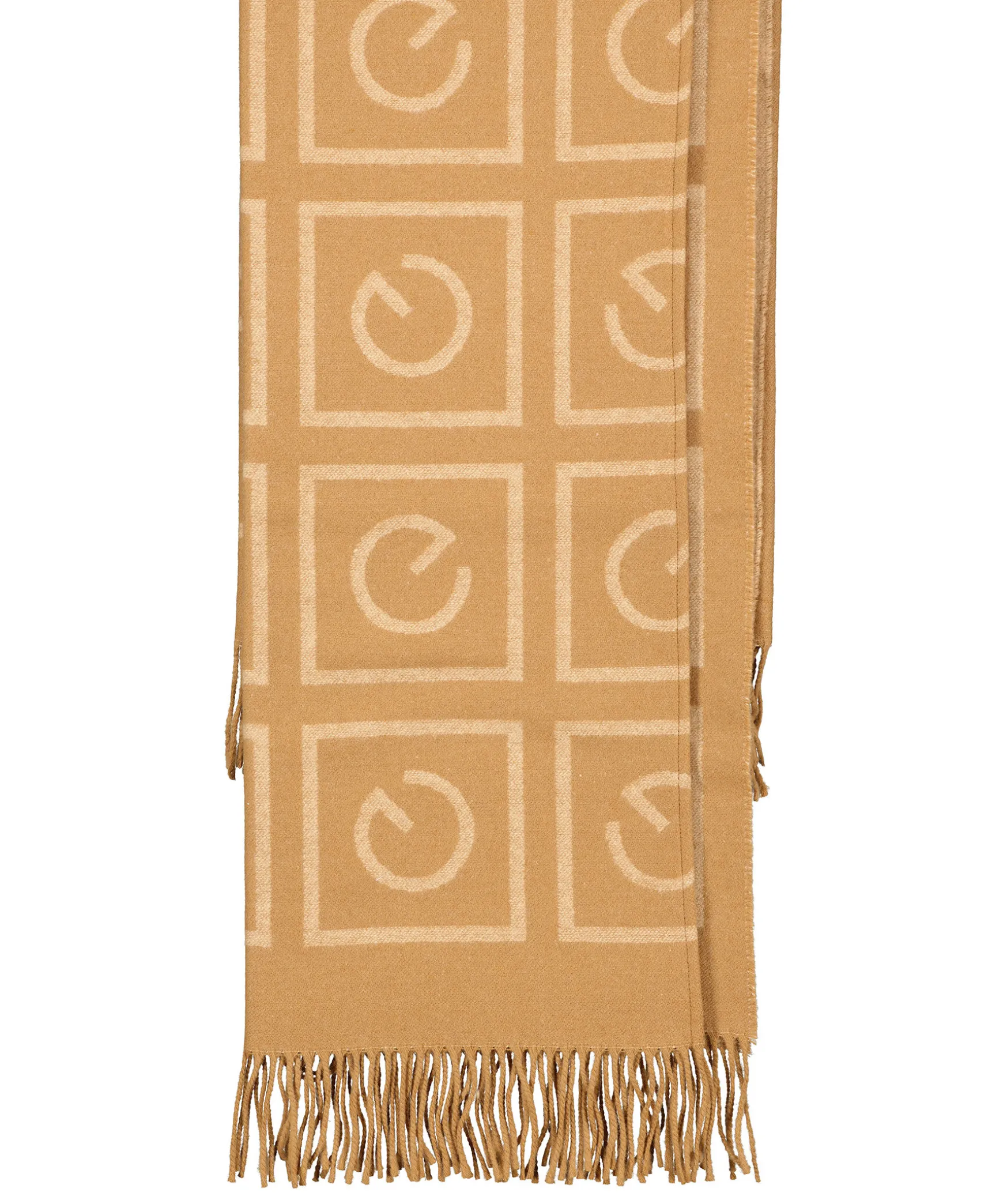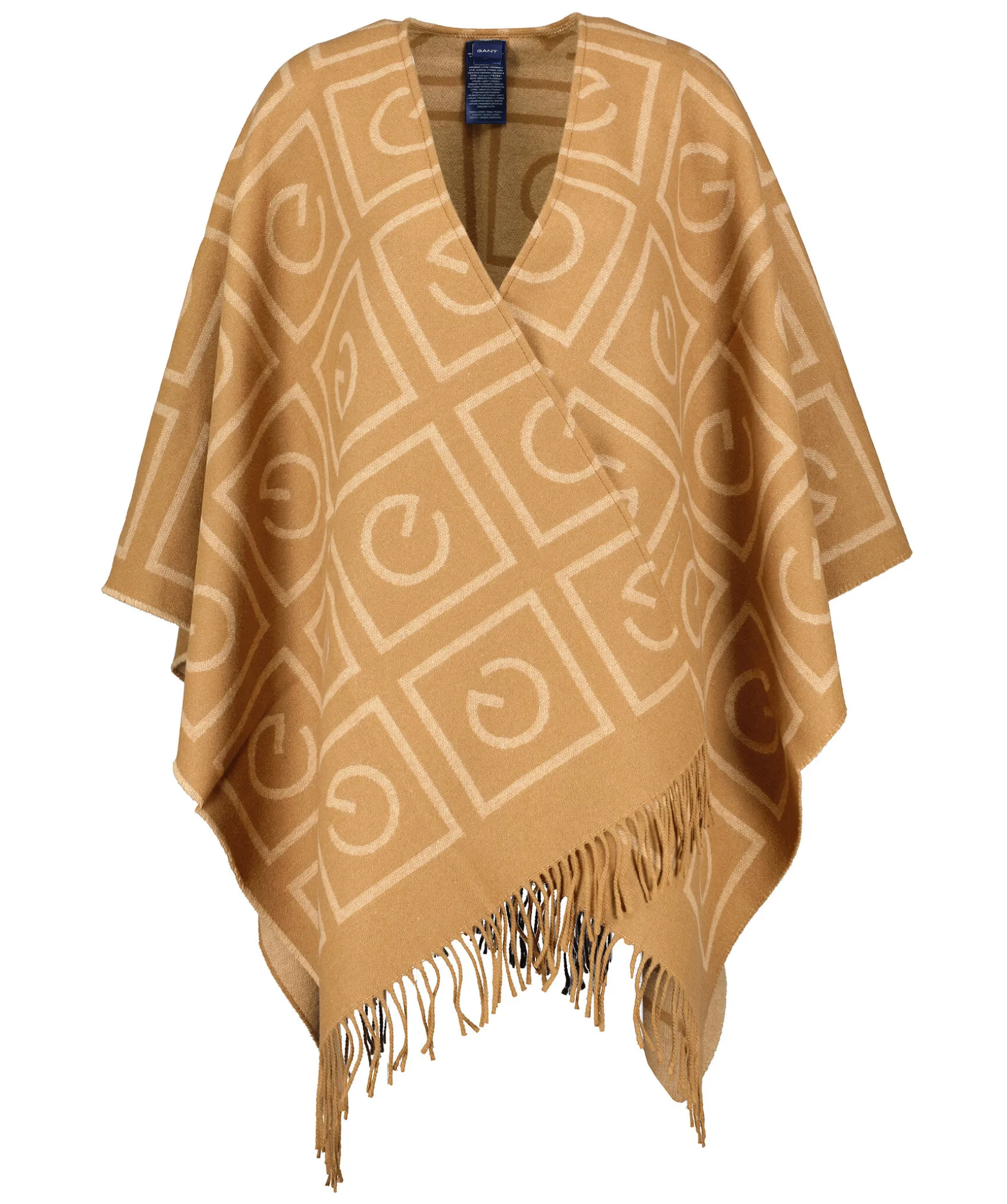 Kamelfargad Poncho Fran Gant I 100% Ull. Rutigt Monster Med Logotyper I Beige. Fransar I Kanterna Och Oppen Fram.
