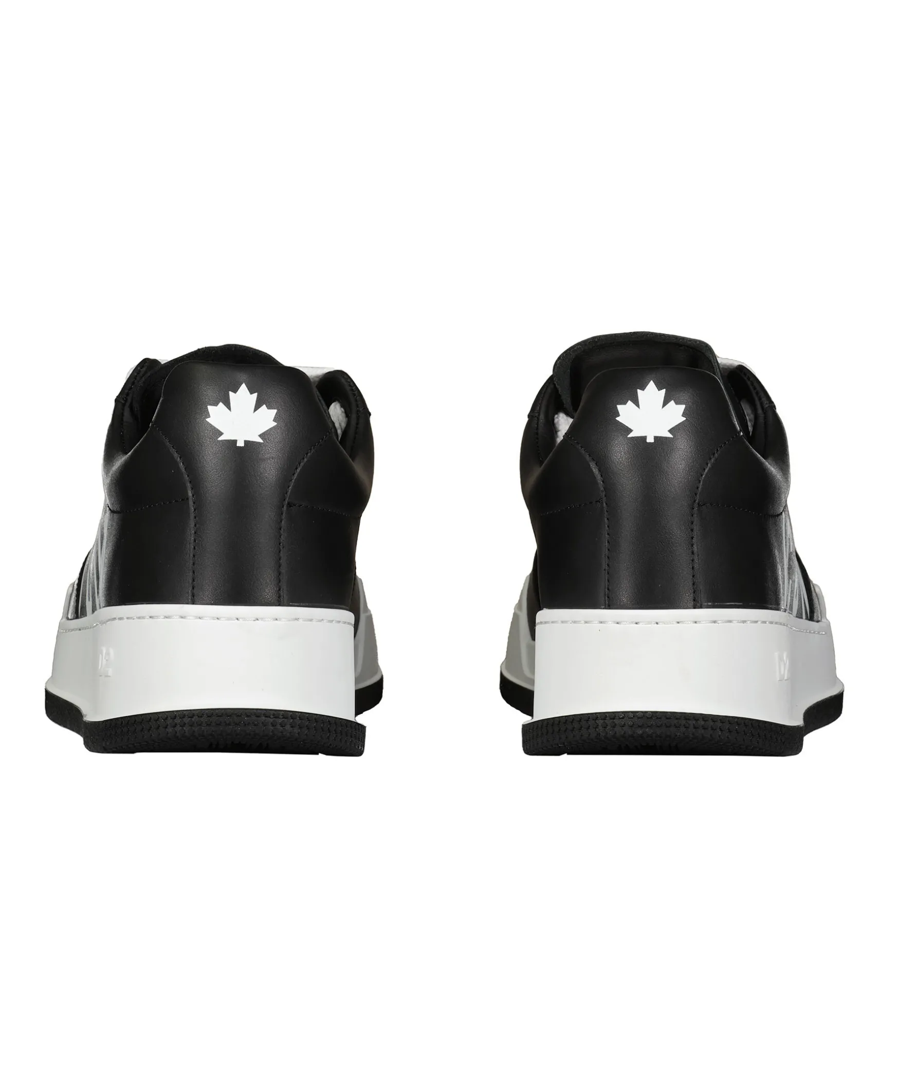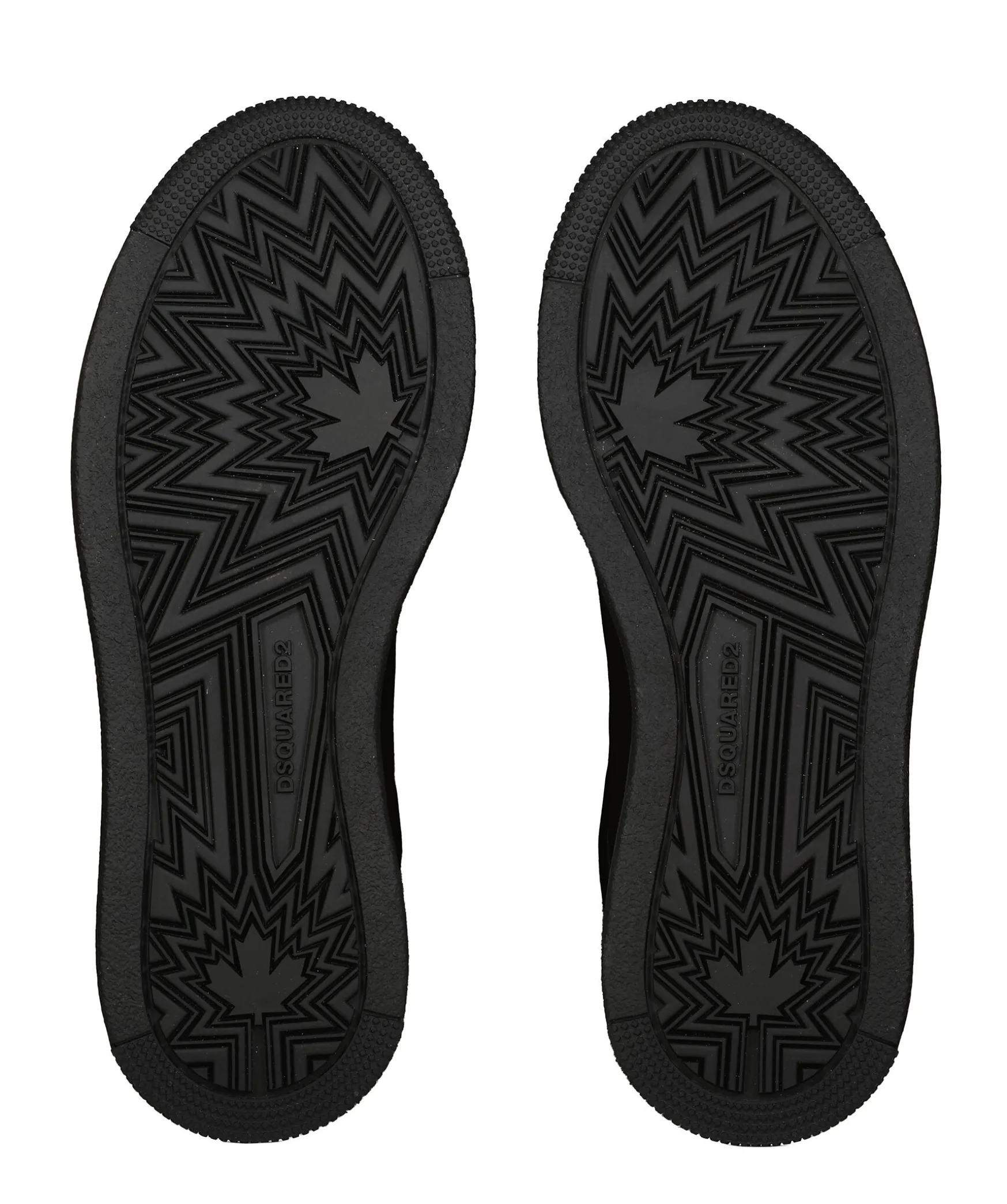 Svarta Sneakers Fran Dsquared2. Vit Nederdel Av Skon Med Liten Praglad ”D2” Logotyp, Svart Sula. Tryckt, Vit Logotyp Pa Skons Utsida Samt Pa Halen. Vita, Breda Och Platta Skosnoren.