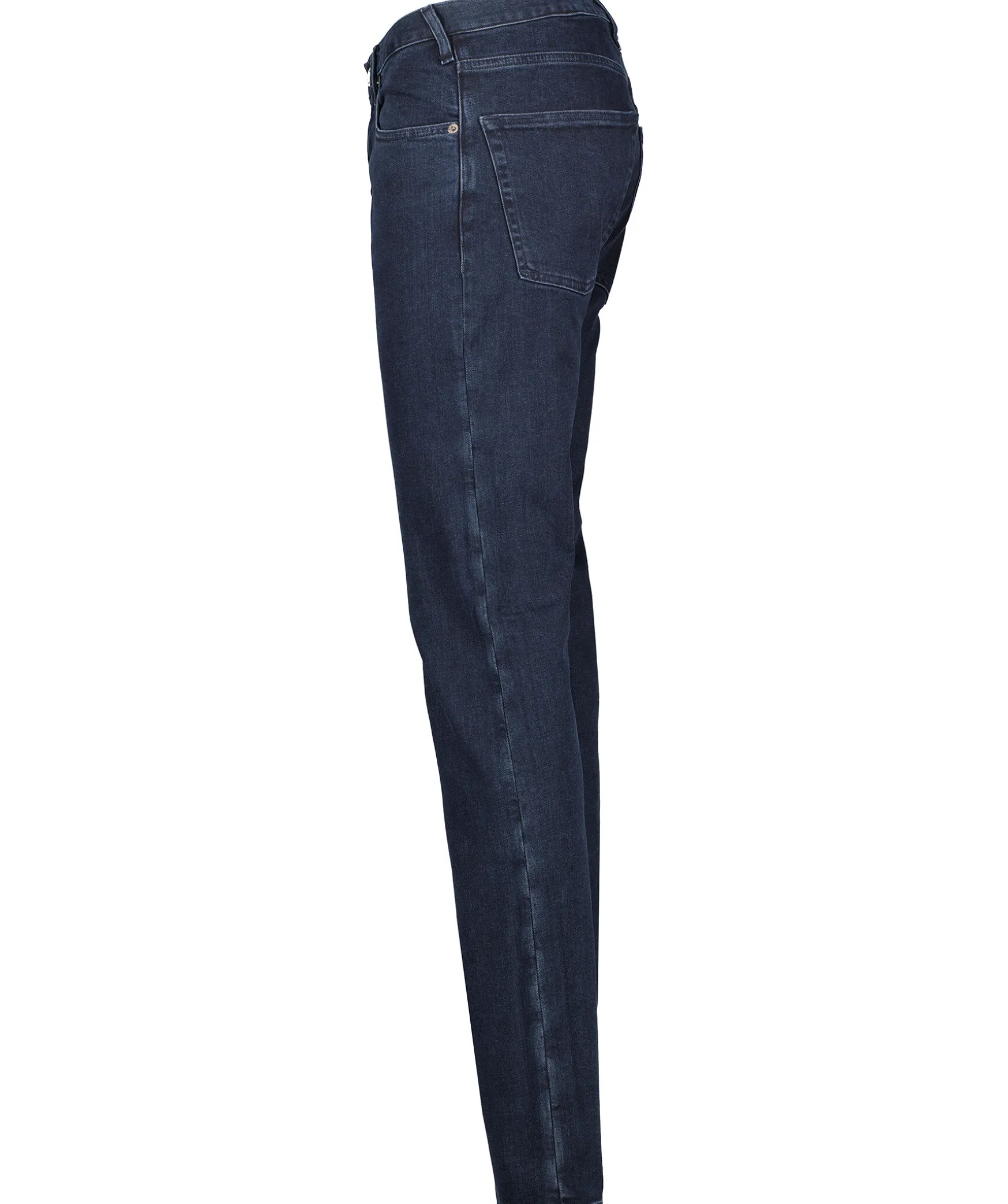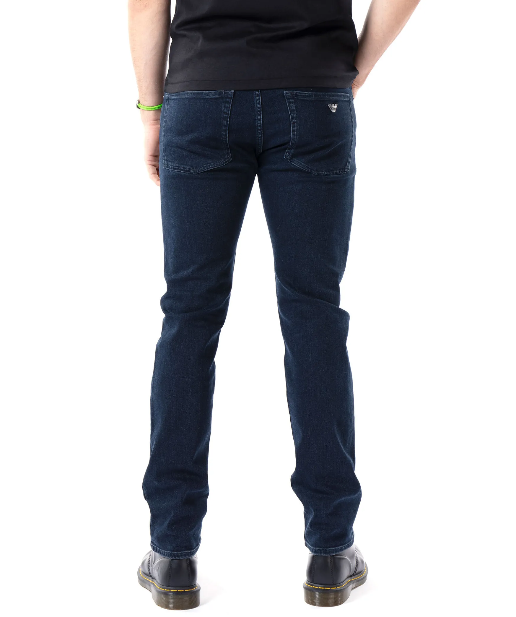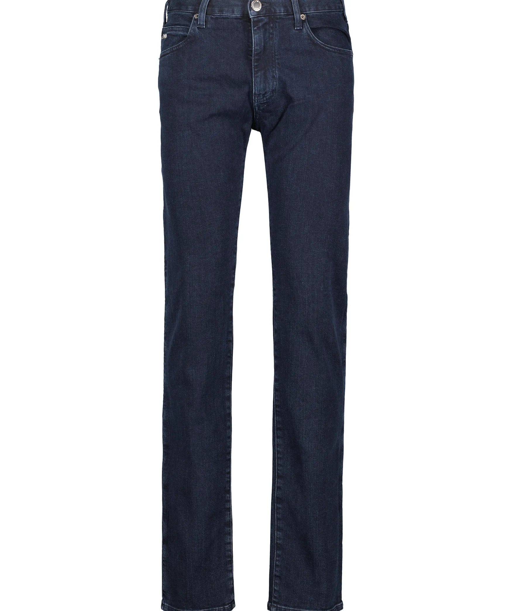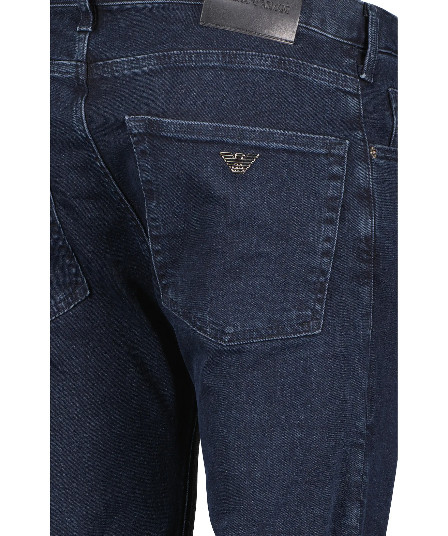 Morkbla, Jeans Med Stretch Fran Emporio Armani. Femficksmodell, Logotyp I Metall Pa Bakfickan, Liten Lapp Med Logotyp Pa Den Lilla Fickan Fram. Gylf Med Dold Dragkedja Och Knapp. Hallor For Balte.Modellen Ar 185Cm Lang Och Har Pa Sig Storlek 32′.