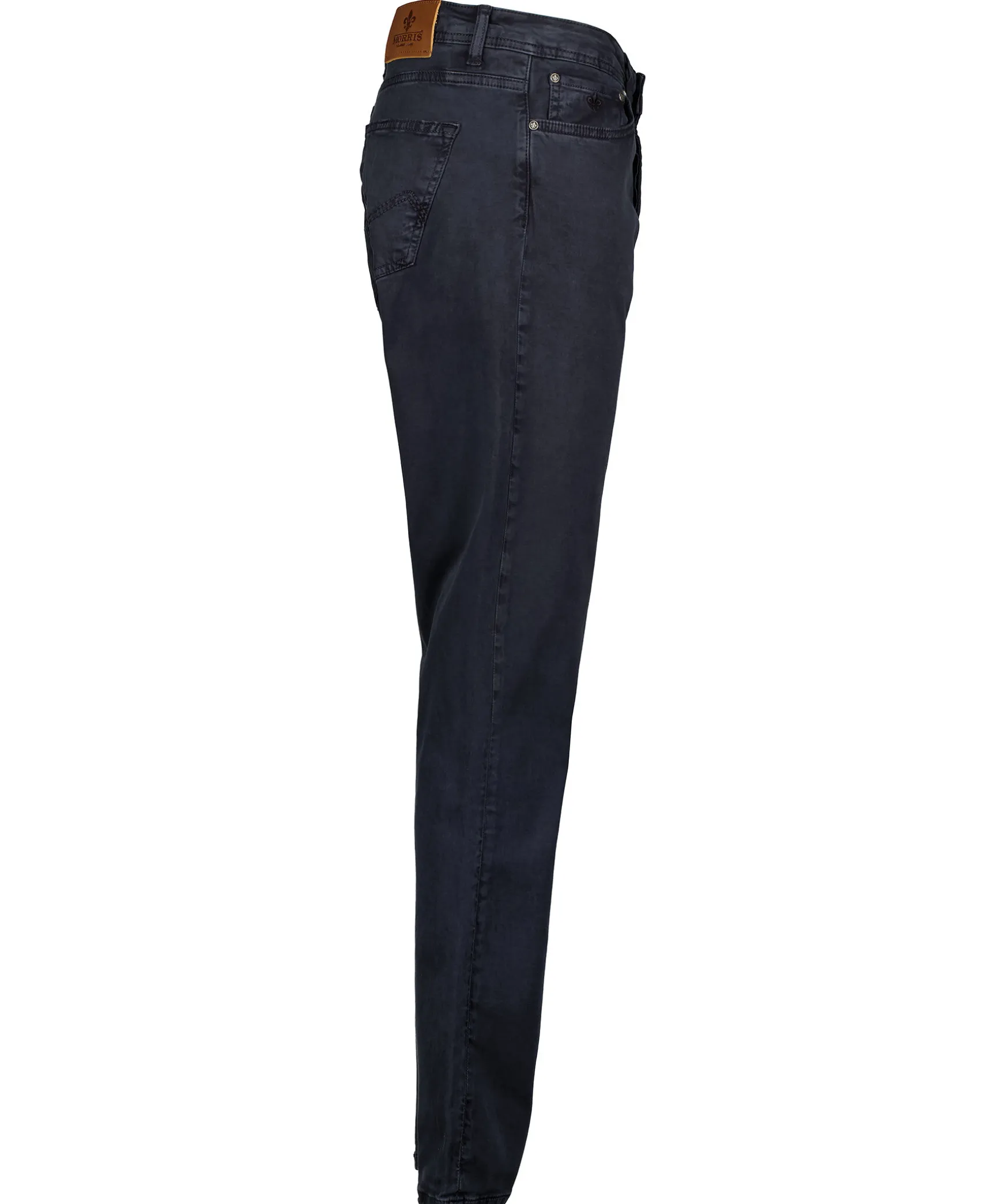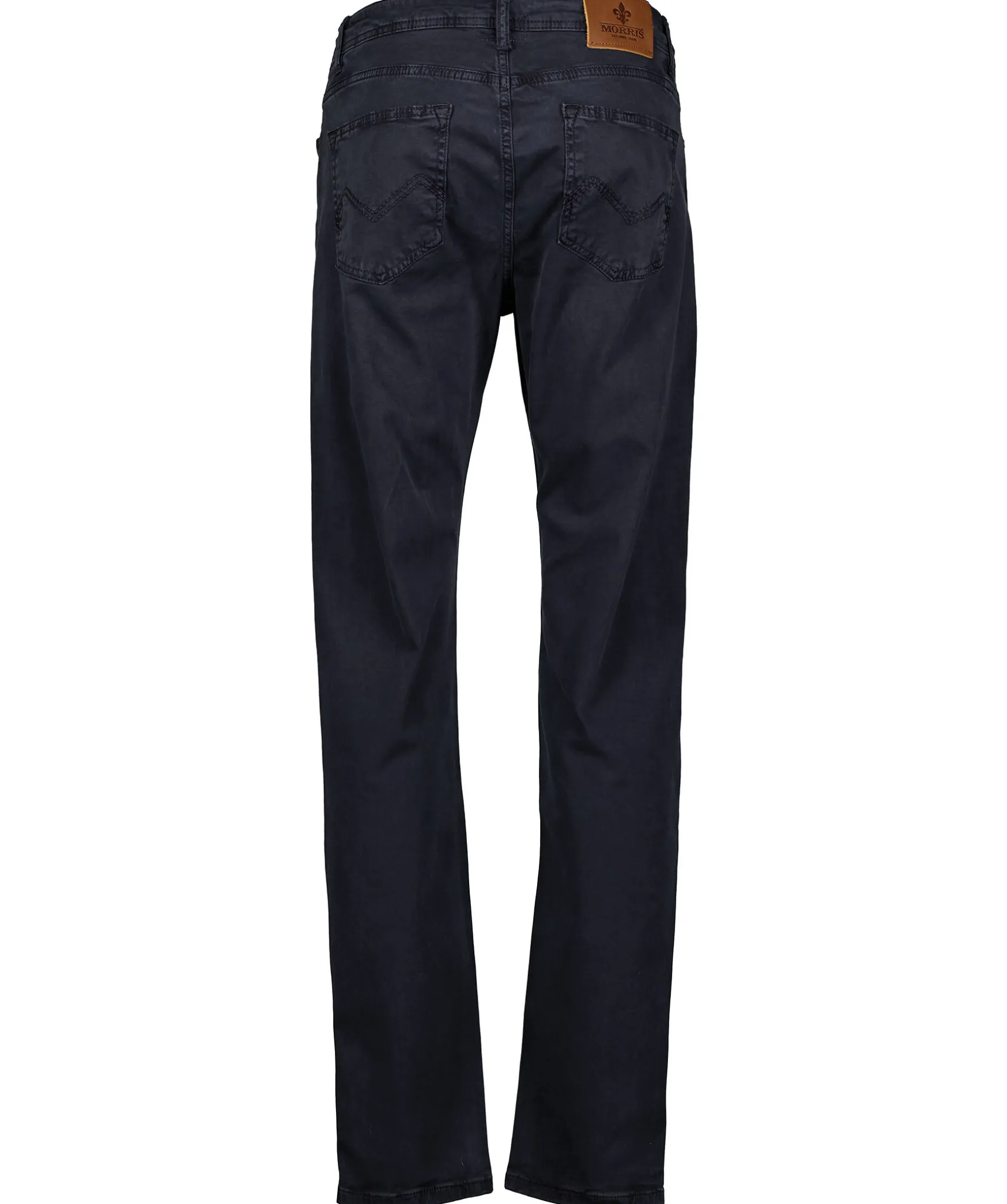 Blaa Jeans Fran Morris. Broderad Logotyp Pa Myntfickan, Fem-Ficksmodell, Slim Fit Modell Med Nagot Vidare Benslut Samt Etikett I Lader Baktill.
