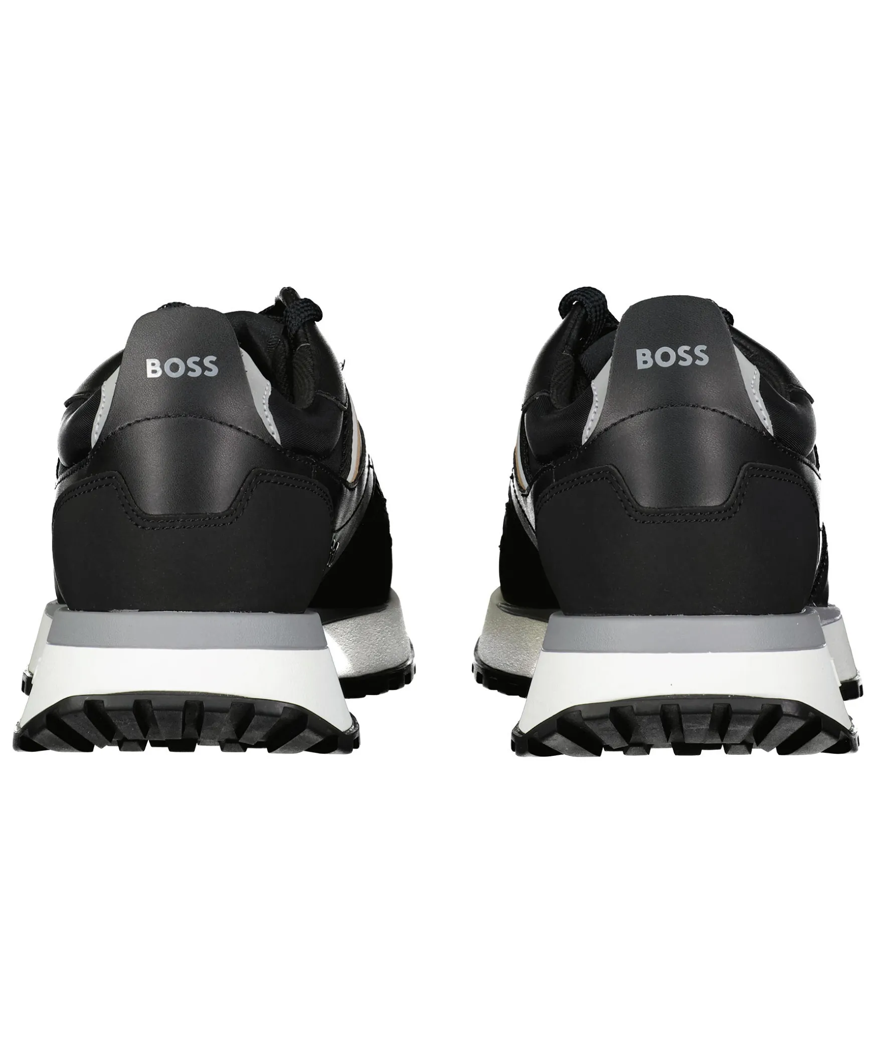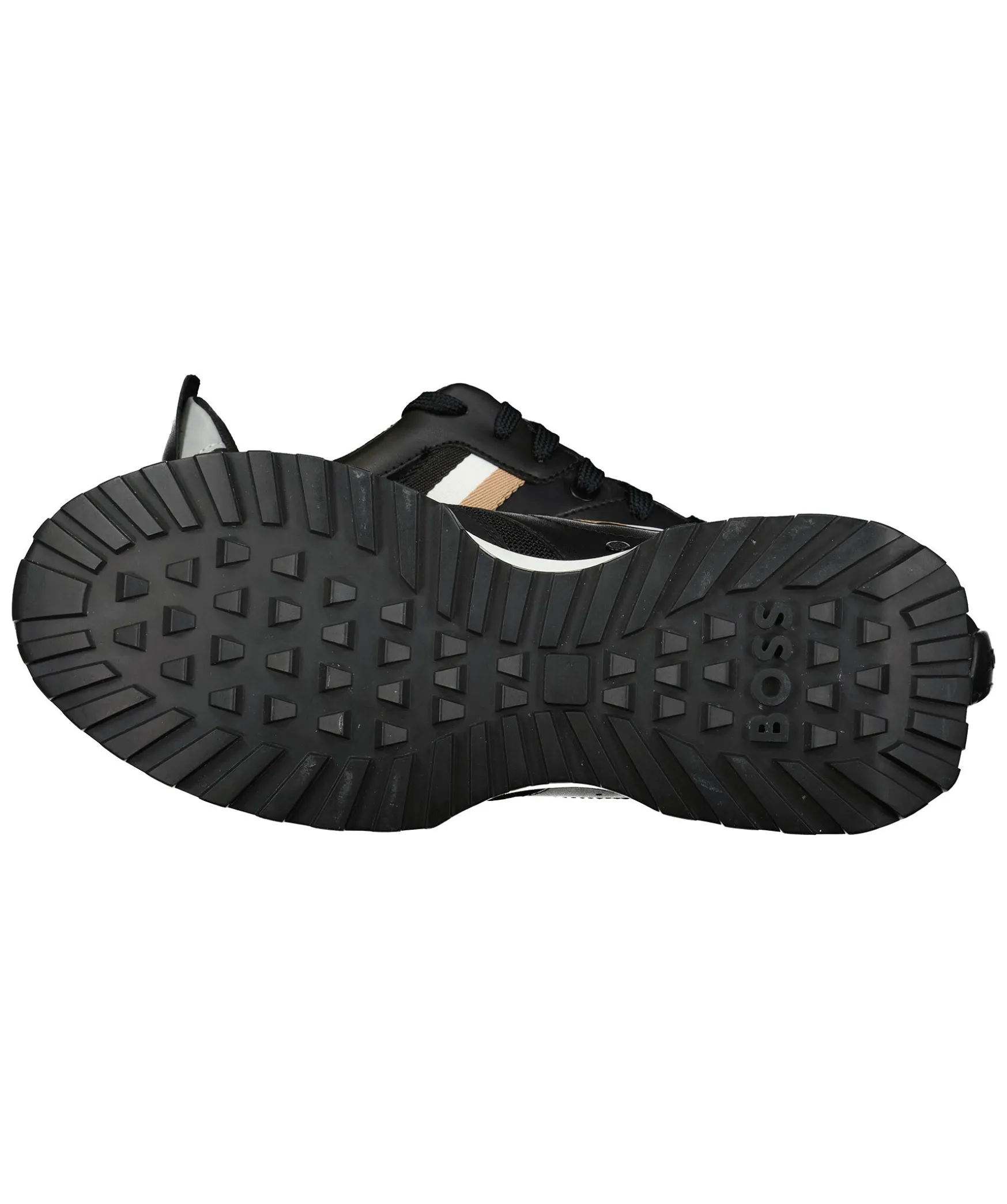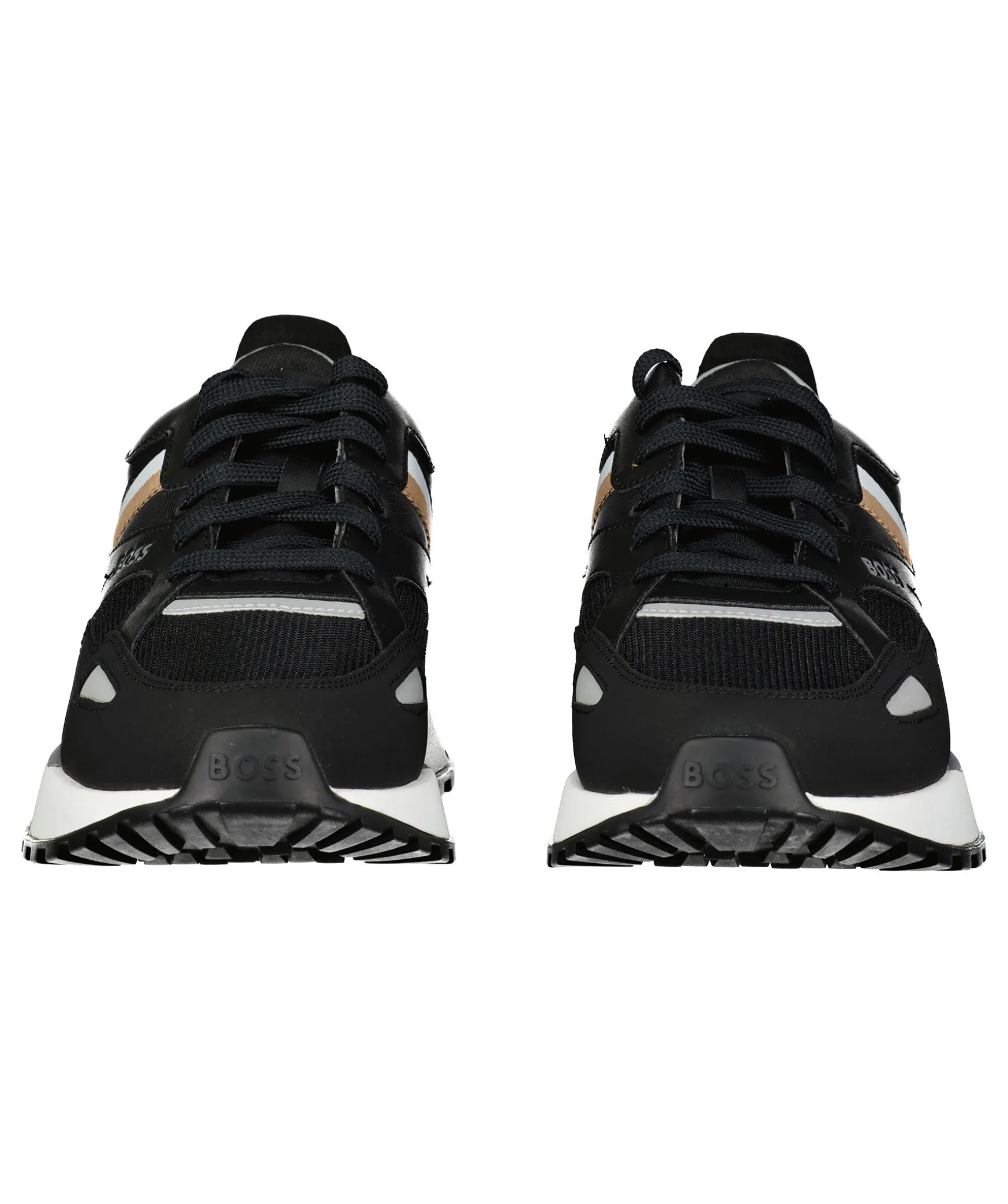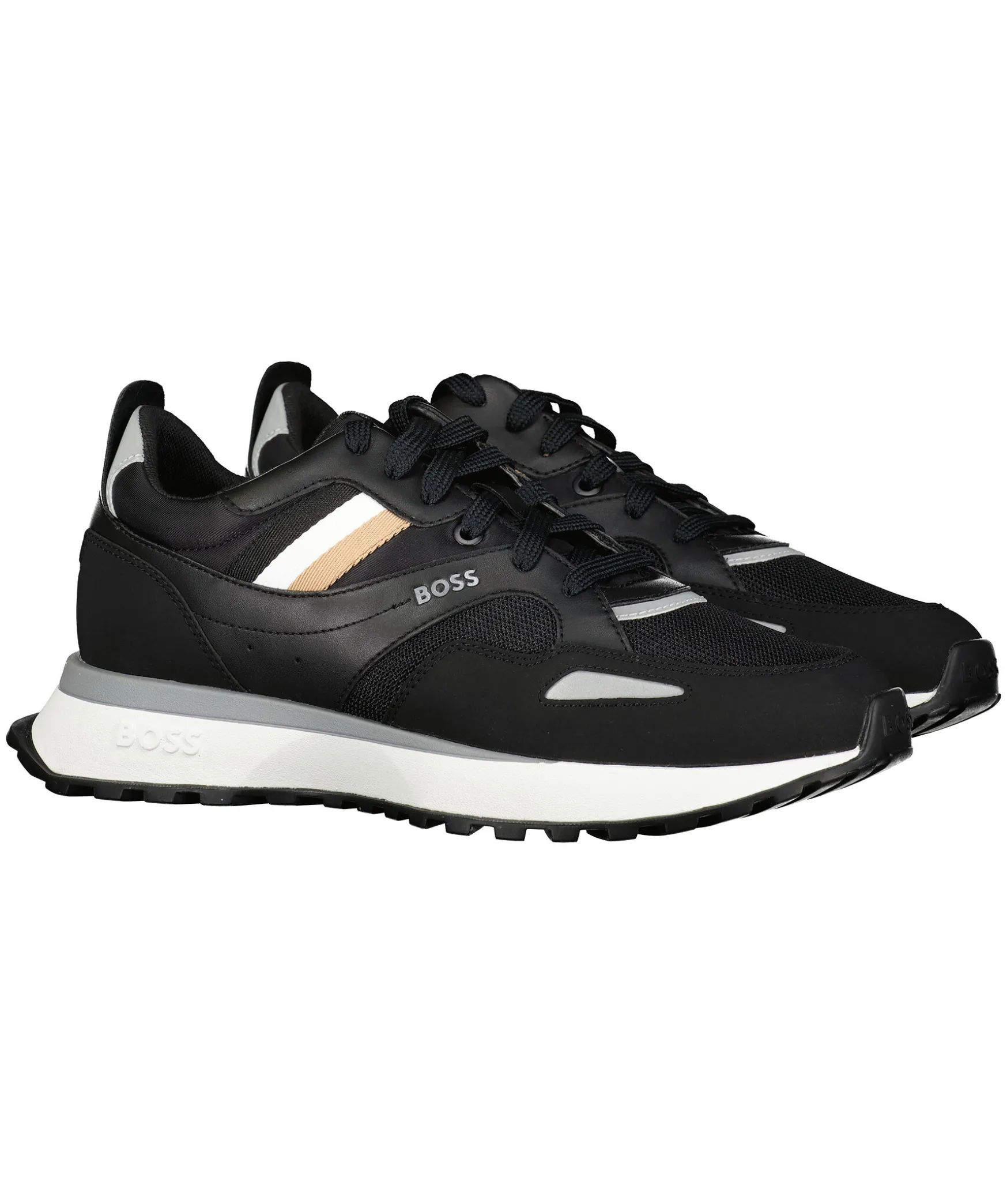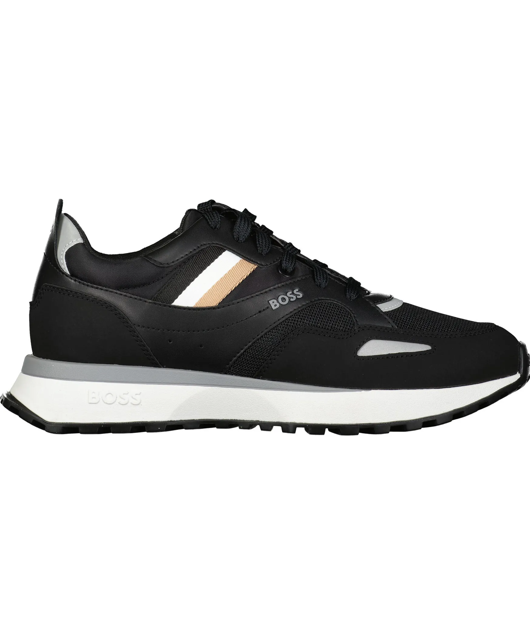 Svarta Sneakers Fran Boss Green. Reflexdetaljer Fram Och Bak, Svart/Vit/Beige Detalj Vid Sidan Och Svart Snorning Framtill. Tillverkade I Textil, Gummi Och Regenererat Lader.
