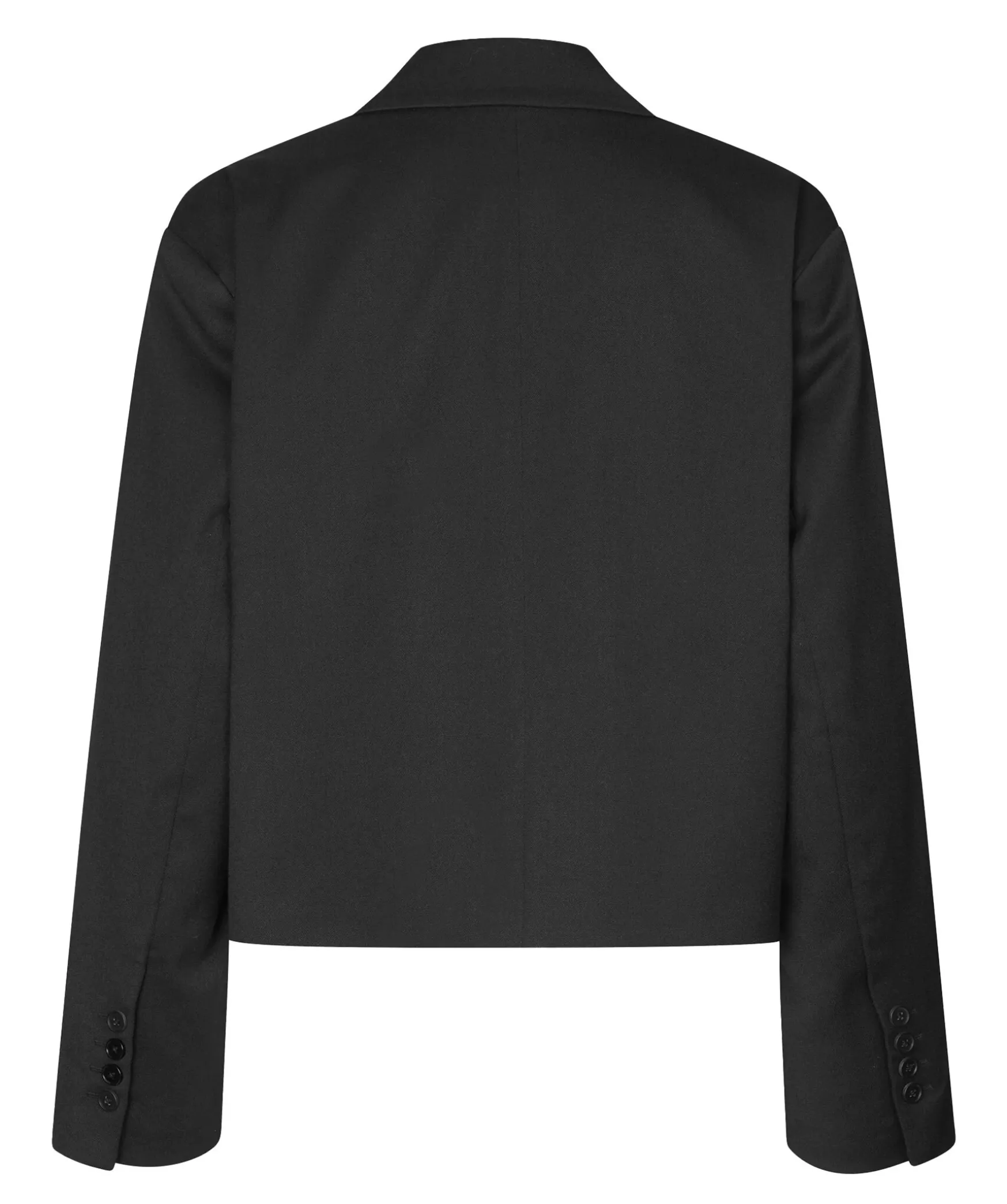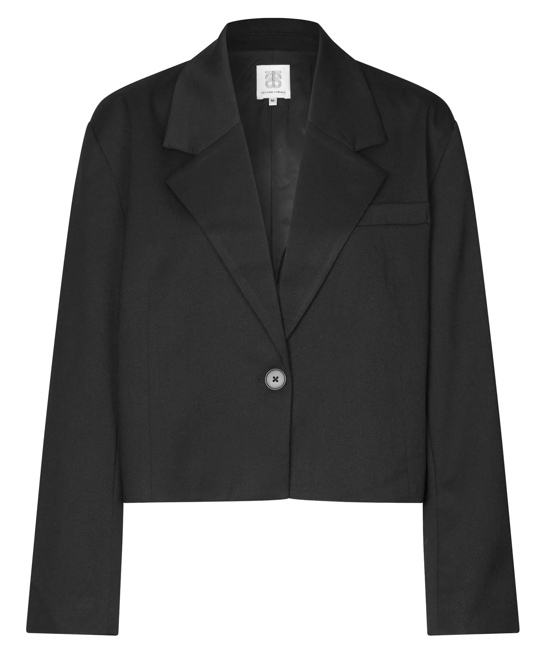 Svart Enkelknappt Kavaj I Cropad Modell Fran Second Female. Brostficka Pa Vanster Sida. Stora Slag. Armslut Med Fyra Knappar. Vadderade Axlar Med Langa Armar.