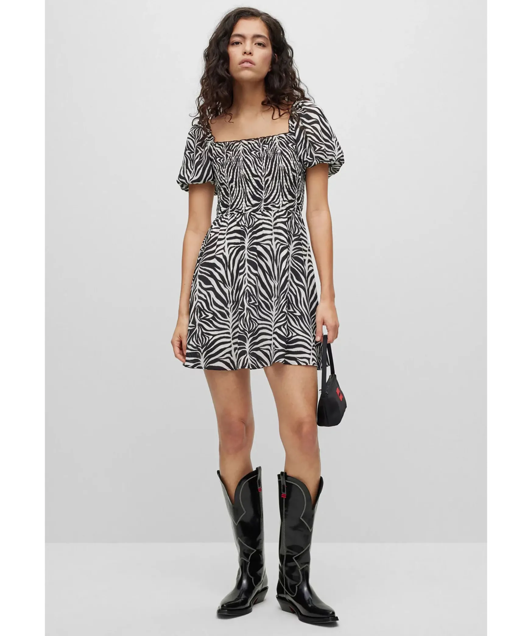 Svart Och Vit Zebra Monstrad Klanning Fran Hugo. Klanningen Har Korta Puffarmar, Och Liv I Smock Samt Knyt Detalj I Ryggen. Klanningen Slutar Mitt Pa Laret