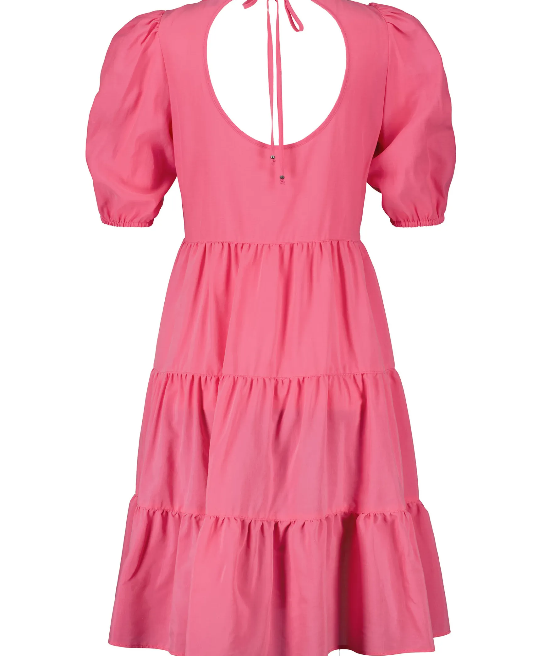 Rosa Klanning Fran Hugo. Kjol Med Volanger. Korta Puffarmar. Oppen Rygg Med Knytning. Tillverkad I Bomullsblandning. Klanningen Slutar Strax Over Knana.
