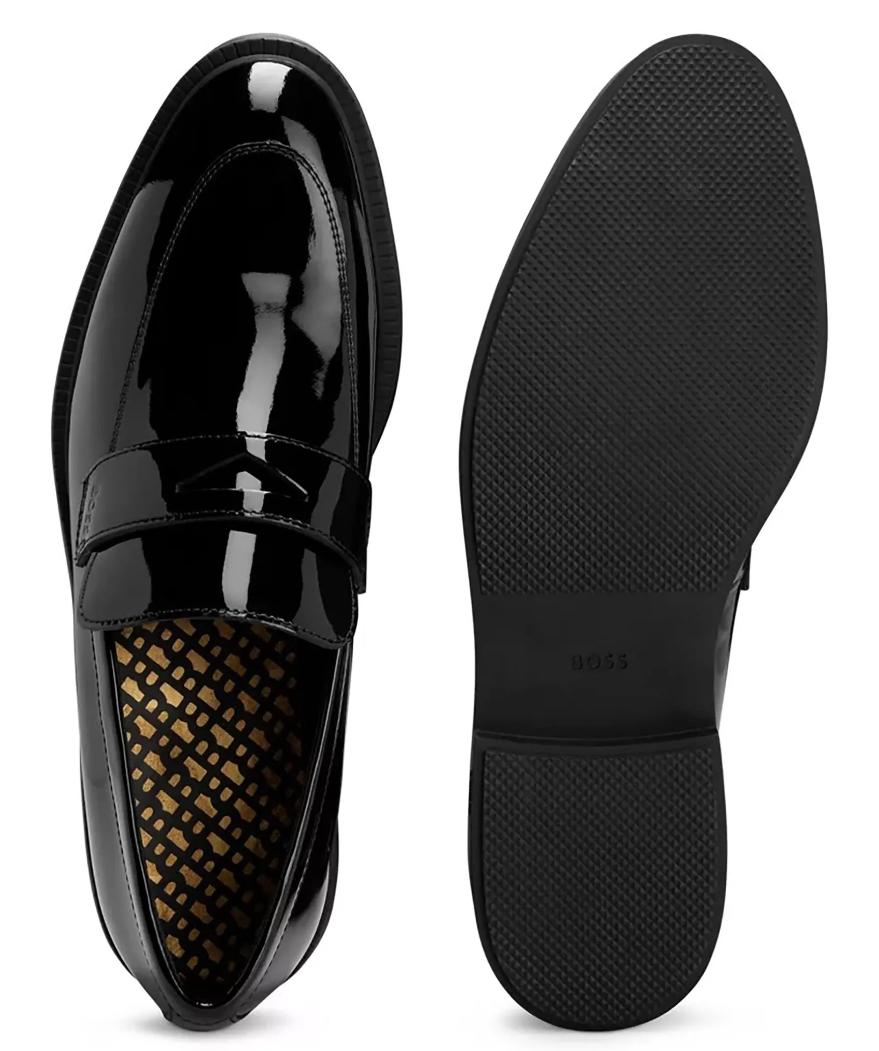 Svarta Glansiga Loafers Fran Boss Black. Tillverkad I Lader. Dekorativt Band Pa Ovansidan. Sula I Gummi. Praglad Logotyp Pa Sulan.