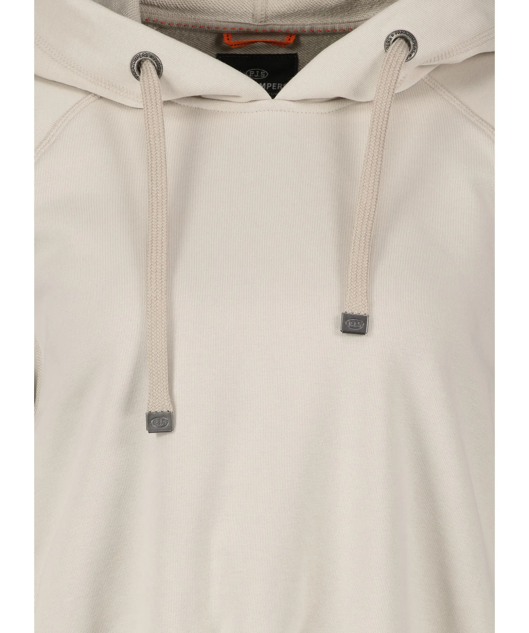 Sandfargad Huvtroja Fran Parajumpers. Tillverkad I Mjuk Bomullsblandning. Graa Revarer Langs Armarna Med Svart Logotyp. Patch-Logotyp Pa Vanster Arm. Snorning Vid Huvan. Croppad Modell.