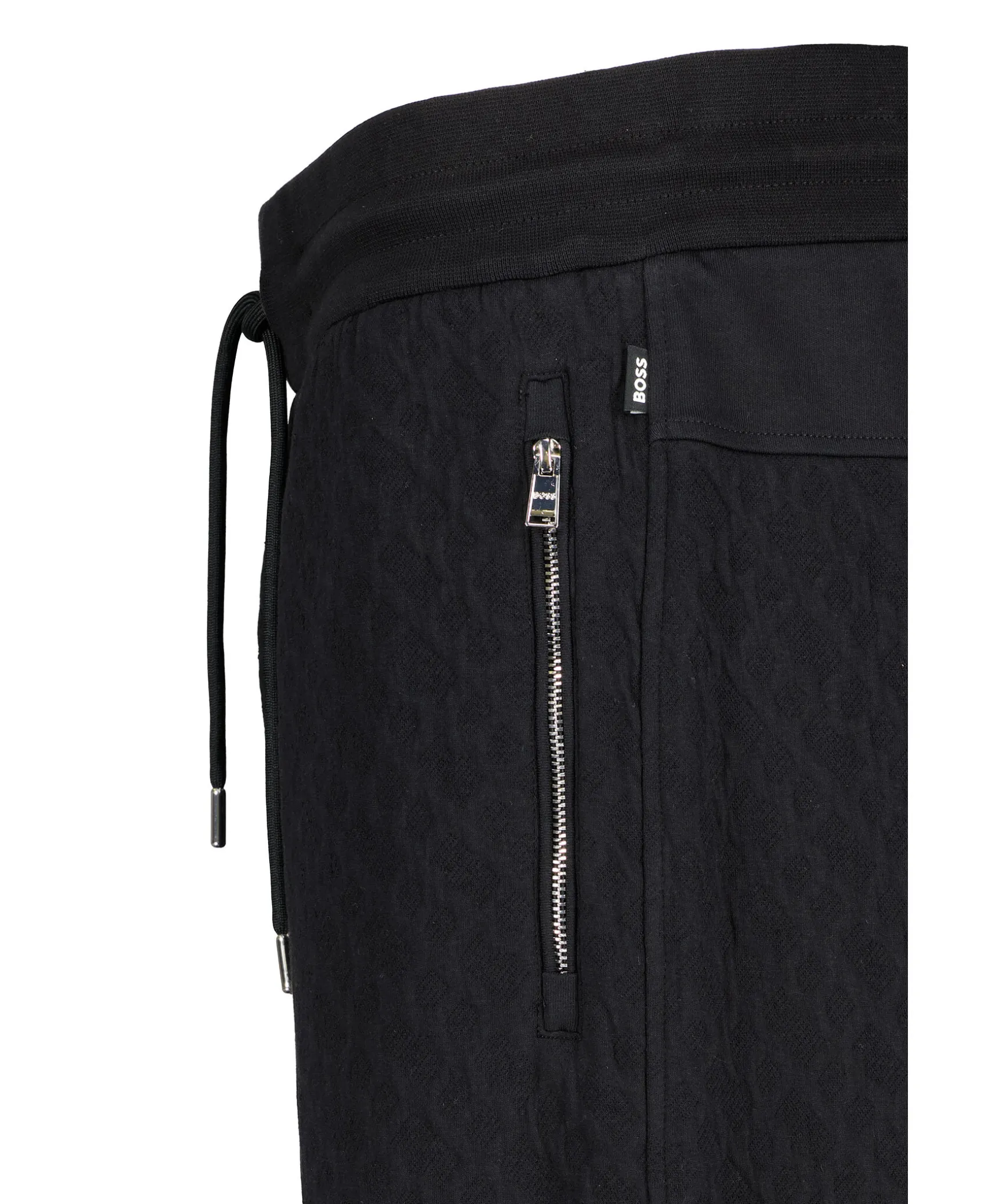 Svarta Mjukisbyxor Fran Boss Black Med Tonalt Monster. Tva Sidfickor Med Dragkedja, Snorning I Midjan Och Ribbstickade Muddar Vid Benslut. Tillverkade I En Bomullsblandning.