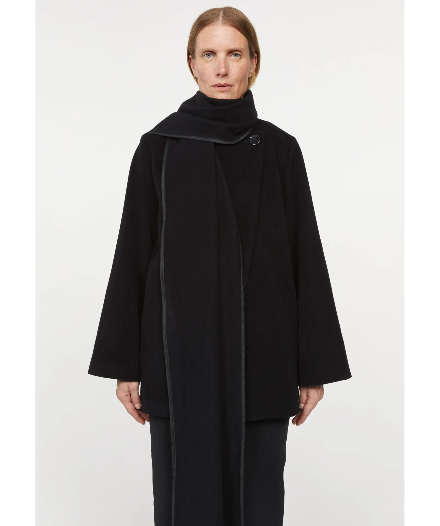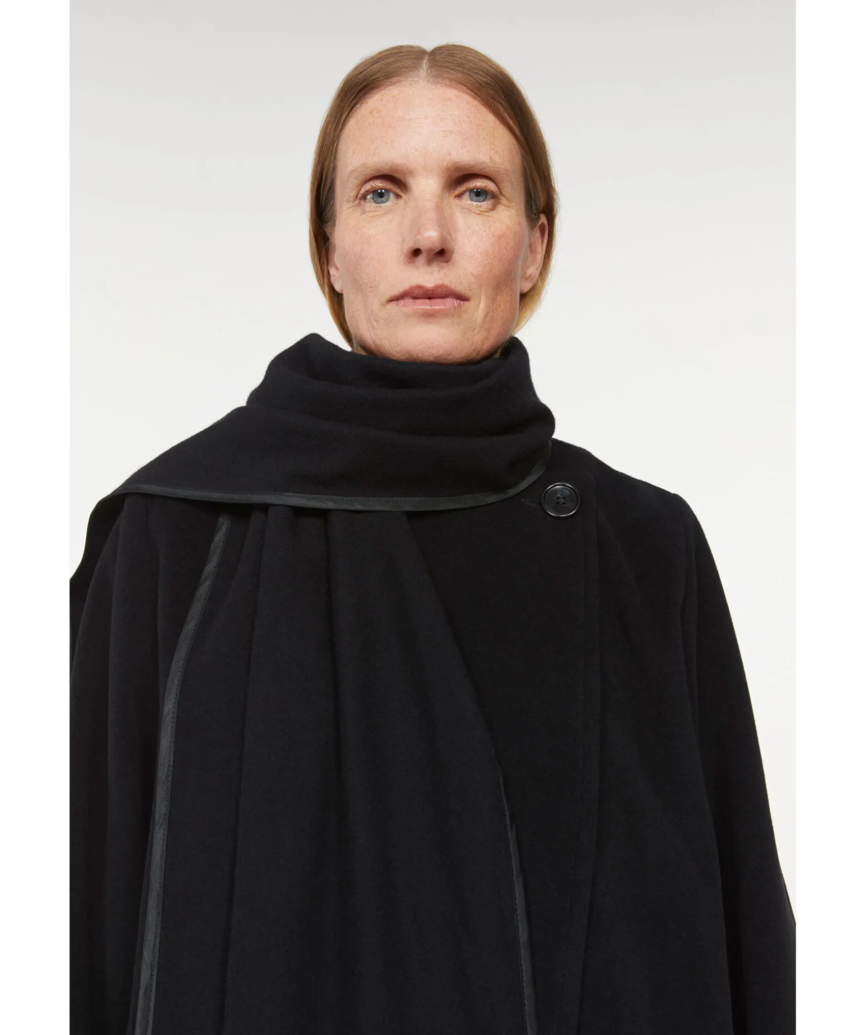 Svart Kort Kappa I Ullblandning Fran Rodebjer. Kappan Har En Inbyggd Scarf Som Haller Dig Extra Varm. Avslappnad Passform, Tva Framfickor Och Stangs Med Tva Knappar; En Vid Halsen Och Vid Plaggets Mitt. Modellen Ar 179Cm Lang Och Har Pa Sig Storlek S.