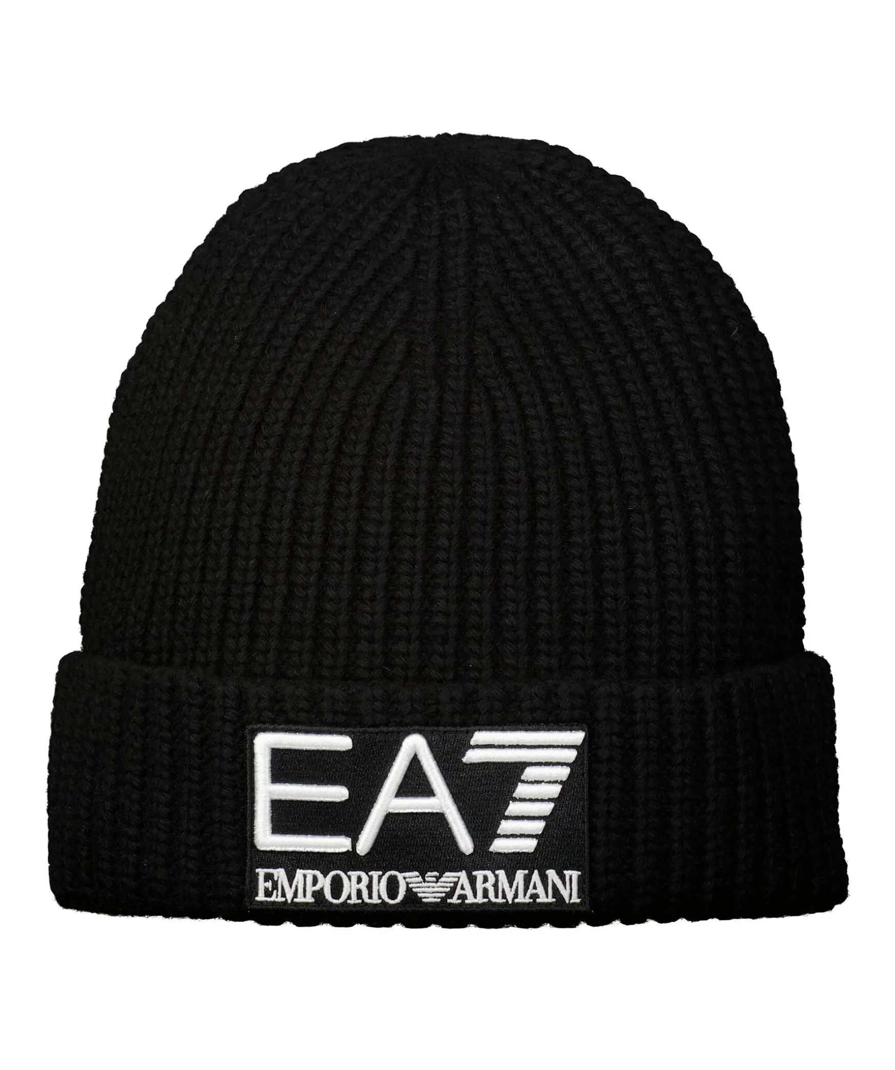 Svart, Ribbad Mossa Fran Armani Ea7. Broderad Patch Logotyp Pa Framsidan I Vitt. Tillverkad I En Ullblandning.