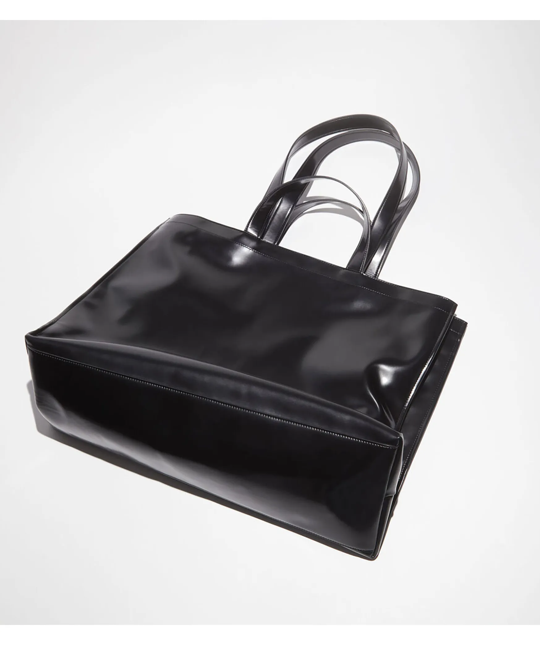 Svart Totebag Med Glansig Finish Fran Acne Studios. Stansad Logotyp Pa Framsidan. Huvudfacket Stangs Med Tryckknapp. Innerficka Som Stangs Med Dragkedja. Vaskans Matt: 47 Cm X 35 Cm X 17 Cm.