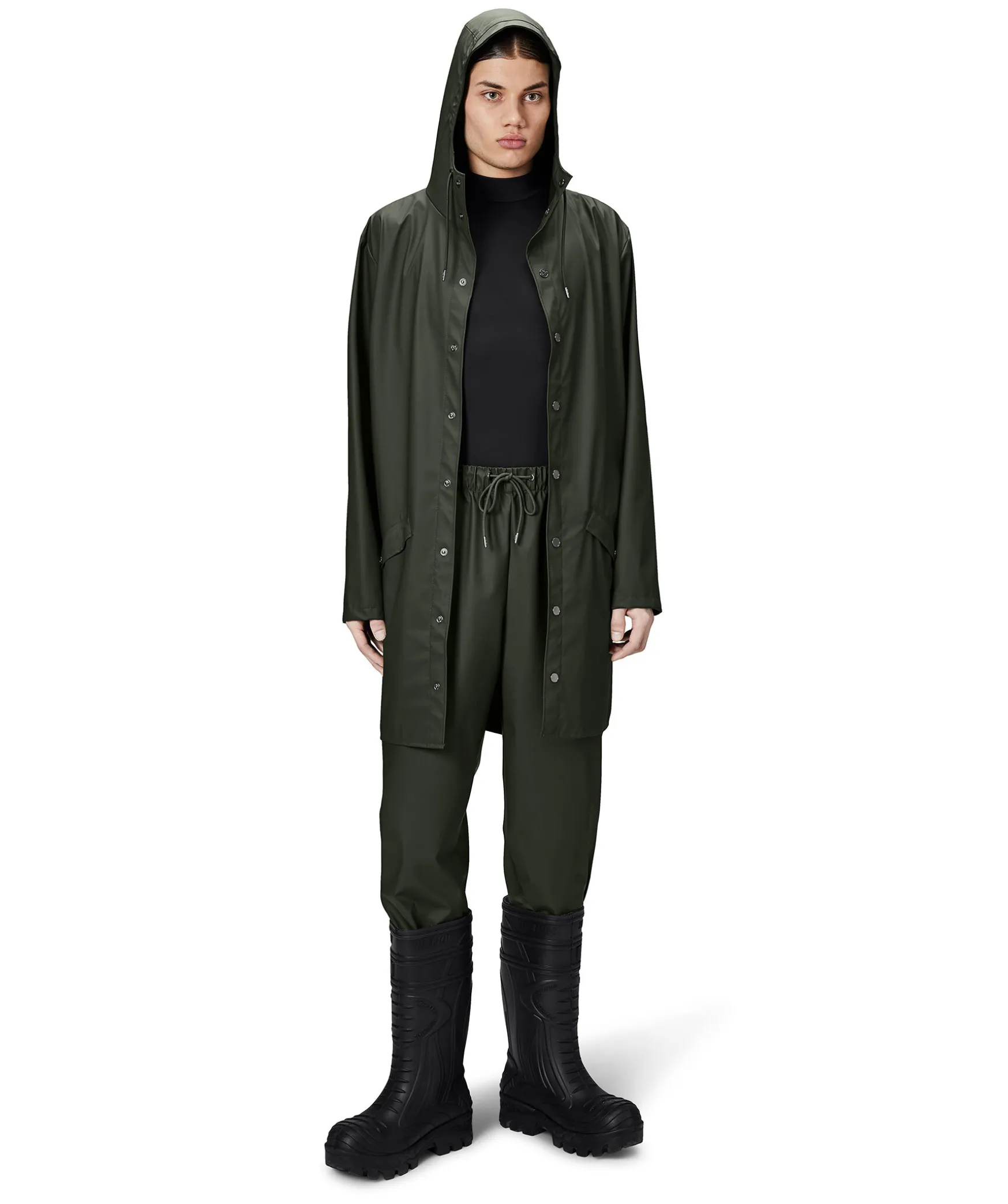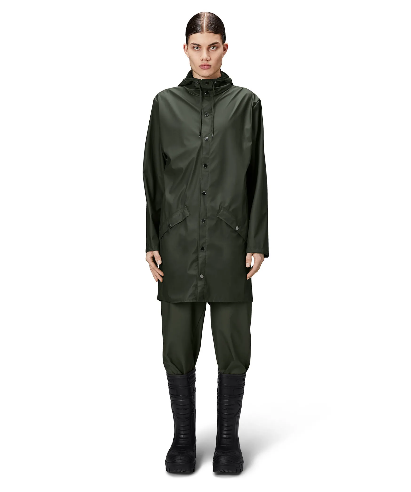 Gron Lang Regnjacka Fran Rains. Stangs Framtill Med Tryckknappar. Luva Med Dragsko. Snedstallda Fickor Som Stangs Med Tryckknappar.