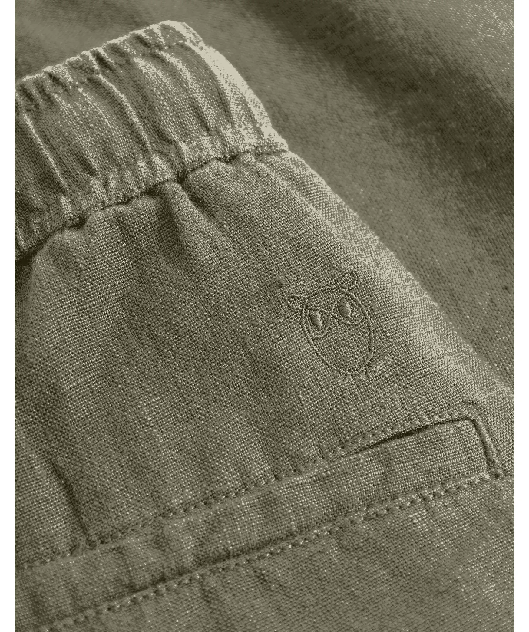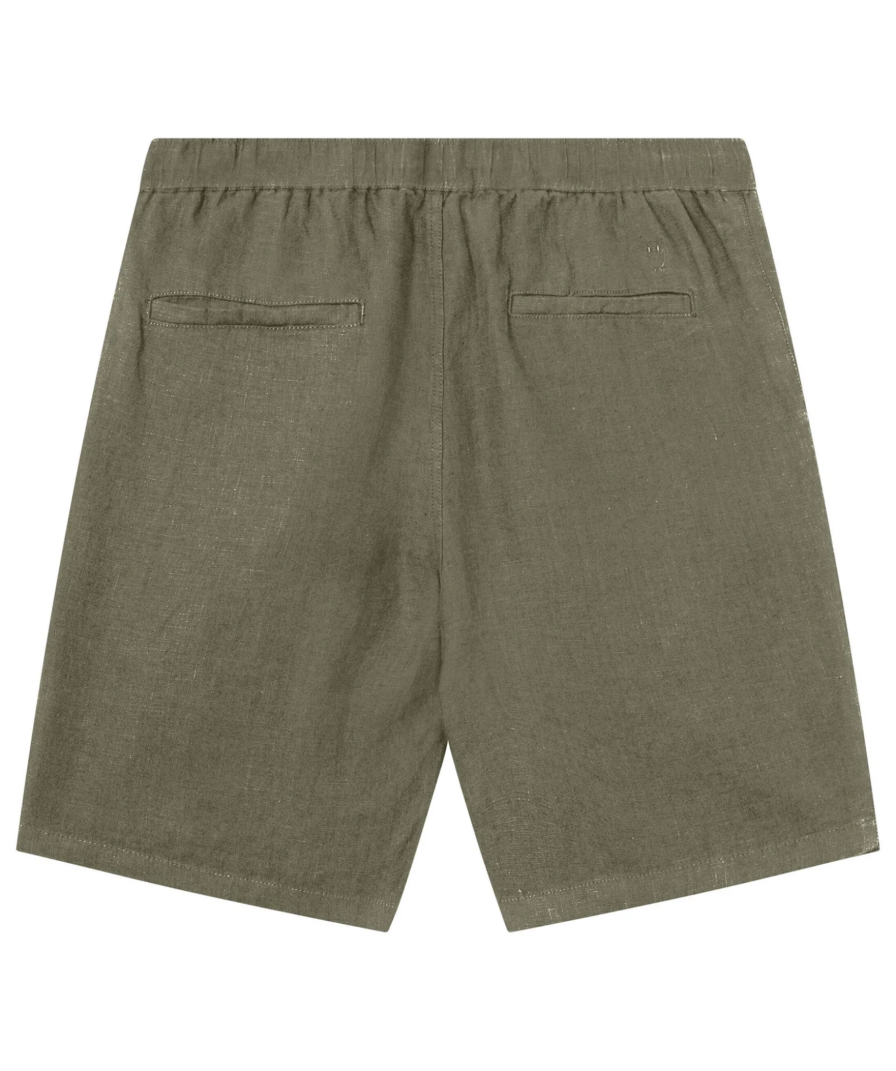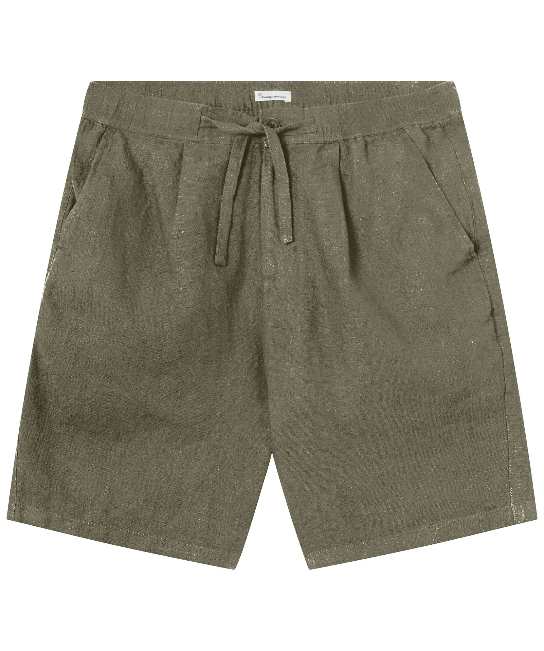 Olivgrona Linneshorts Fran Knowledge Cotton. Tillverkad I 100% Ekologisk Linne. Rak Passform Med Elastisk Midja Samt Snorning I Midjan. Tva Sidofickor Och Diskreta Bakfickor.