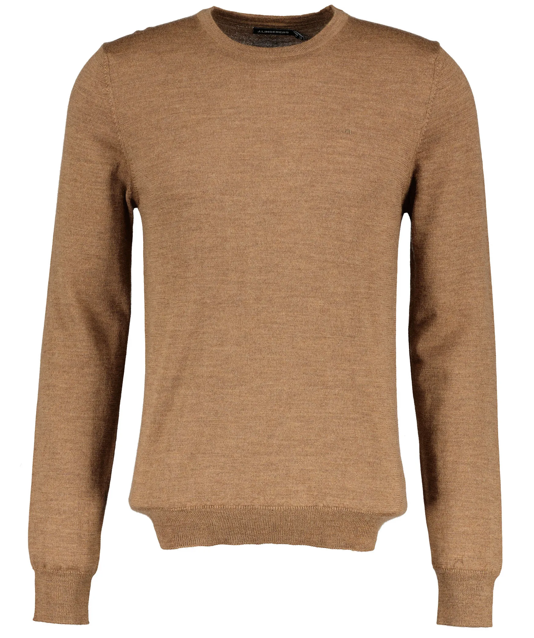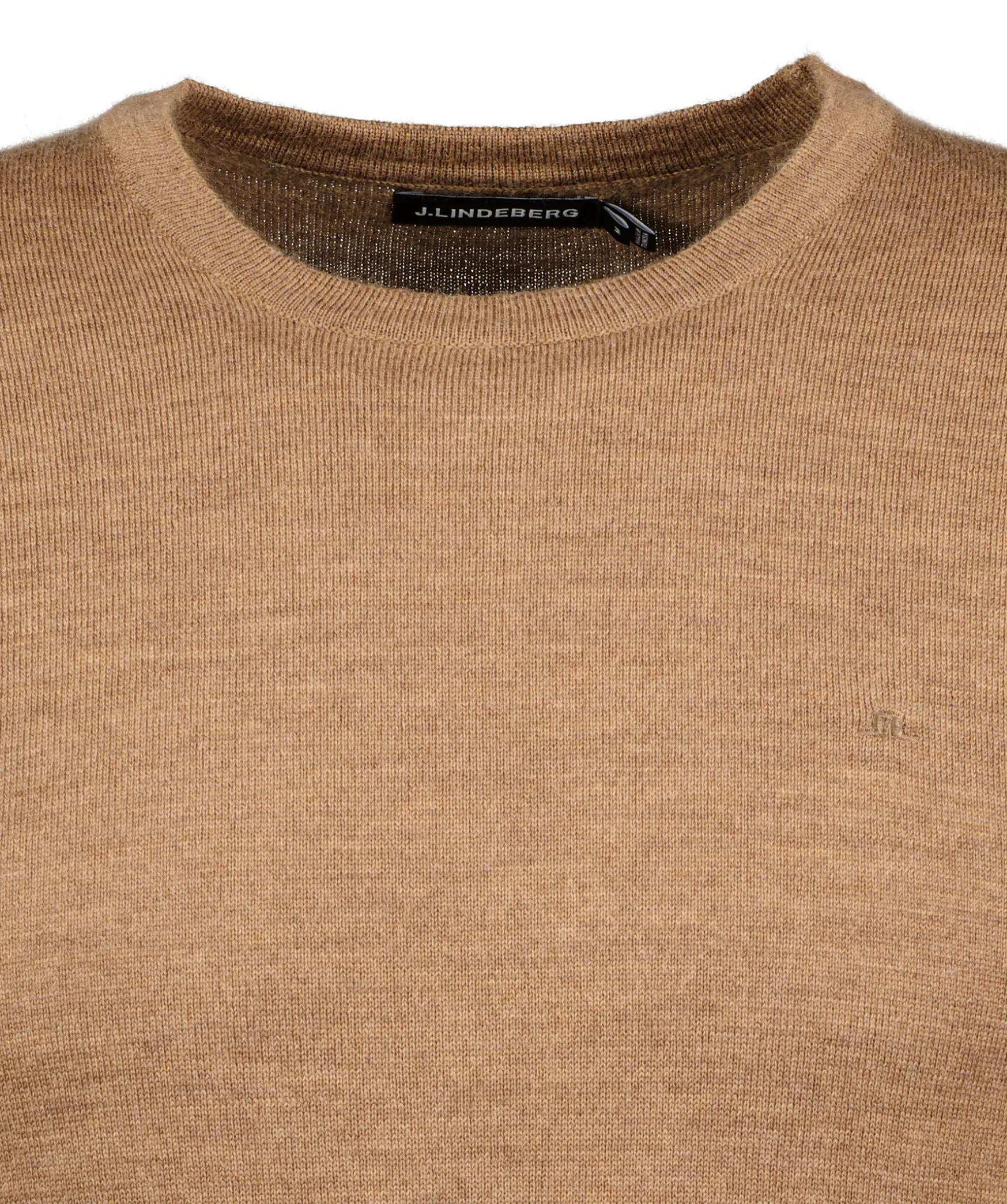 Kamelfargad Finstickad Crewneck Fran J Lindeberg. Tillverkad Av 100% Merinoull. Ribbstickad Halsringning Samt Muddar Vid Plagg Och Armslut. Liten Ton-I-Ton Logotyp Pa Brostet.