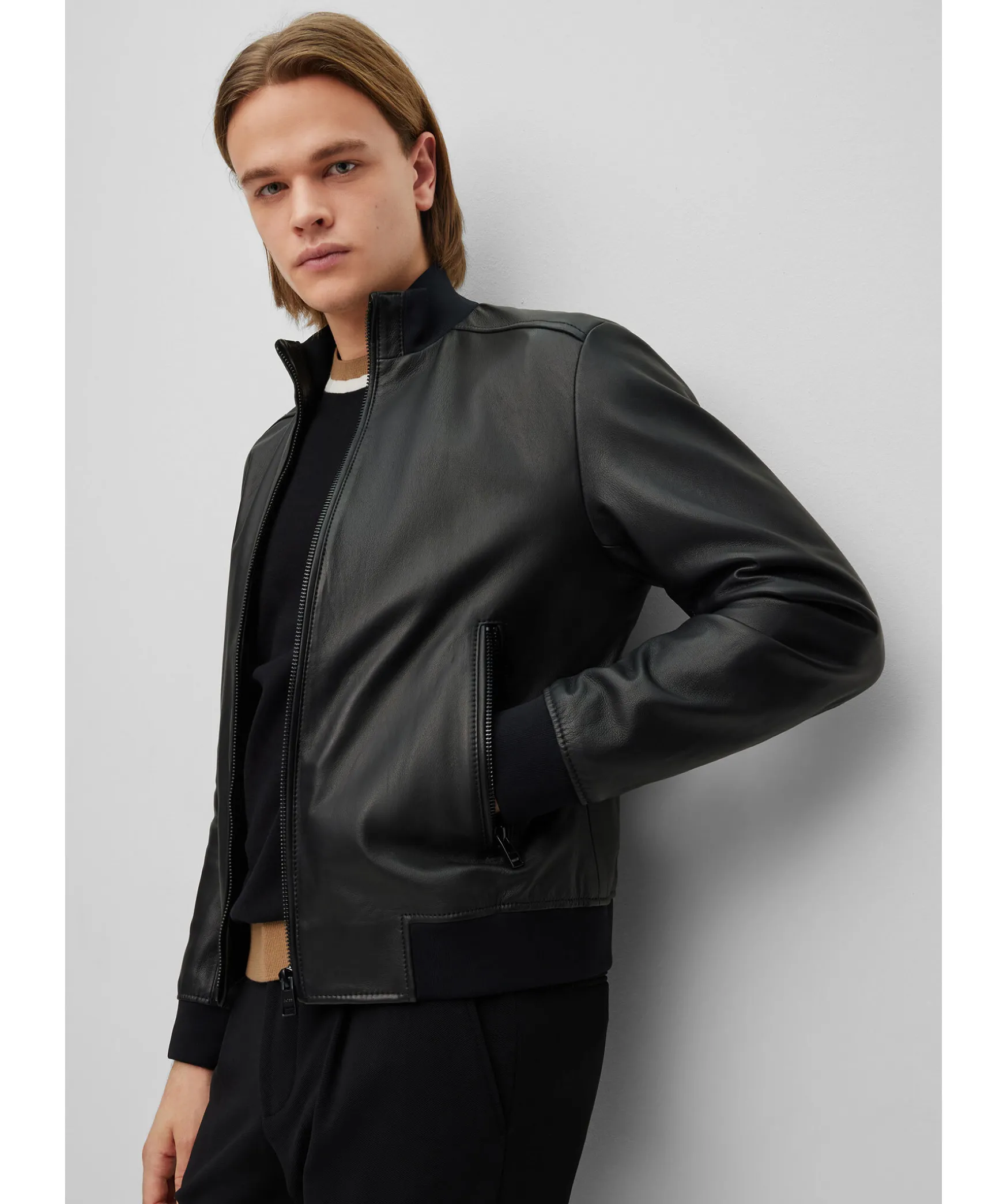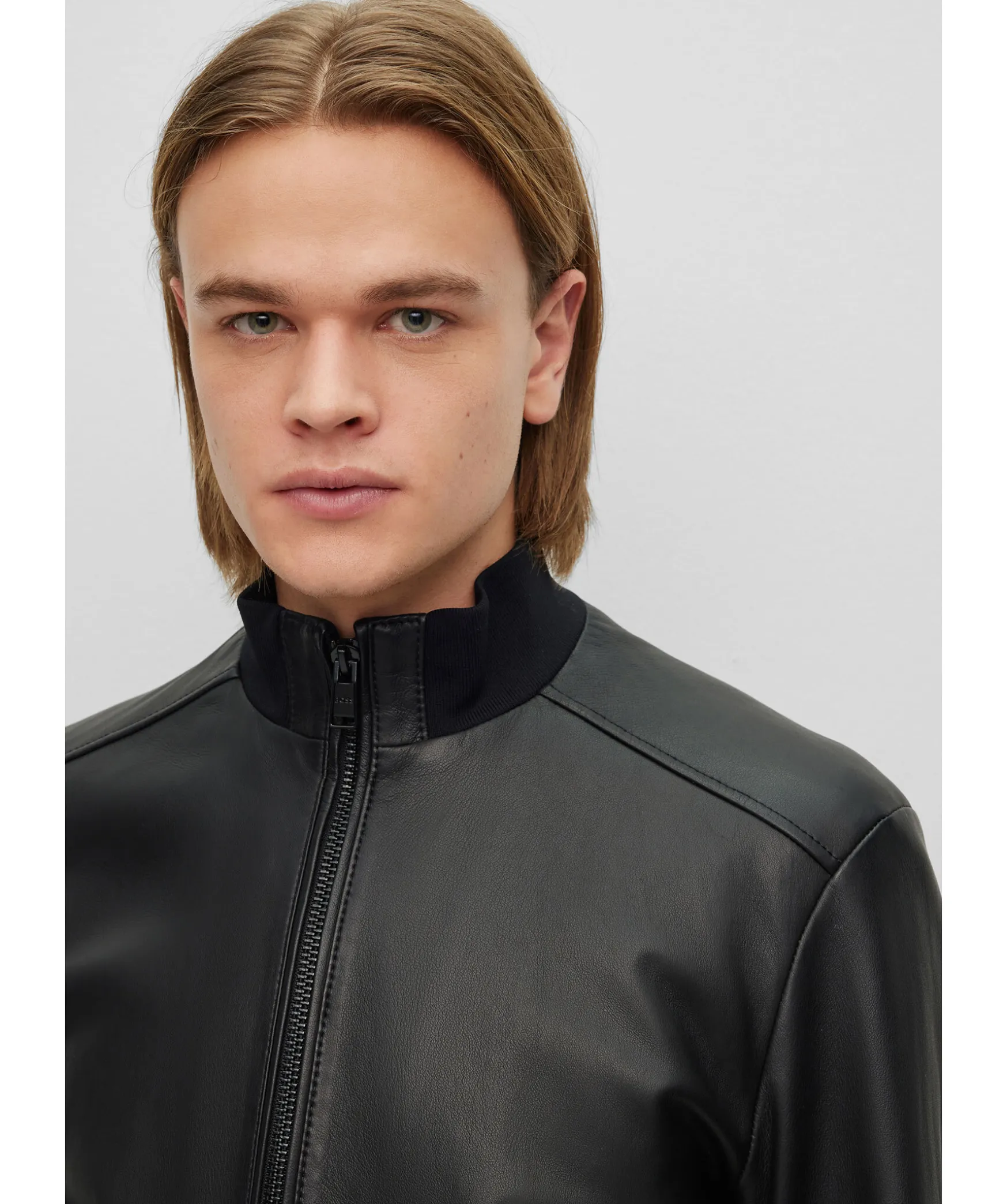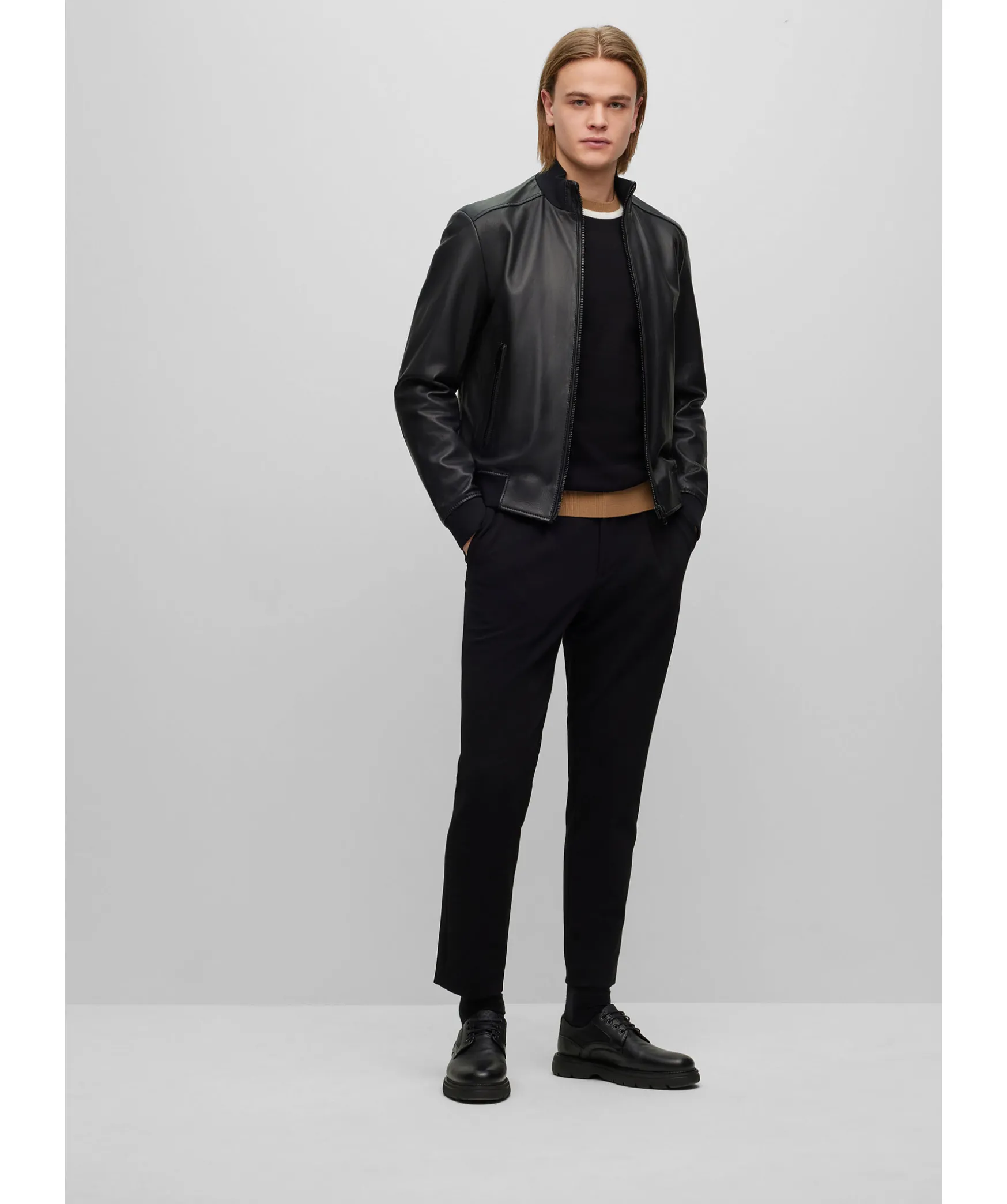 Svart Skinnjacka Fran Boss Black I Bomber Modell. Ribbstickad Mudd Vid Kragen, Arm Och Plaggslut. Tva Fickor Framtill Som Stangs Med Dragkedja. Tillverkad I 100% Lader.