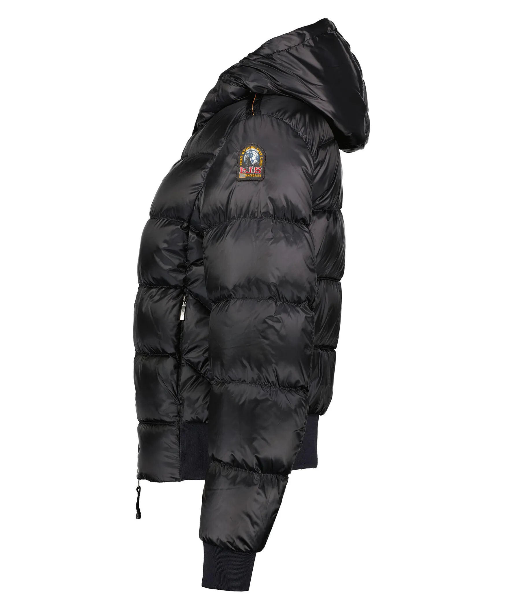 Svart, Kort Pufferjacka Med Huva Fran Parajumpers. Kommer I Ett Glansande Nylon-Polyester Material Med En Vattenavvisande Behandling. Stangs Med Tvavagsdragkedja Och Har Tva Sidfickor Som Stangs Med Dragkedja Och En Innerficka. Patch-Logotyp Pa Vanster Arm. Ventilations Hal Under Armhalan. Ribbstickade Elastiska Muddar Vid Armslut Och Plaggslut. Mariah-Jackan Ar En Klassisk Pufferjacka Med Elegant Design.
