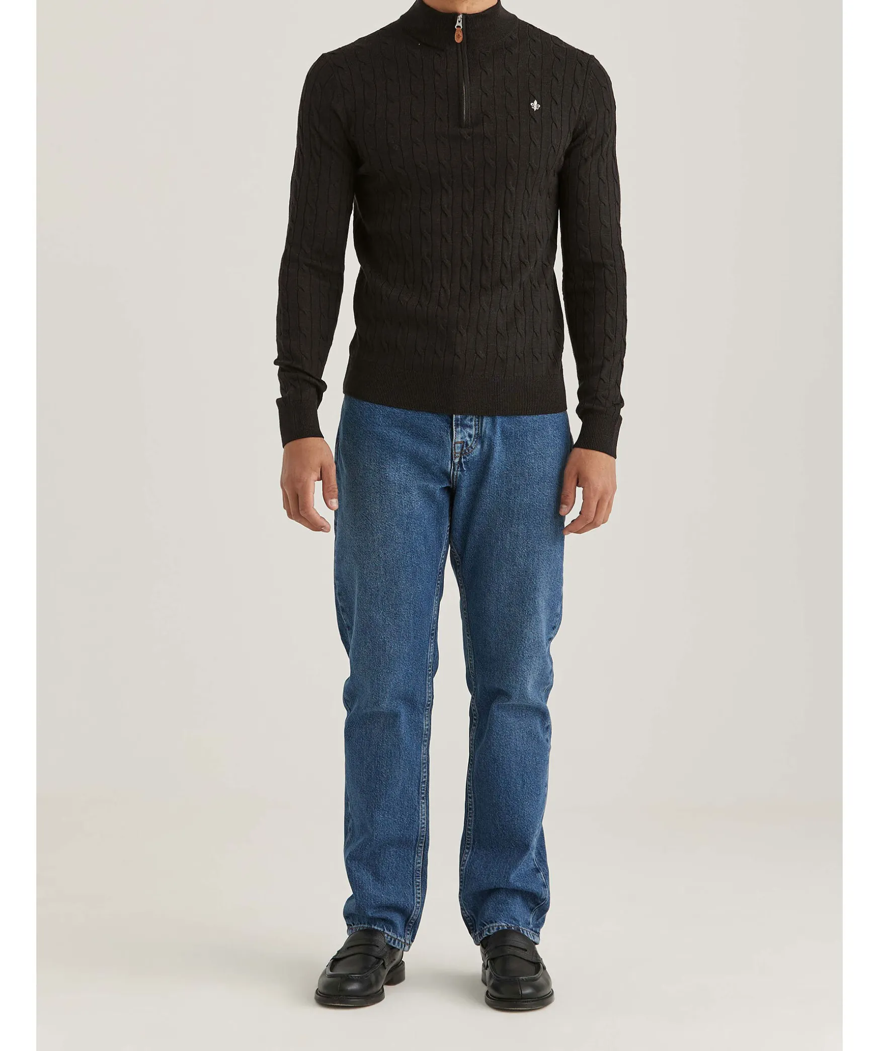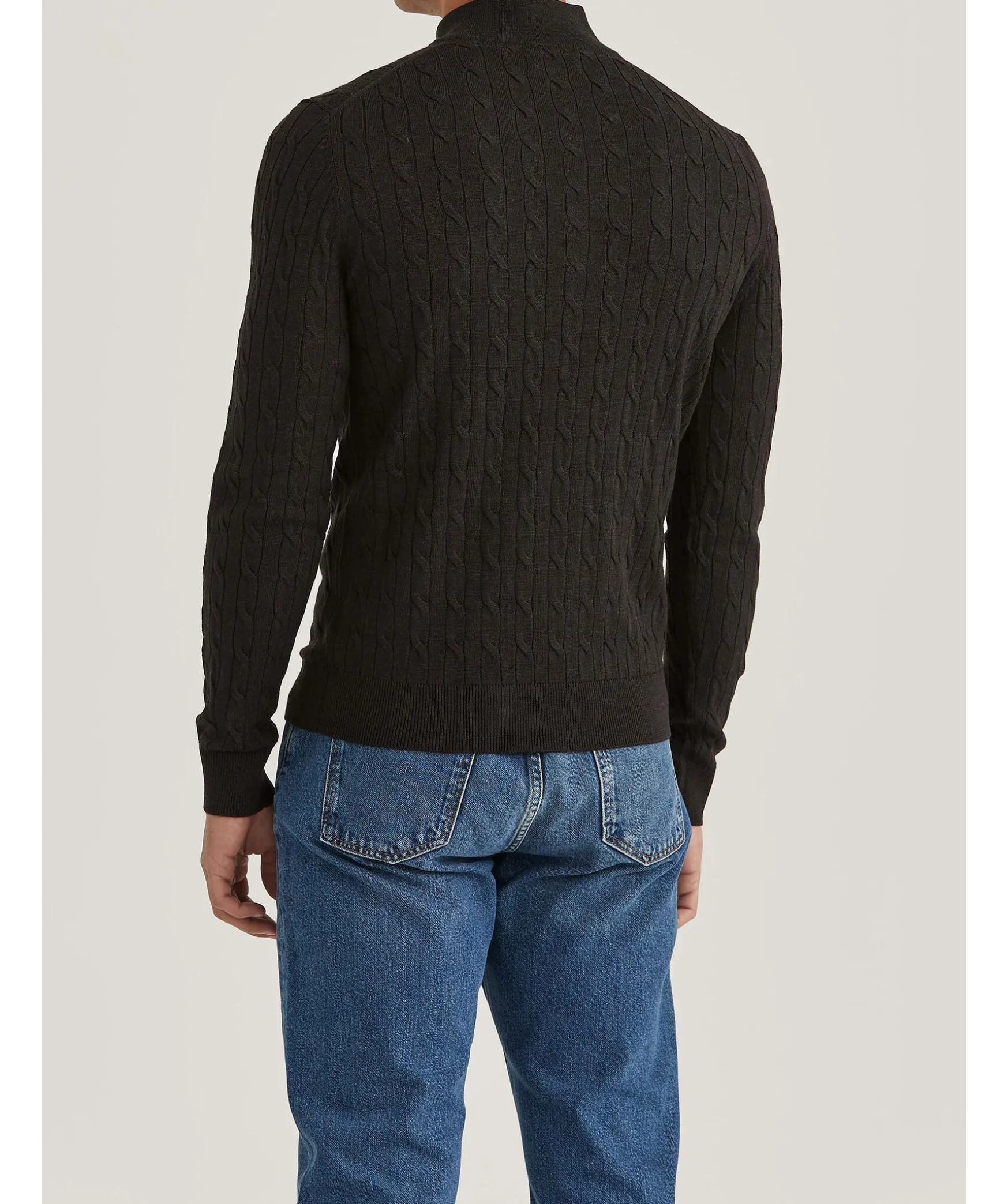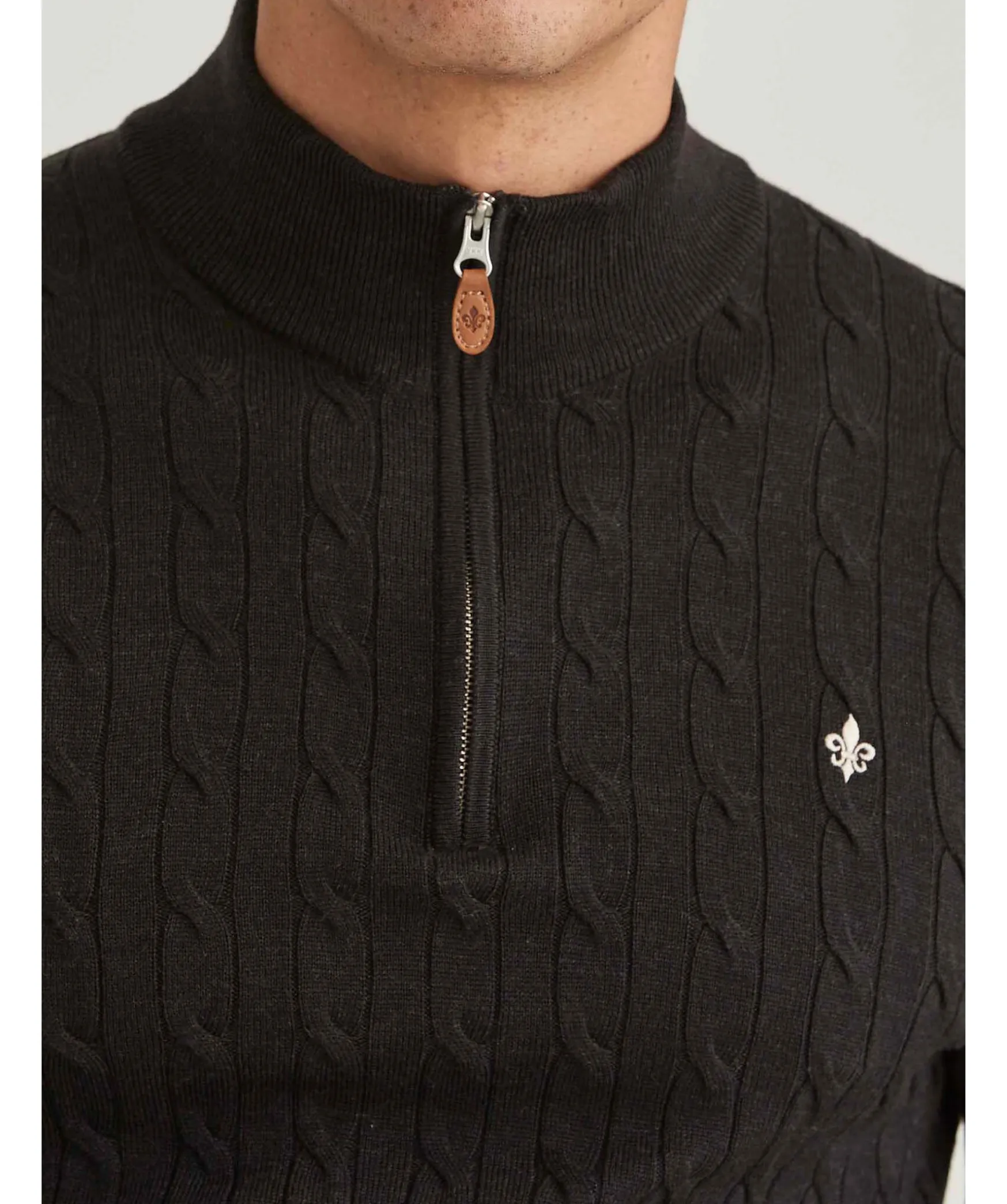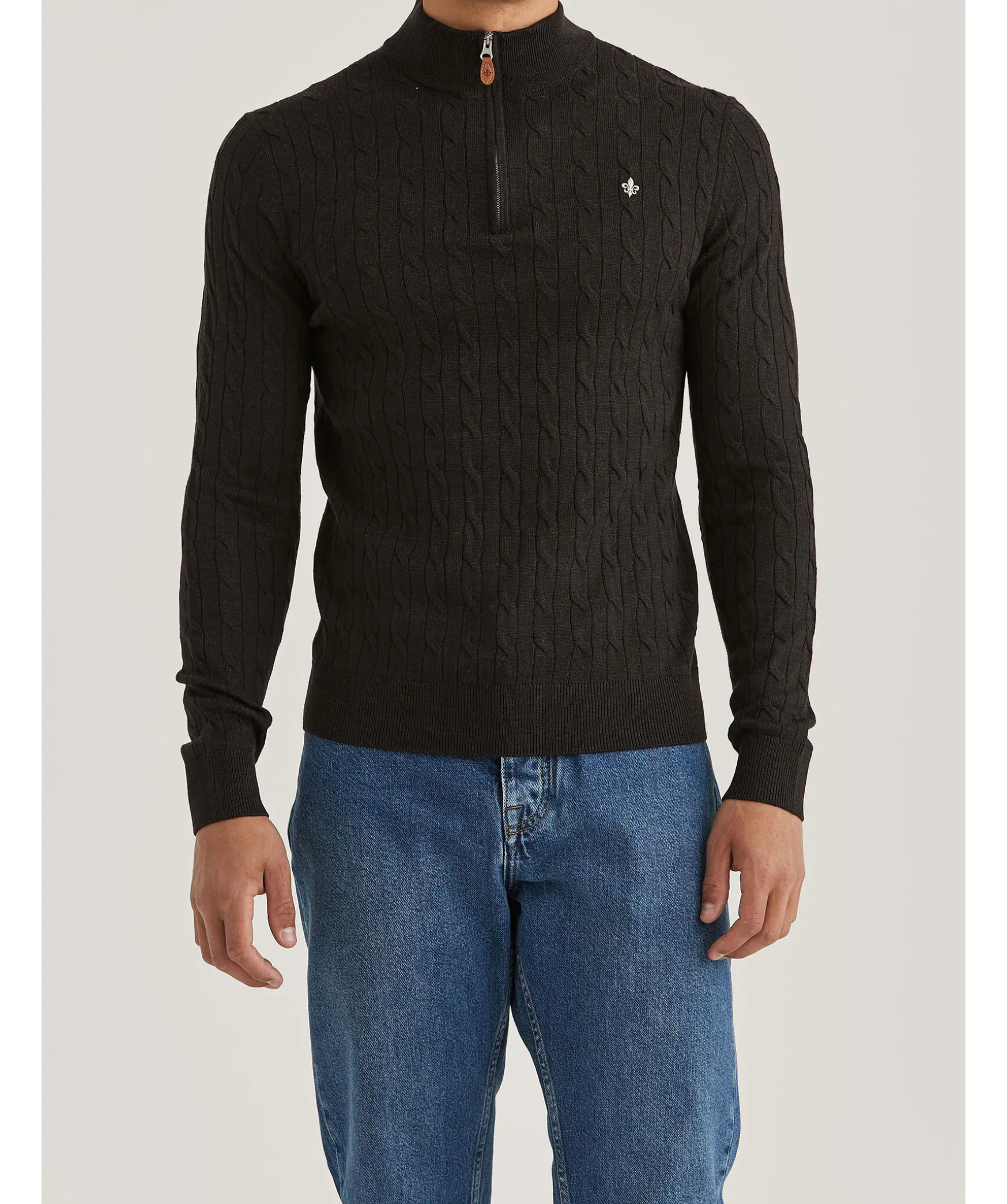 Morkbrun Kabelstickad Half-Zip Fran Morris. Ribbstickad Krage, Mudd Vid Arm- Plaggslut. Broderad Logotyp Pa Vanster Brost. Tillverkad I 100% Merinoull. Detalj I Lader Med Embossad Logotyp Pa Dragkedjan.