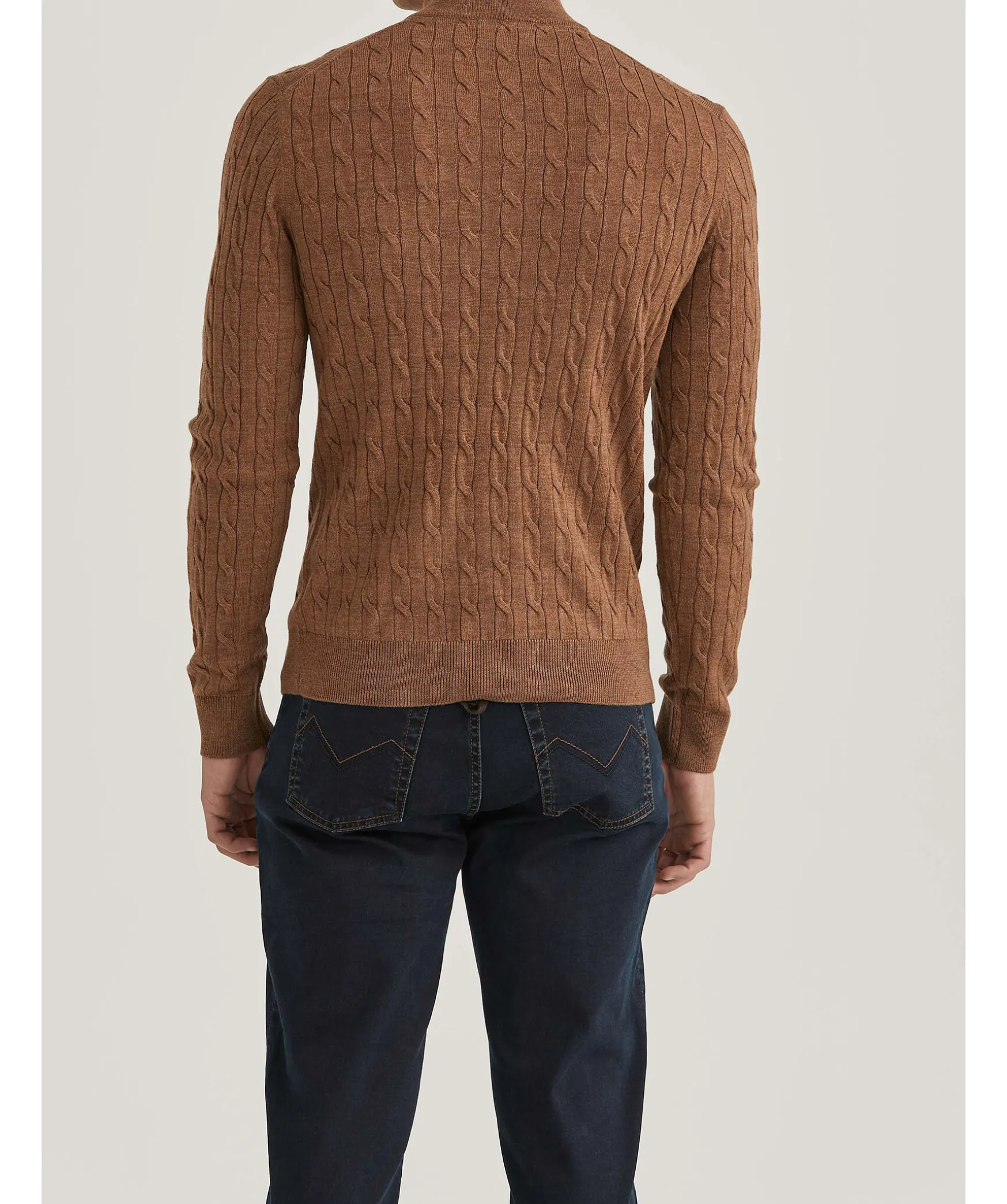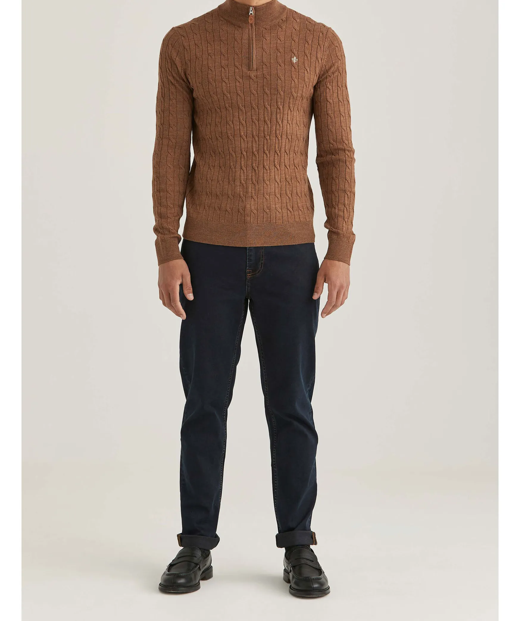 Brun Kabelstickad Half-Zip Fran Morris. Ribbstickad Krage, Mudd Vid Arm- Plaggslut. Broderad Logotyp Pa Vanster Brost. Tillverkad I 100% Merinoull. Detalj I Lader Med Embossad Logotyp Pa Dragkedjan.