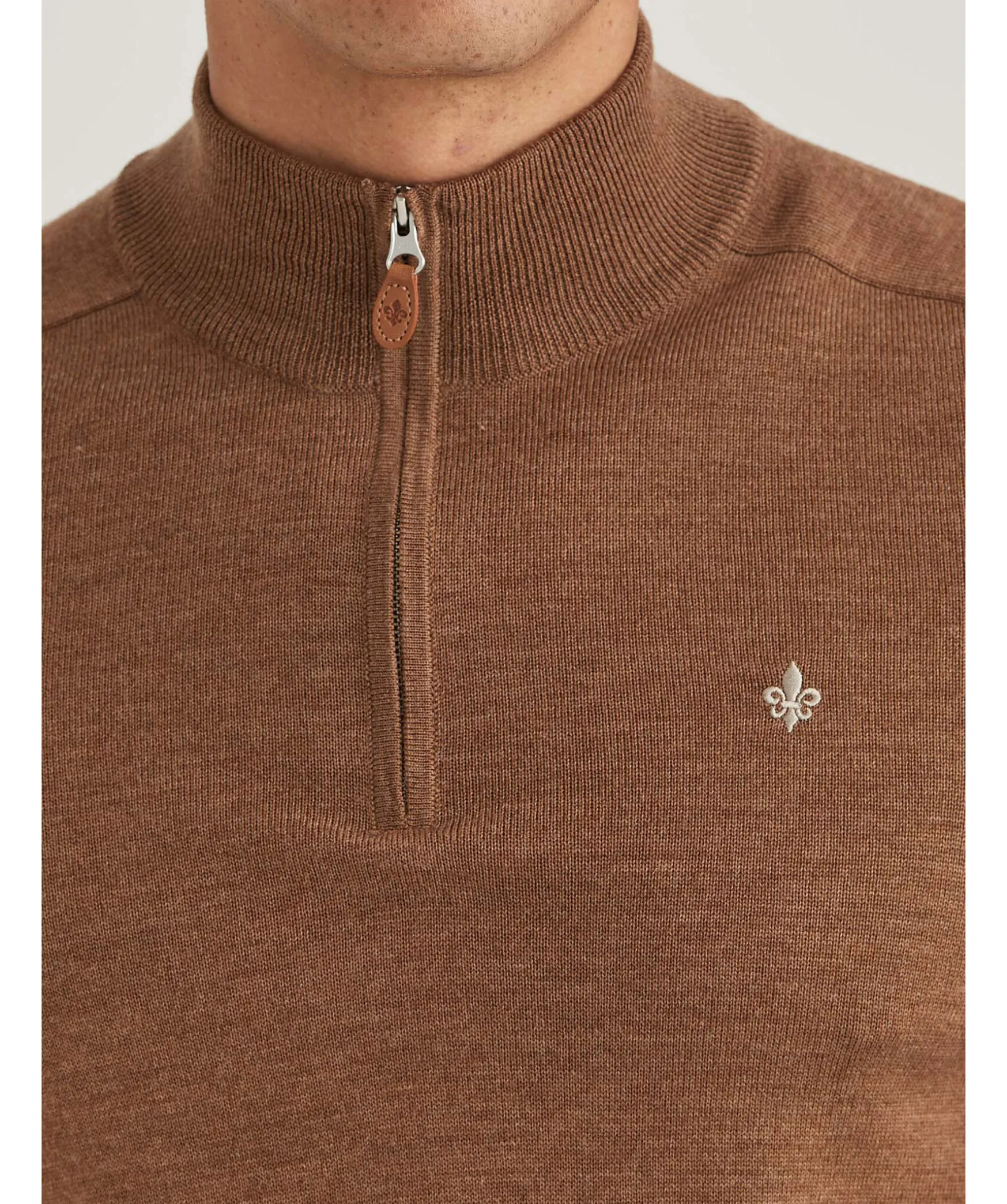Beige Finstickad Troja Fran Morris. Trojan Har En Hog Krage Med Halfzip. Gjord I 100% Merinoull. Broderad Lilja Pa Brostet Och Ribbstickade Muddar. Smal Passform.