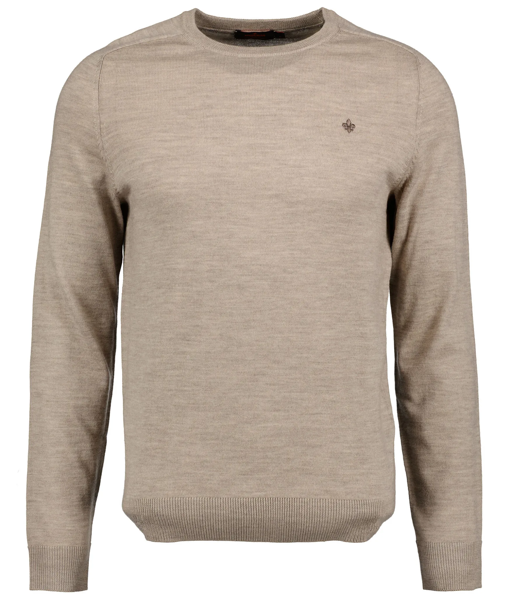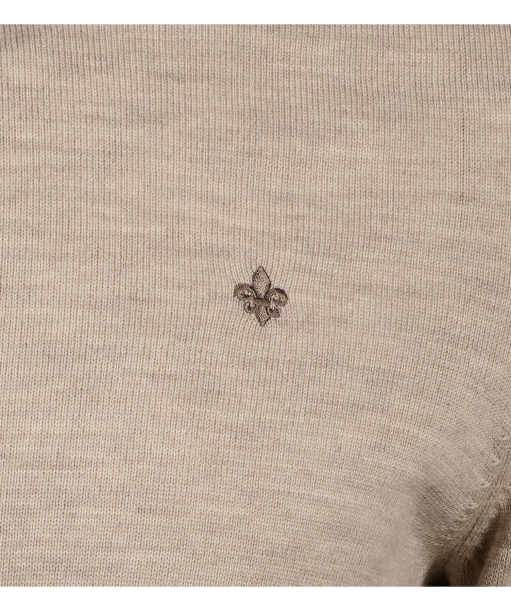 Beige Finstickad Pullover Fran Morris. Trojan Ar Gjord I Ett Fint Merinoulltyg, Ribbstickade Muddar Och En Broderad Fransk Lilja Pa Brostet.