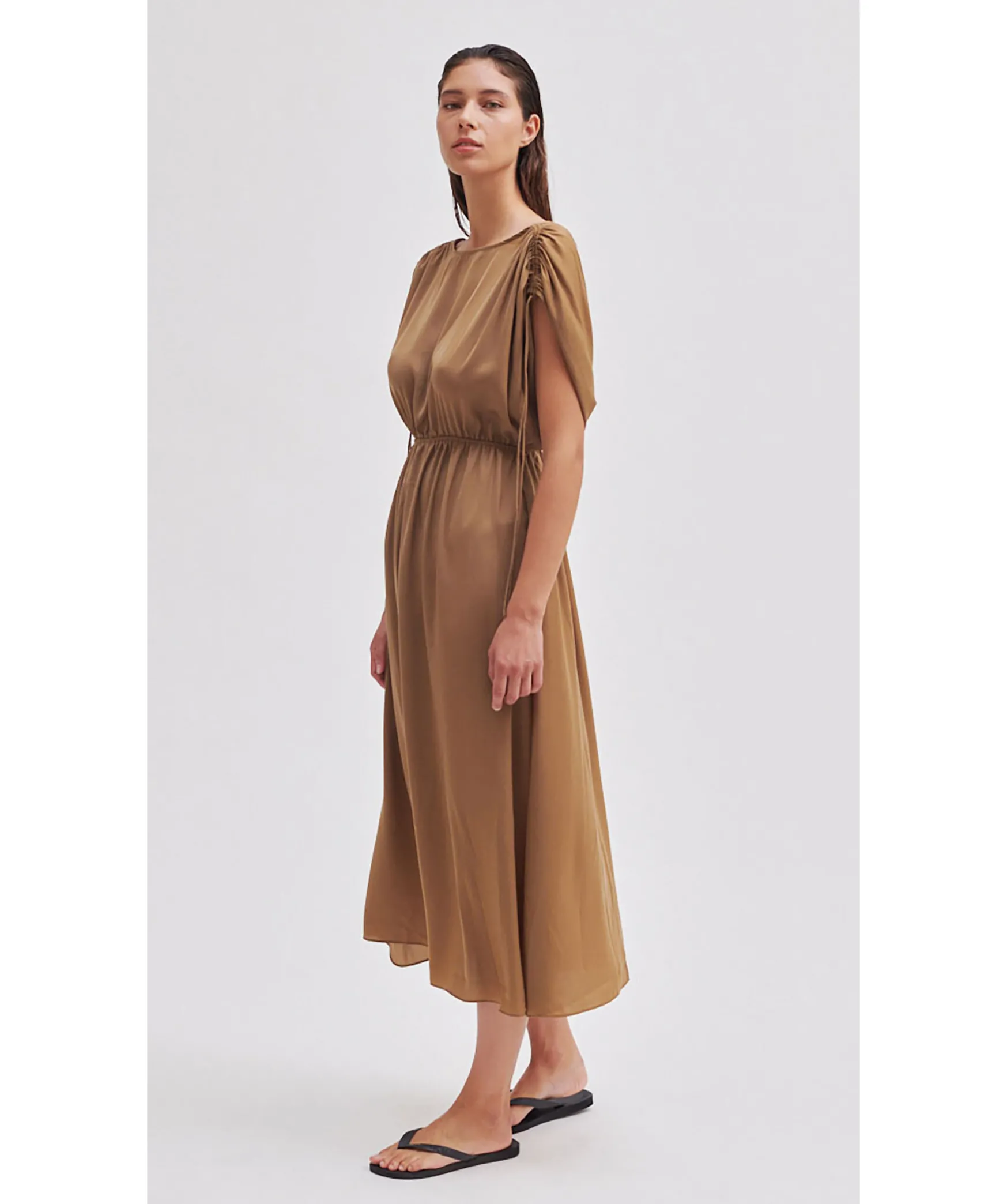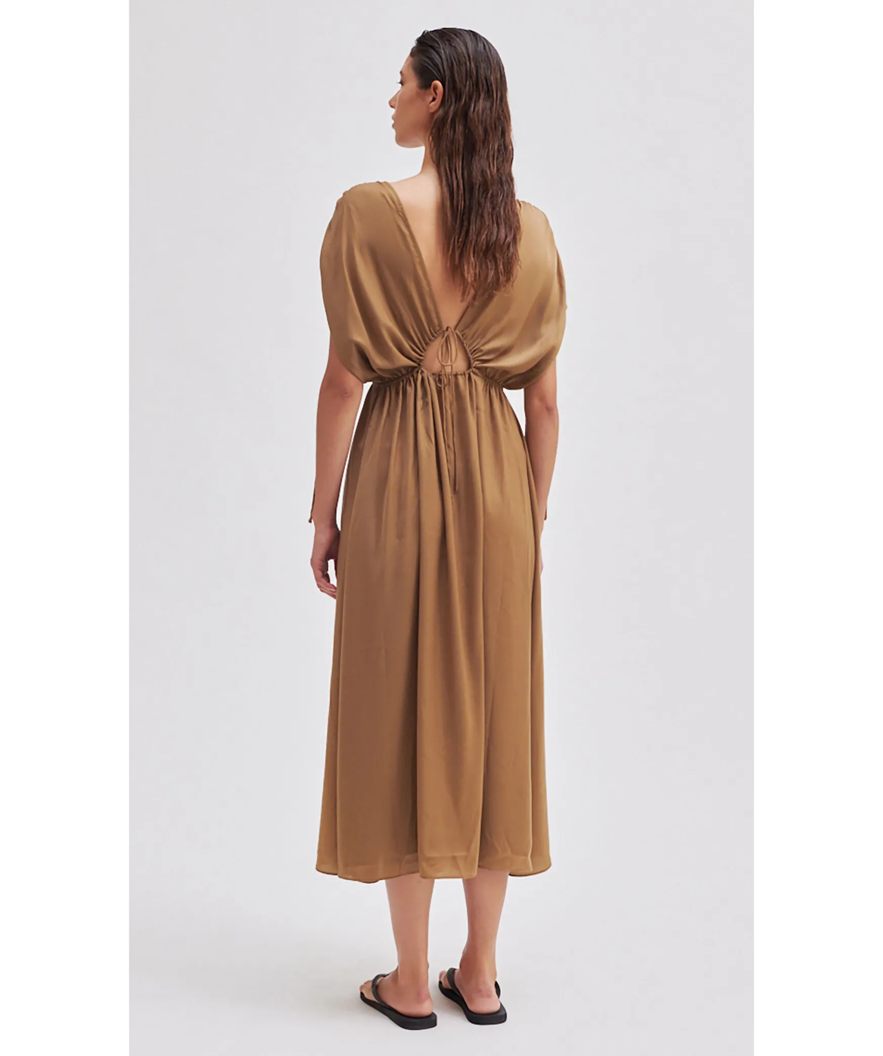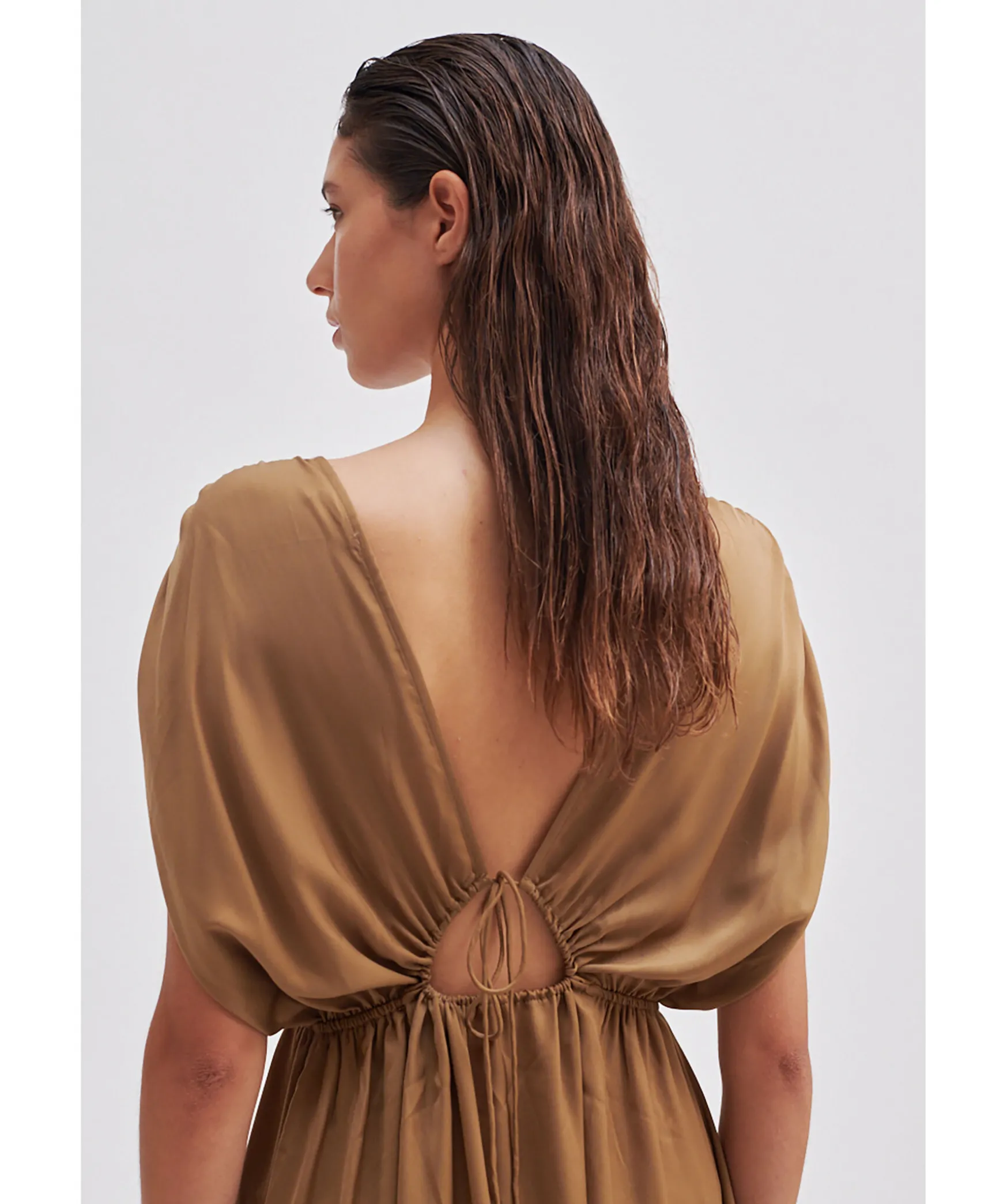 Kamelfargad Lang Satinklanning Fran Second Female. Tillverkad I Silkesmjuk Och Flytande Atervunnen Polyester. Med Rund Hals Fram Och Oppen Rygg Med Utskuren Detalj Och Dragsko Med Knytband. Resar I Midjan Och Dragsko Med Knytband Vid Axlarna. Avslappnad Passform.