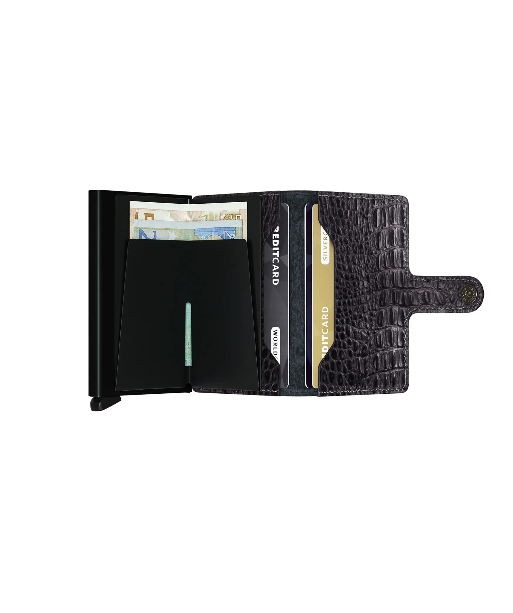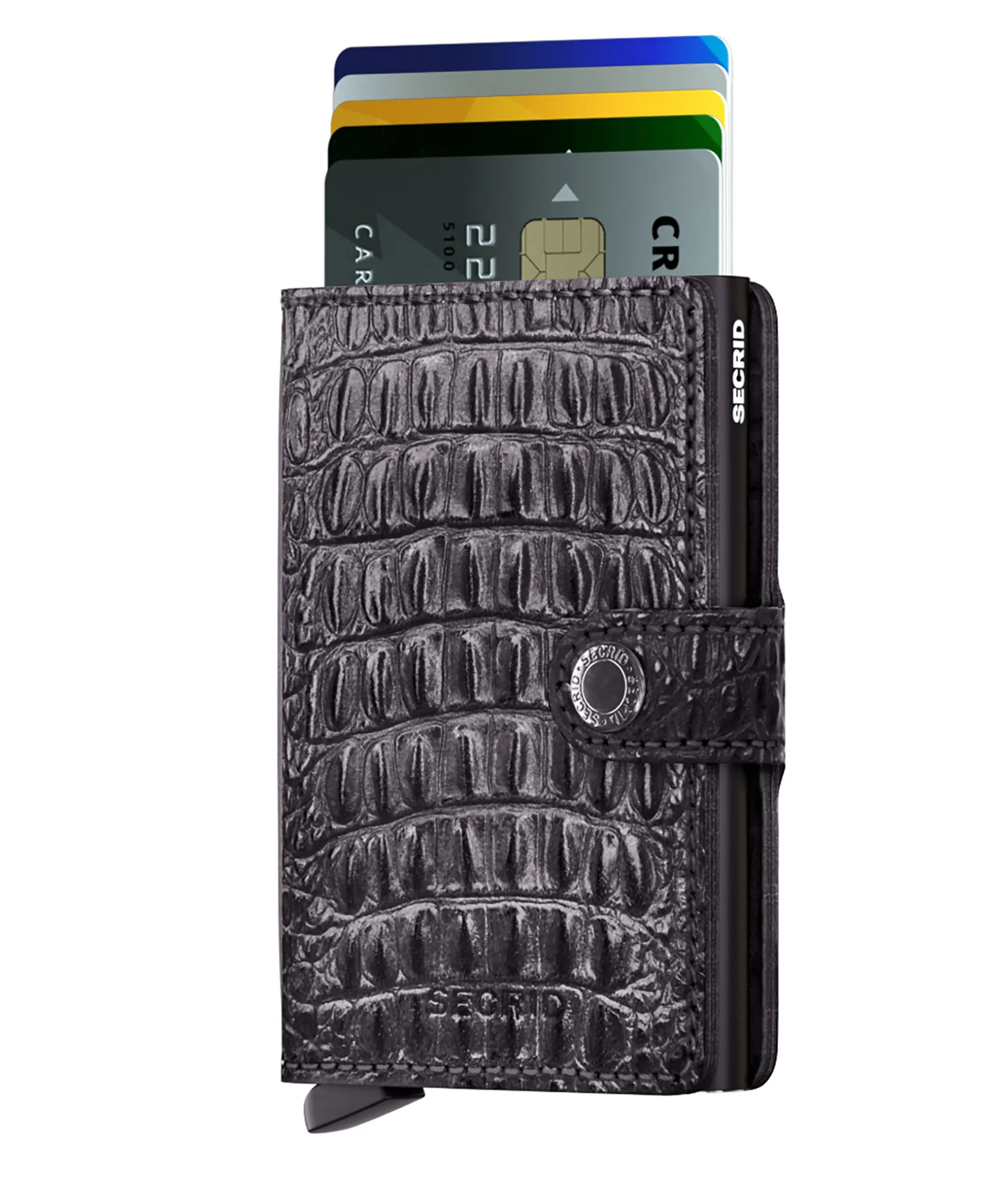 Snygg Och Praktisk Planbok Fran Secrid Med En Smart Cardprotector Inuti Som Ar Rfid-Saker. Spaken Pa Undersidan Anvands For Att Skjuta Ut Dina Kort Pa Ett Praktiskt Satt. Det Finns Aven Plats For Tex. Fler Kort Eller Kontanter Pa Insidan. Planboken Kommer I En Svart Farg I Deras Monstrade Nile-Skinn.Perfekt Planbok For Den Som Vill Skydda Sina Kort Och Samtidigt Behalla Stilen!