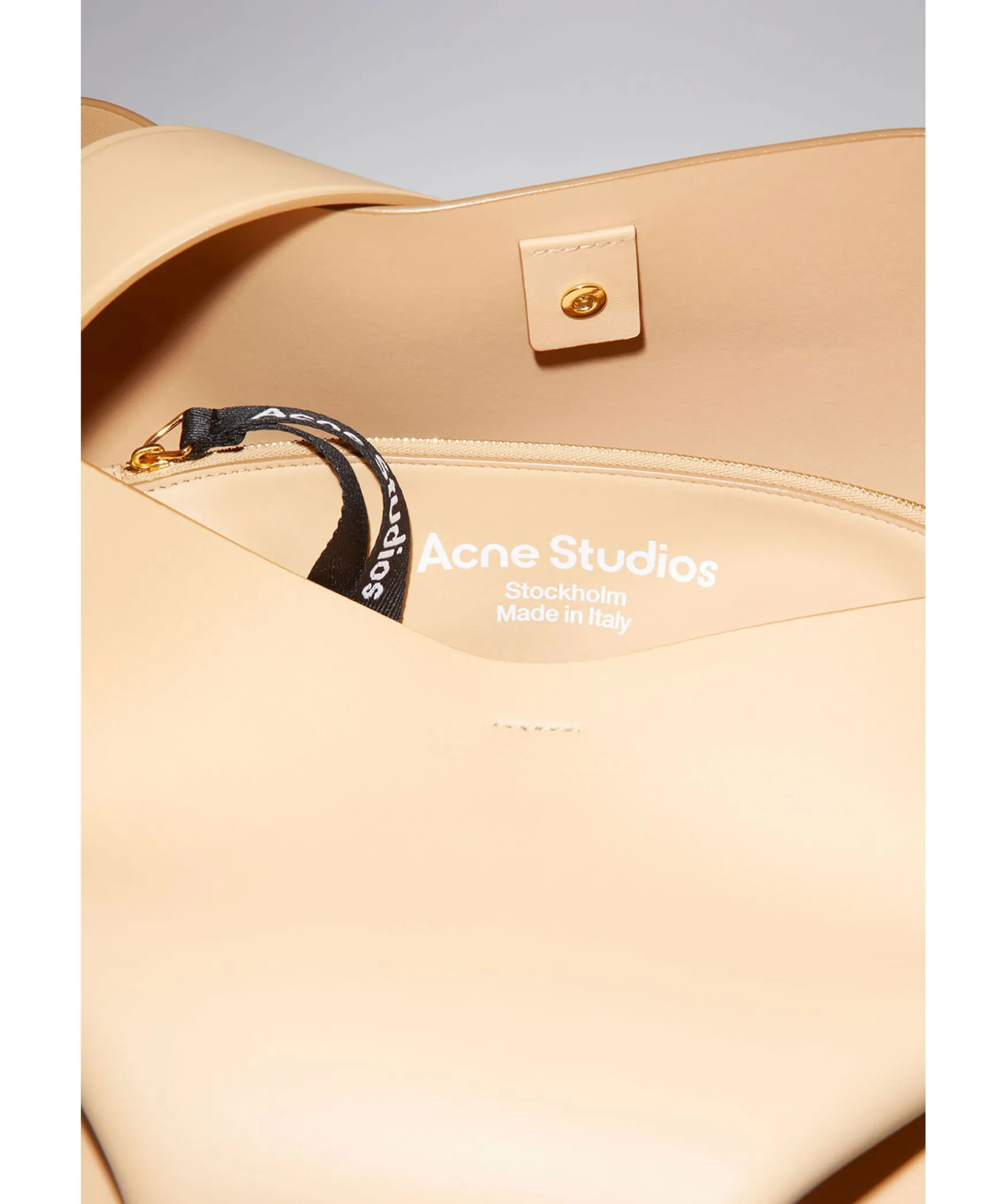Beige Vaska I Medium Storlek Fran Acne Studios. Har Vridna Knutar Inspirerade Av Traditionella Japanska Obi-Skarp Pa Sidorna. Den Har En Praglad Logotyp Fram Och Tryckknappsstangning, Som Oppnas For Att Avsloja Ett Blixtlasfack For Forvaring Av Sma Saker. Vaskans Matt: Hojd: 35 Cm, Langd: 35 Cm, Bredd: 16 Cm.