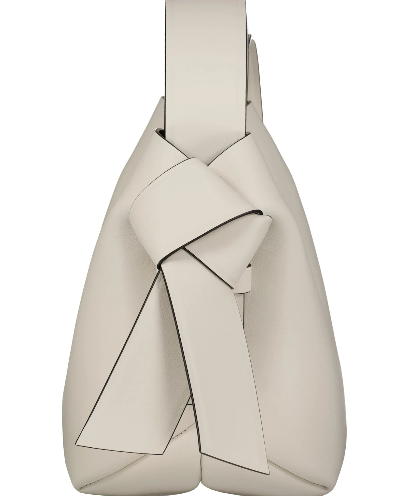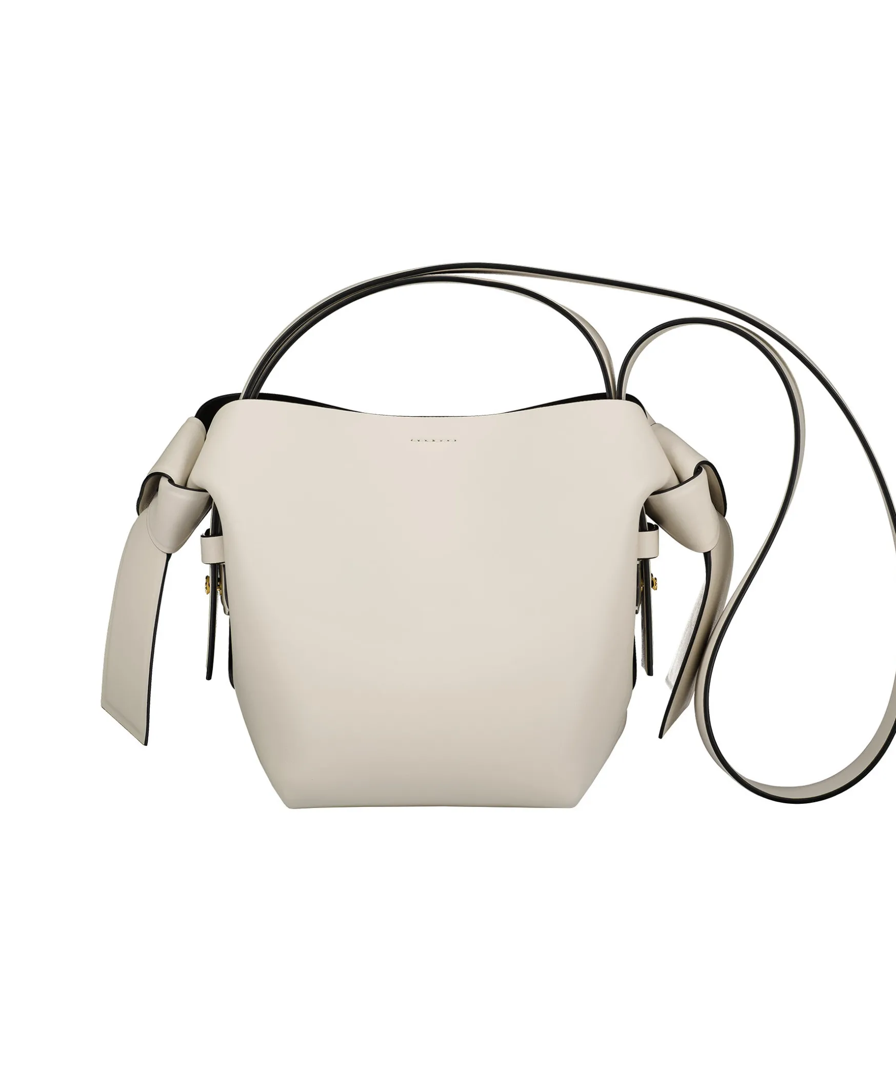 Vit Vaska Med Svart Insida I Mini Storlek Fran Acne Studios. Har Vridna Knutar Inspirerade Av Traditionella Japanska Obi-Skarp Pa Sidorna. Den Har En Praglad Logotyp Fram Och Tryckknappsstangning, Som Oppnas For Att Avsloja Ett Blixtlasfack For Forvaring Av Sma Saker. Matt: 21,5 Cm X 20,5 Cm X 15,5 Cm.