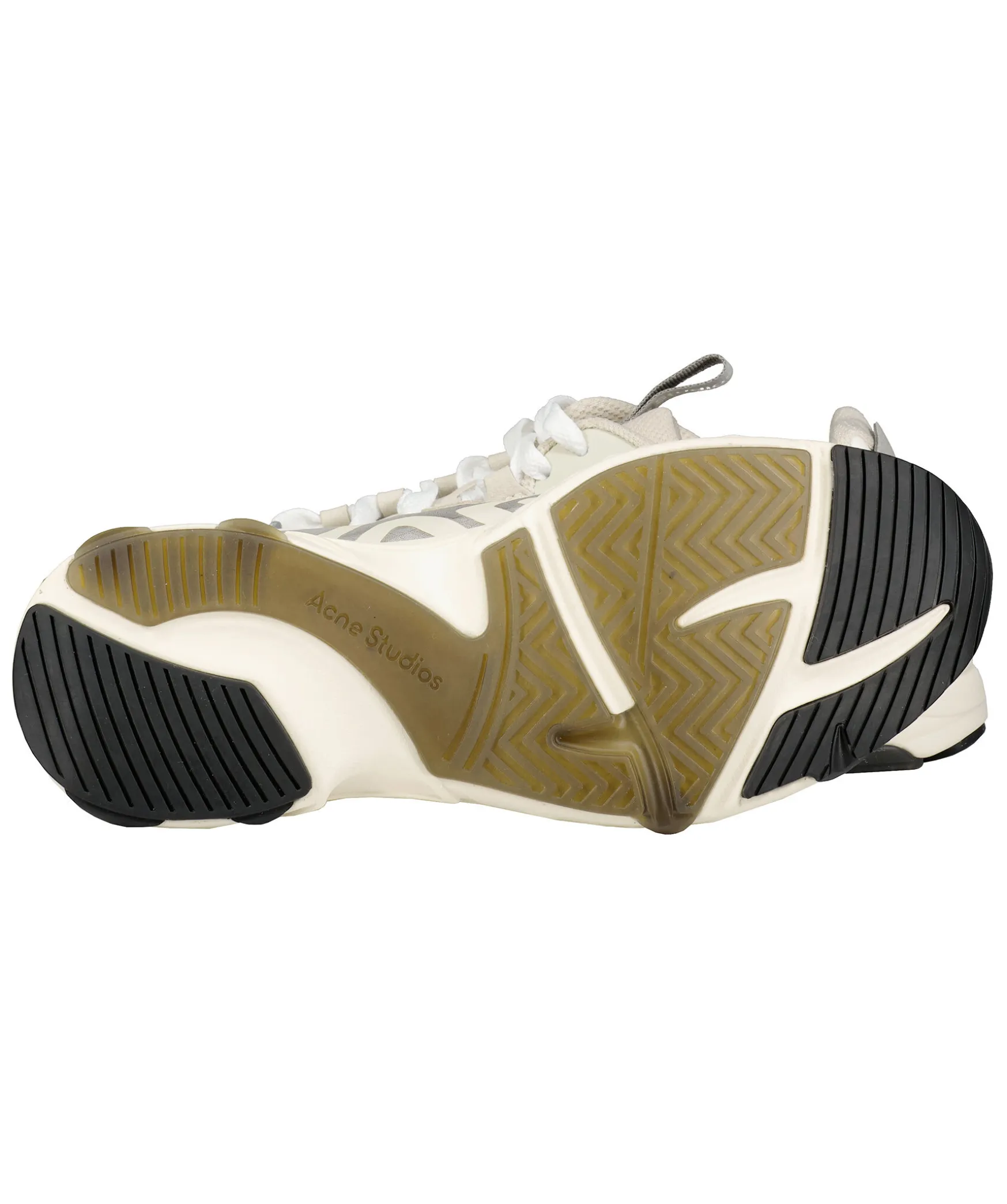 Sneakers Fran Acne Studios I Vitt Och Beige. Har Ett Transparant Meshfoder Och Latta Vita Gummisulor Med Svarta Detaljer Under. Ogla Med Logotyp Och Reflex Pa Plosen.