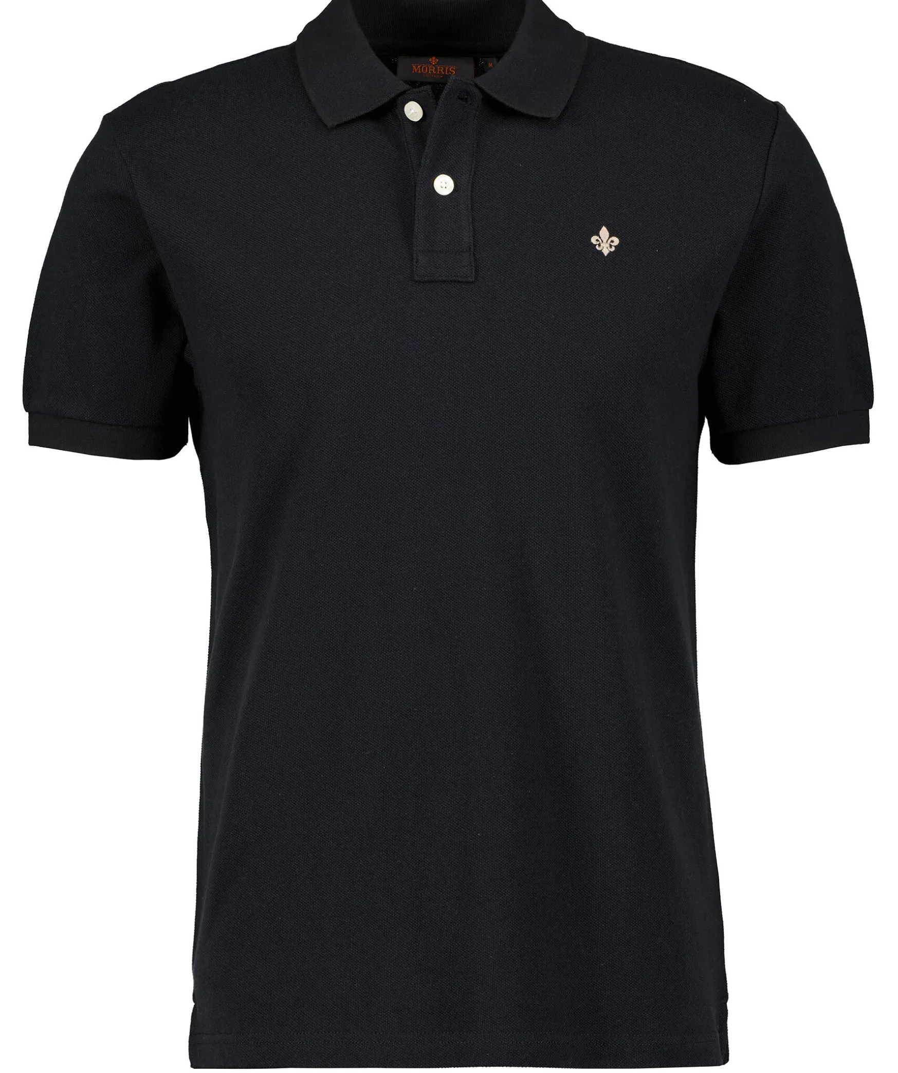 Morkbla Piketroja Fran Morris. Tillverkad I 100% Bomull. Liten, Broderad Lilja Pa Brostet, Normal Passform. Sma Slitsar I Sidorna Och Smala, Ribbade Armslut.