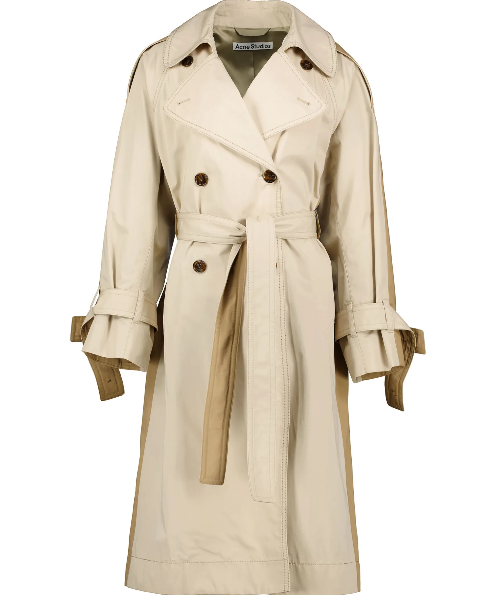 Beige Blockfargad Trenchcoat Fran Acne Studios. Dubbelknappning. Avtagbart Balte. Axelklaffar. Justerbara Armslut. Tillverkad I Bomull. Modellen Ar 179 Cm Lang Och Har Pa Sig Storlek C36.