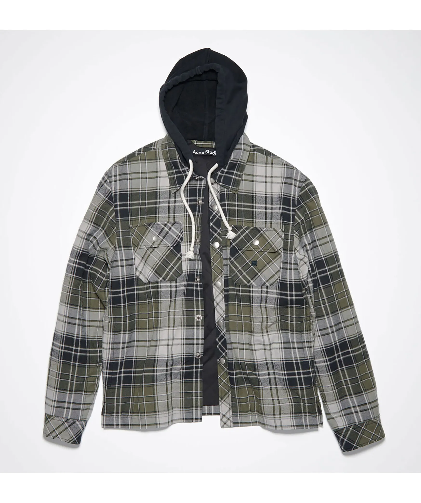 Flanell-Overshirt I Rutmonster I En Gra Och Morkgron Farg Fran Acne Studios. Tillverkad Av Ekologiskt Odlad Bomull. Jackan Ar Detaljerad Med En Mikroface-Logolapp. Komplett Med Tryckknappsstangning, Med Dragsko I Fallen, Passpoal Och Brostfickor. Klipp Till En Vanlig Unisex Passform Med Hoftlangd.