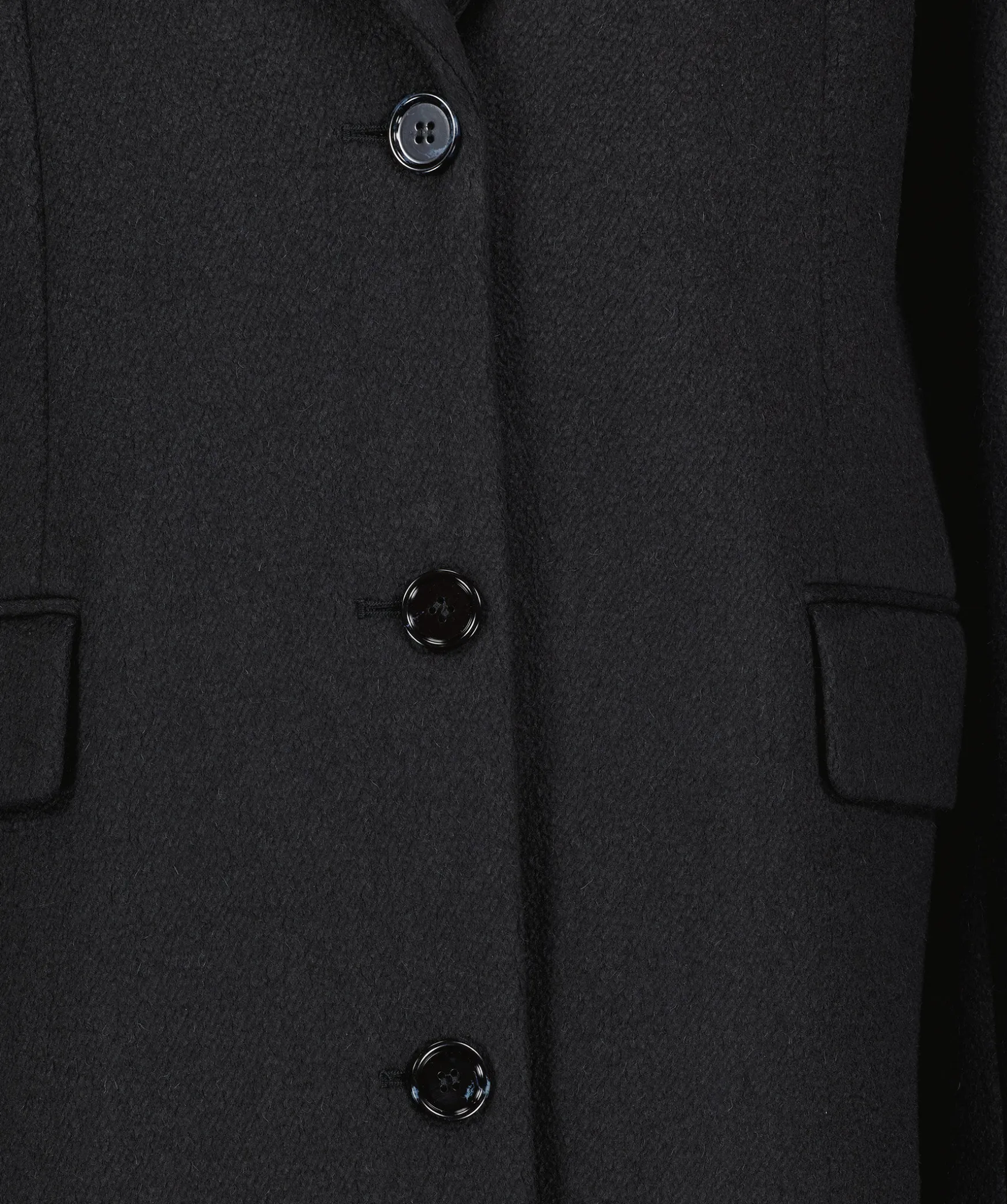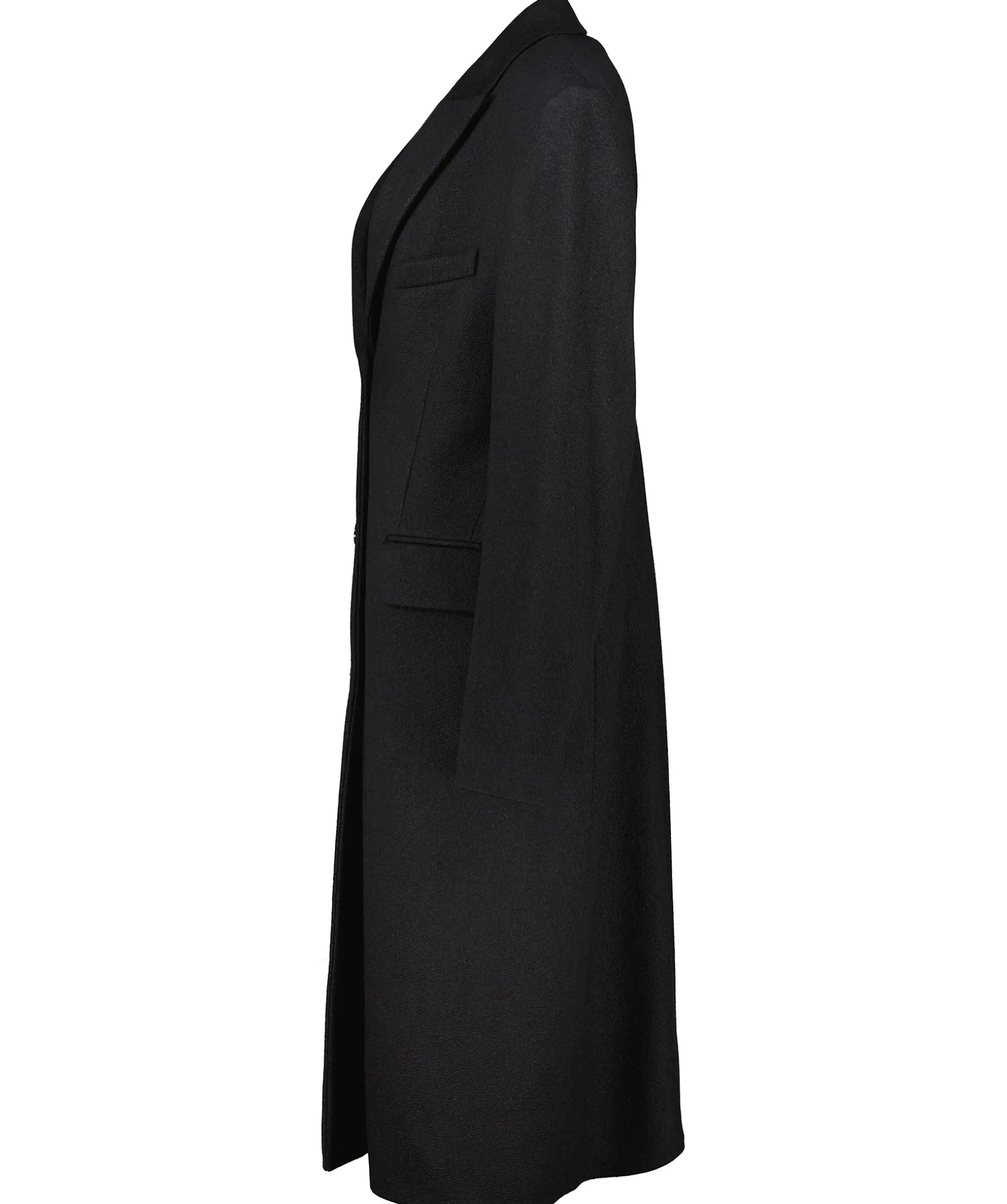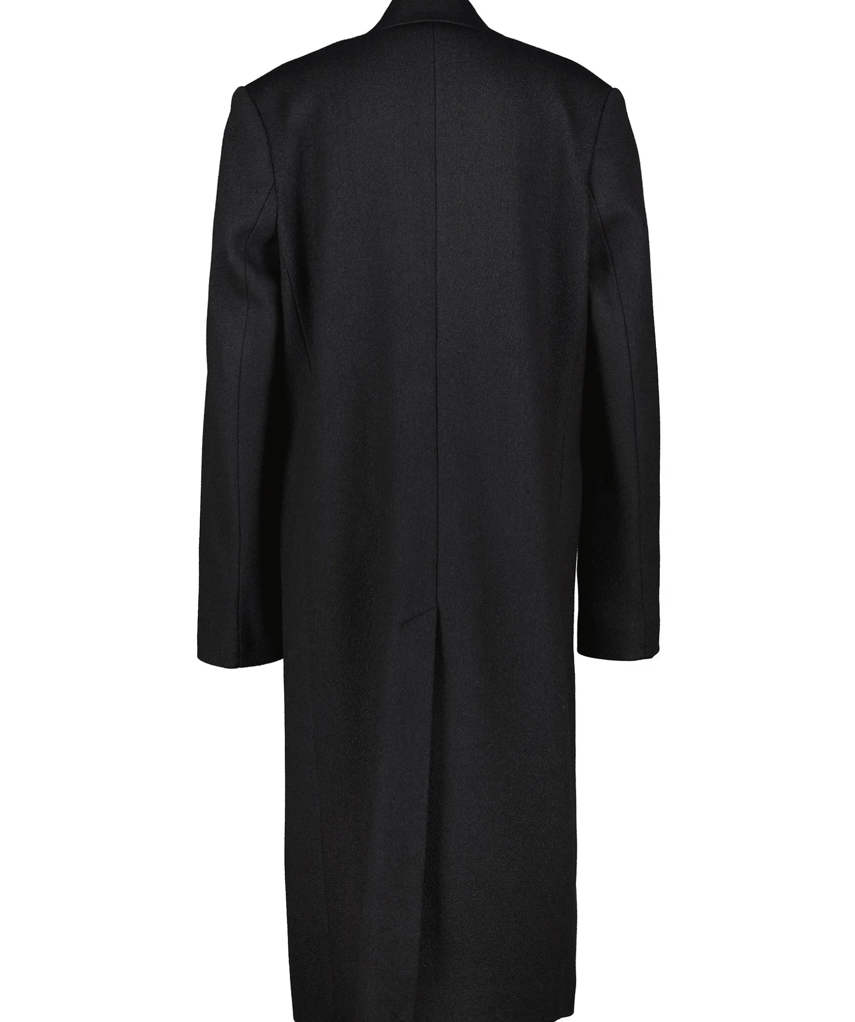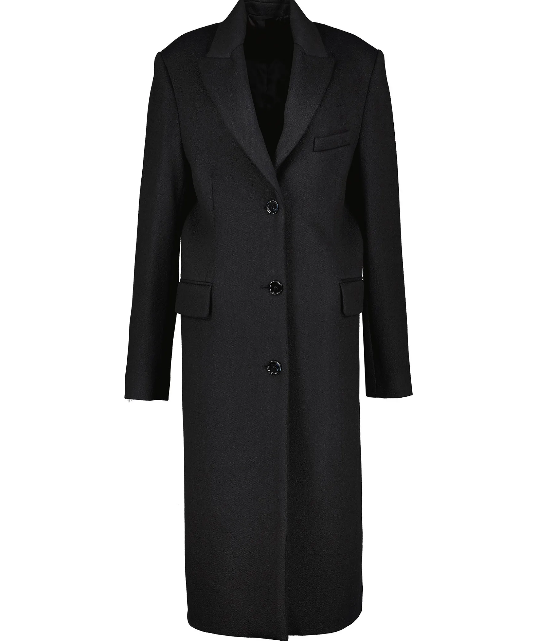Svart Kappa Fran Acne Studios. Enkelknappt. Snedstalld Brostficka Pa Vanster Brost. Tva Fickor Framtill Med Lock. Sprund Baktill. Kappan Har En Borstad Struktur. Tillverkad I Ullblandning.