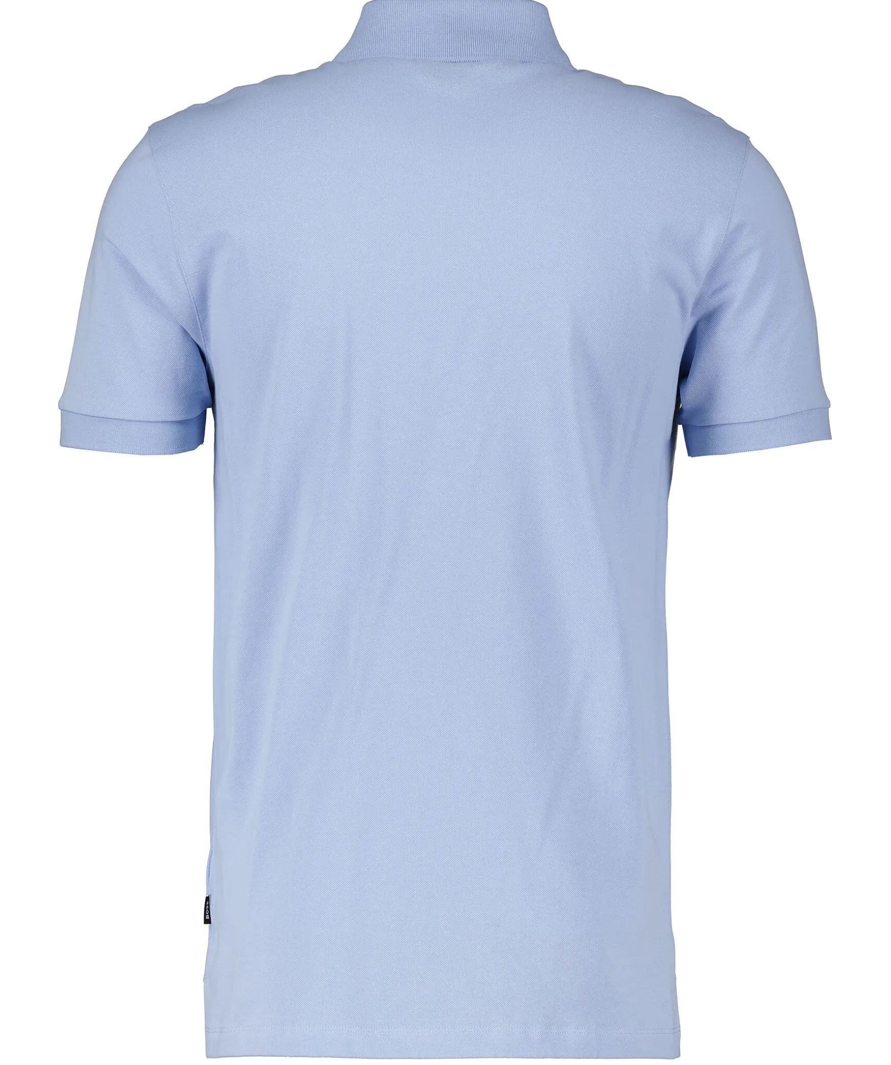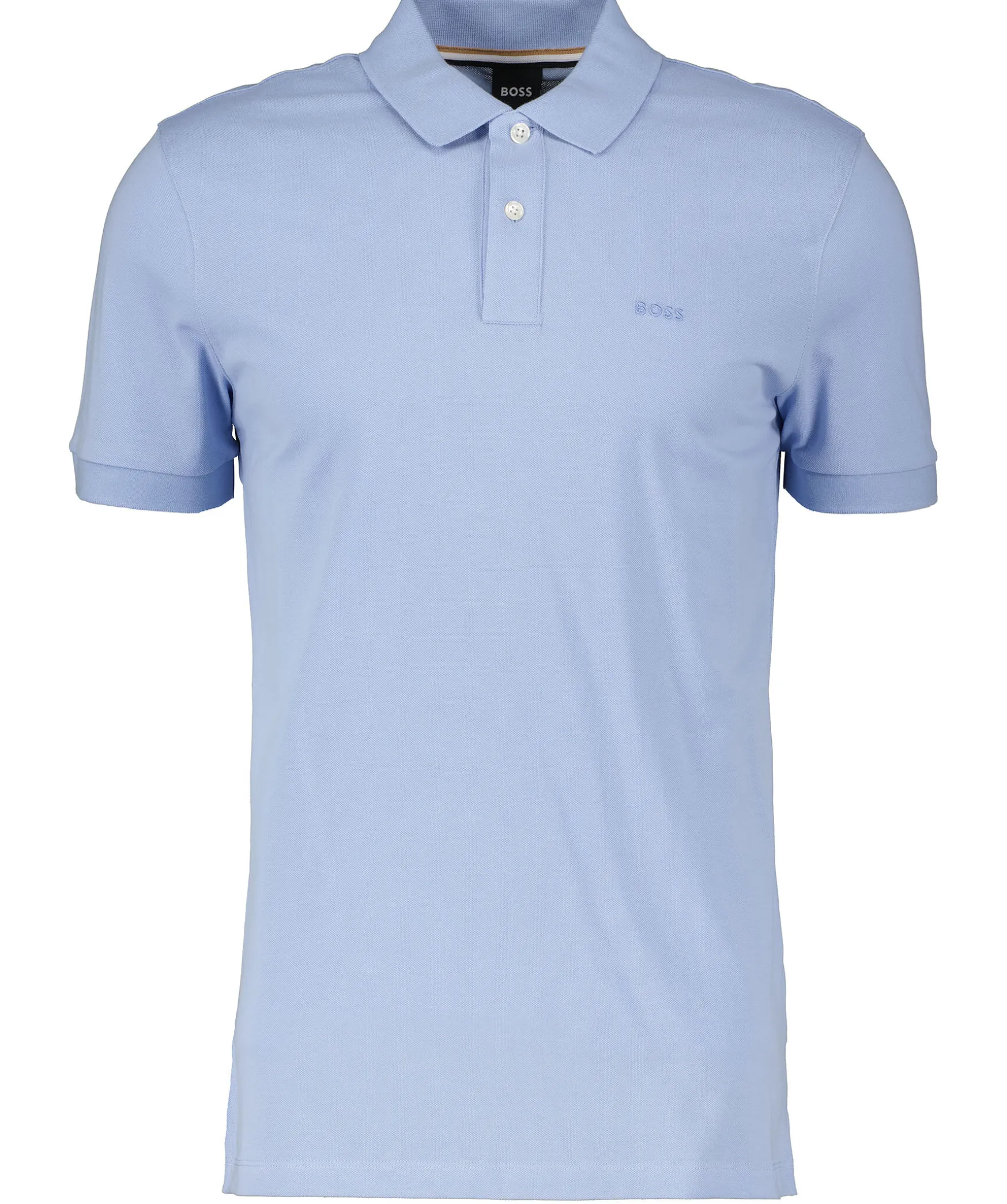 Ljusbla Kortarmadpike Fran Boss Black Gjord I 100% Bomull. Knappsla Med Tva Knappar, Ribbade Krage Och Mudd Vid Armslut. Liten Ton-I-Ton Logotyp Broderad Pa Brostet. Sma Sidoslitsar.