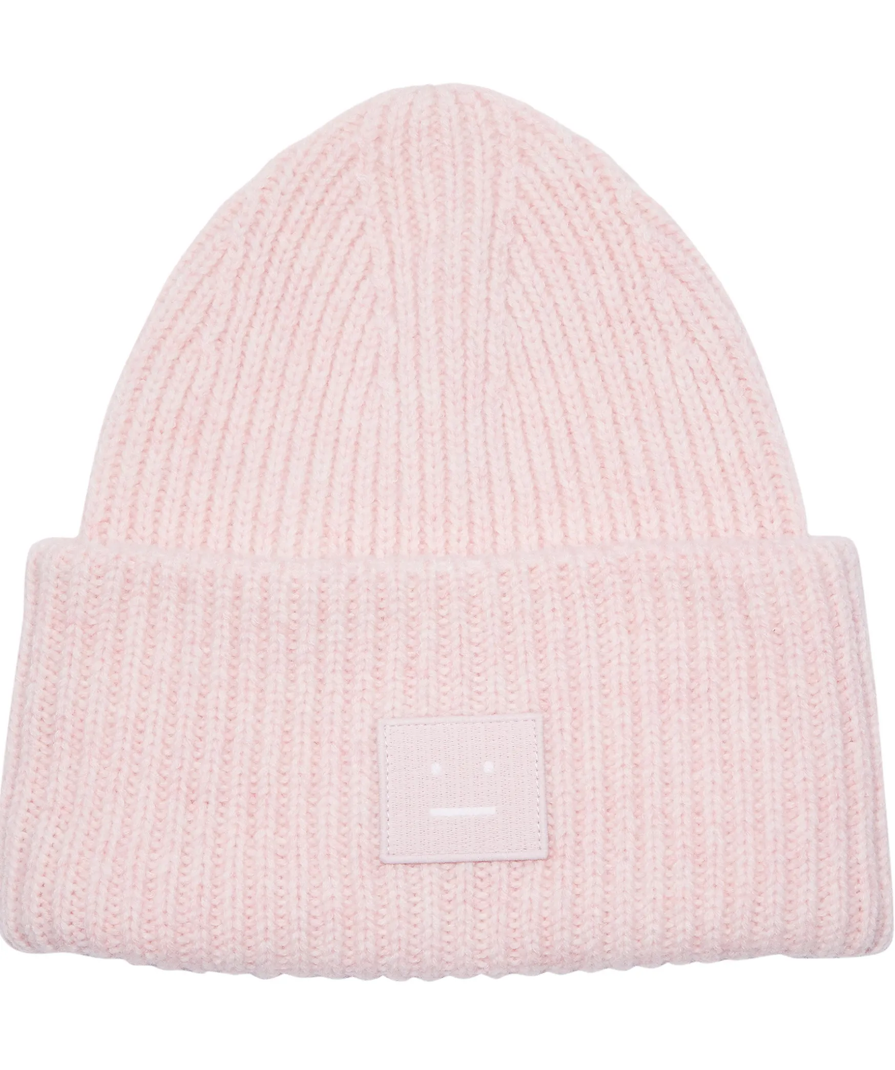 Ljusrosa, Ribbstickad Oversizemossa Fran Acne Studios. Tillverkad Av Mjuk Ull, Har En Bred Uppvikt Kant Och En Ljusrosa Broderad Patch Med Acnes Ikoniska Face-Logga Fram.