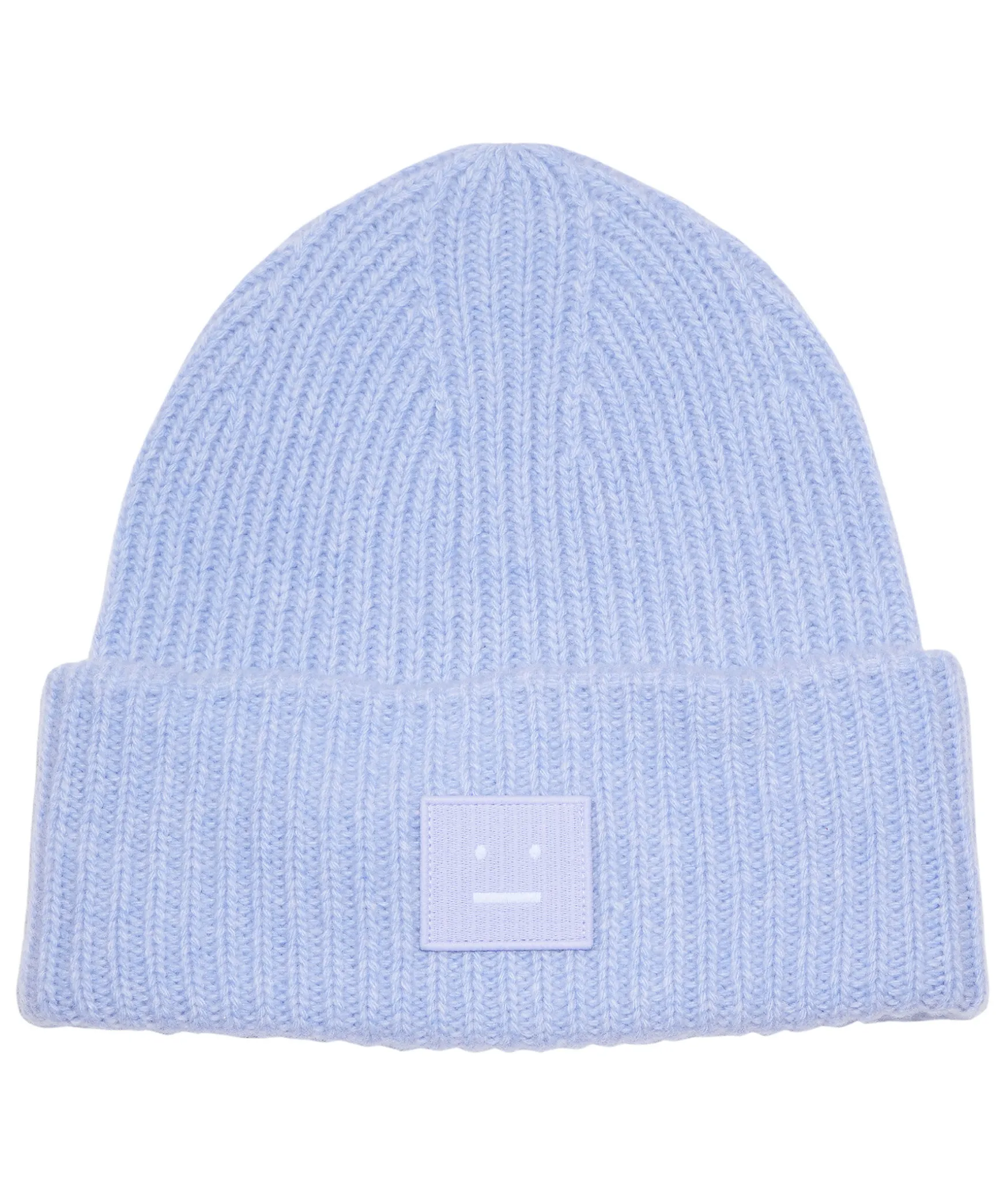 Ljusbla, Ribbstickad Oversizemossa Fran Acne Studios. Tillverkad Av Mjuk Ull, Har En Bred Uppvikt Kant Och En Ljusbla Broderad Patch Med Acnes Ikoniska Face-Logga Fram.