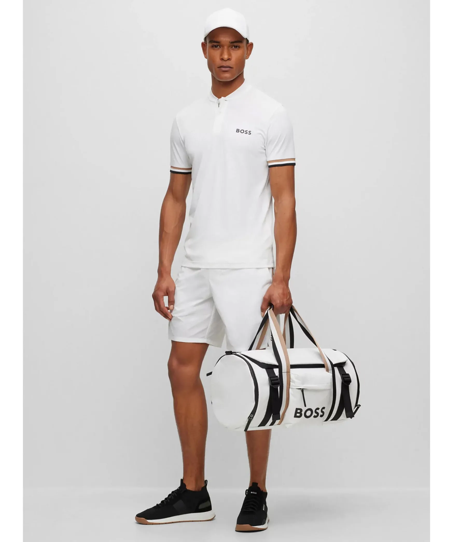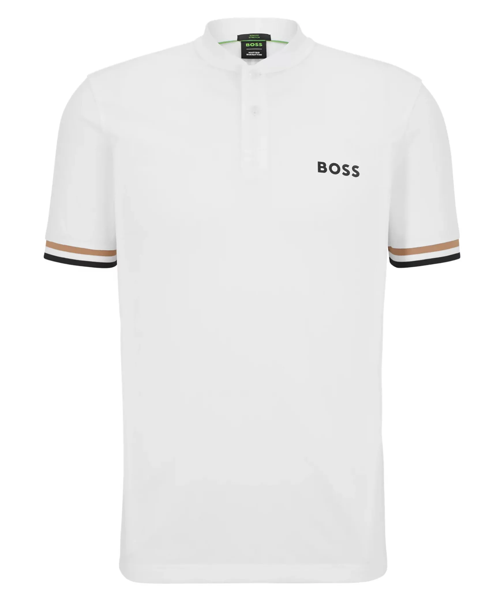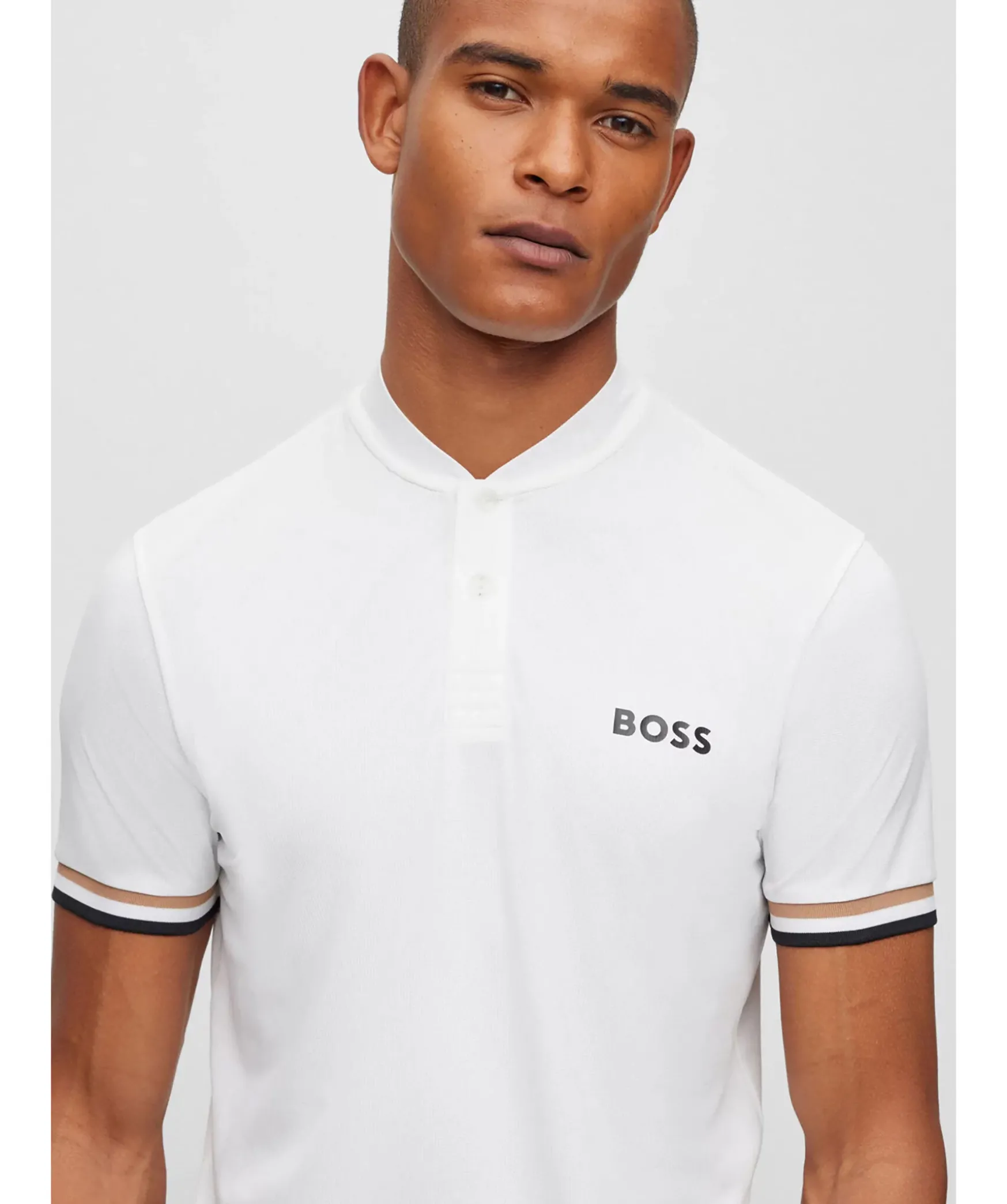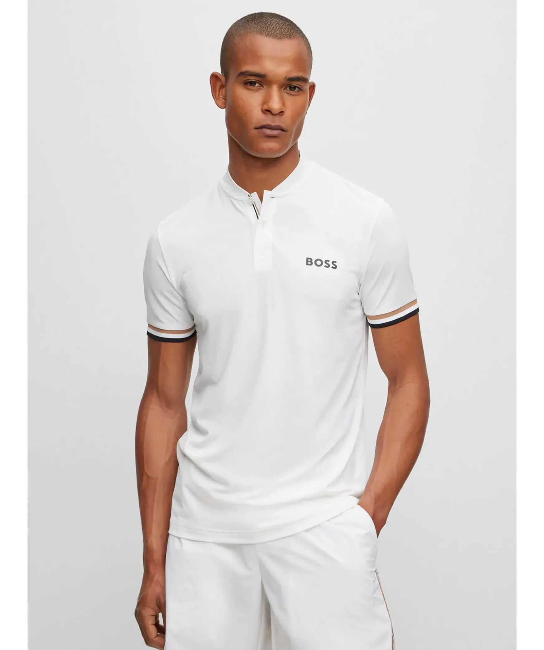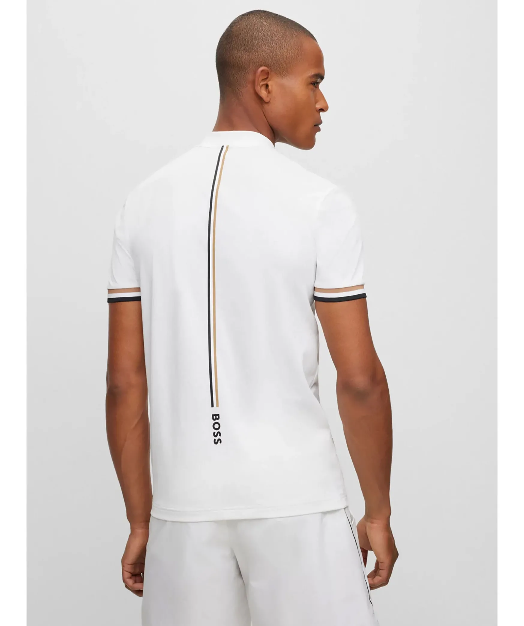 Vit Piketroja Med Krage I Bomberstil Och Definierad Passform Fran Boss Green. Trojan Ar Forsedd Med Marke Och Klassiska Rander Baktill Och Langs Armarna. Tva Knappar Vid Kragen.