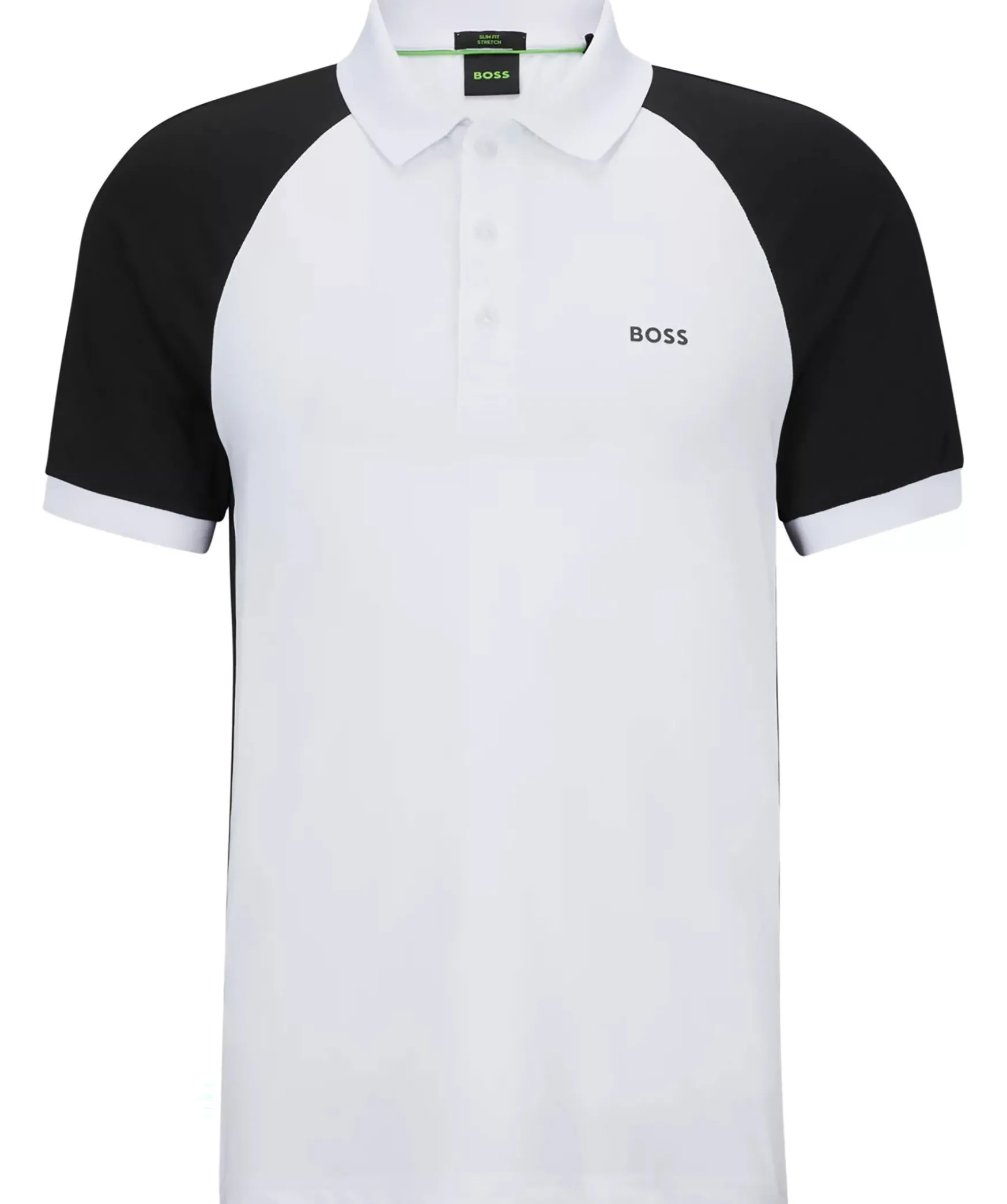 Svart, Vit Pike Fran Boss Green. Tillverkad I Stretch Material Med Textur. Ribbstickad Krage Med Vit Rand. Tryckt Logotyp Pa Vanster Brost Och Baktill I Nacken.