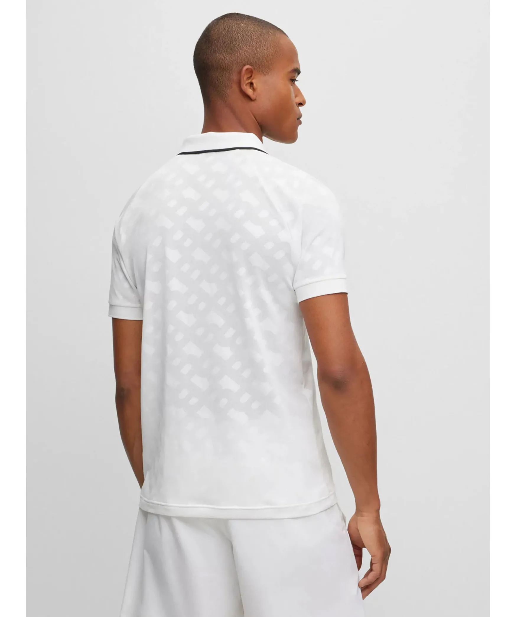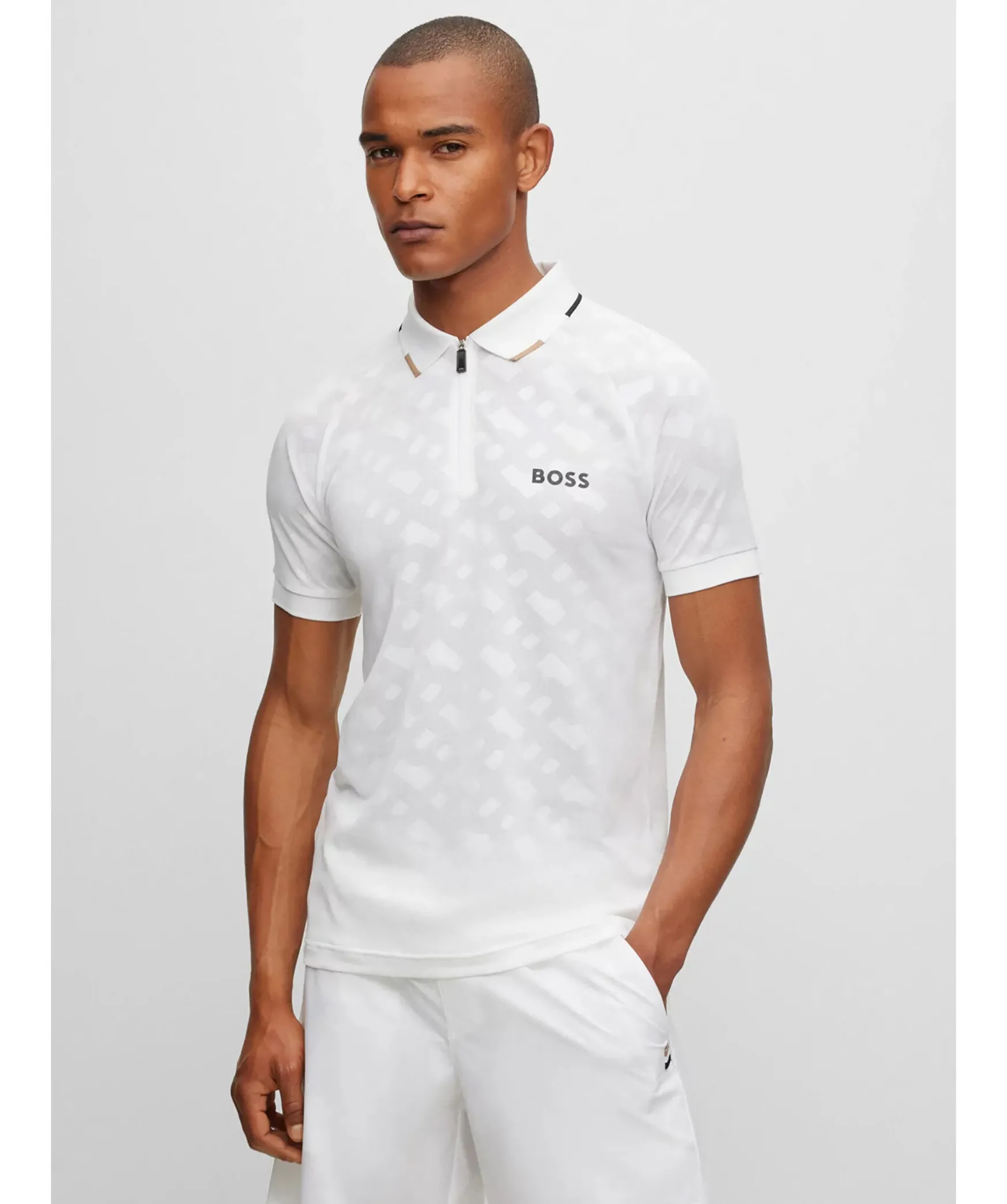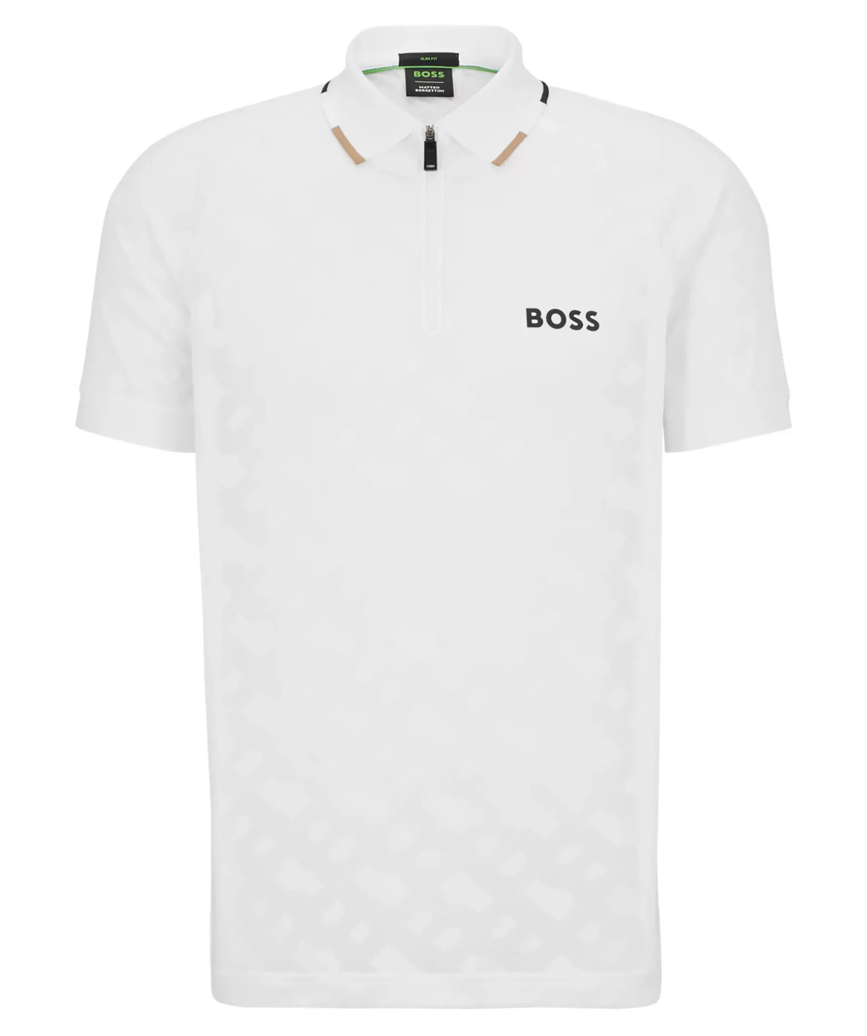 Vit Piketroja Fran Boss Green. En Slimmad Piketroja Med Blixtlas Vid Halsen Och Fargtonade Jacquardvavda Monogram, Kontrastfargade Marken Och En Hugo Boss-Rand Vid Kragen. Plattstickad Krage.