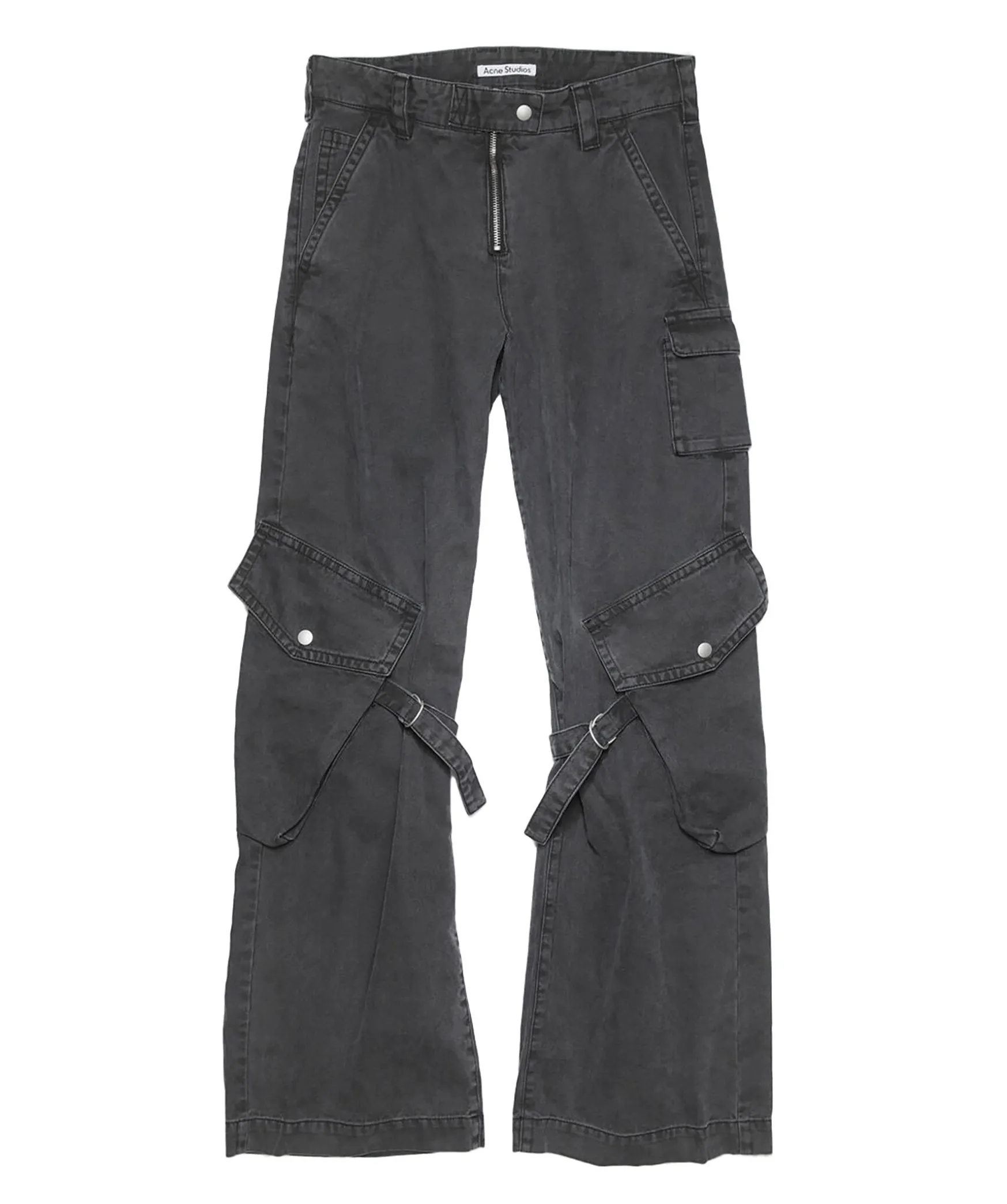 Acne Studios Tvattade Svarta Cargobyxor. Byxorna Har Sido- Och Patchfickor Med Tryckknappar, Detaljerade Med Justerbara Baltesremmar. Klipp Till En Avslappnad Passform Med Ett Fargat Utseende Gjord Av Bomull. Bakfickan Stangs Med Dragkedja.