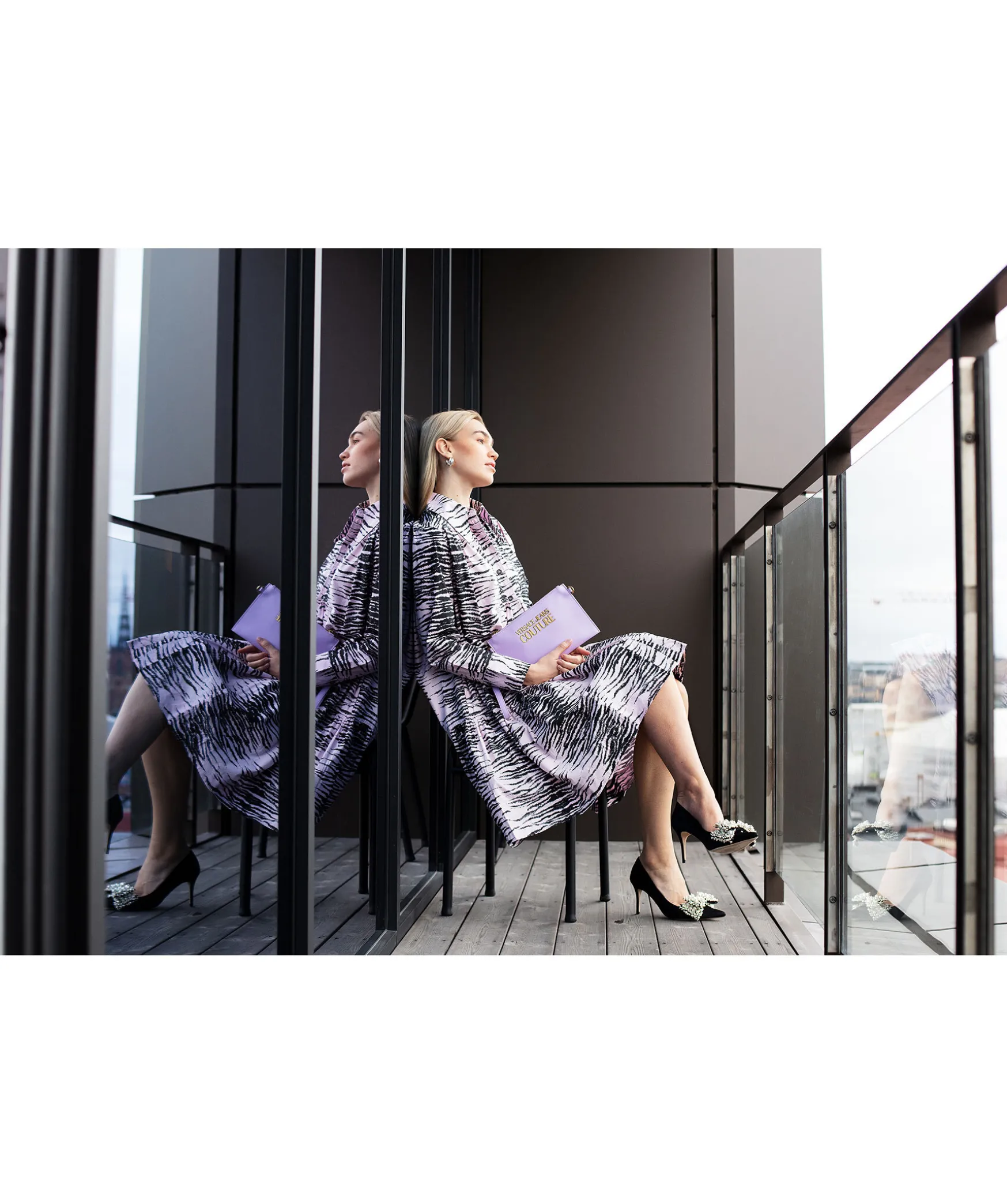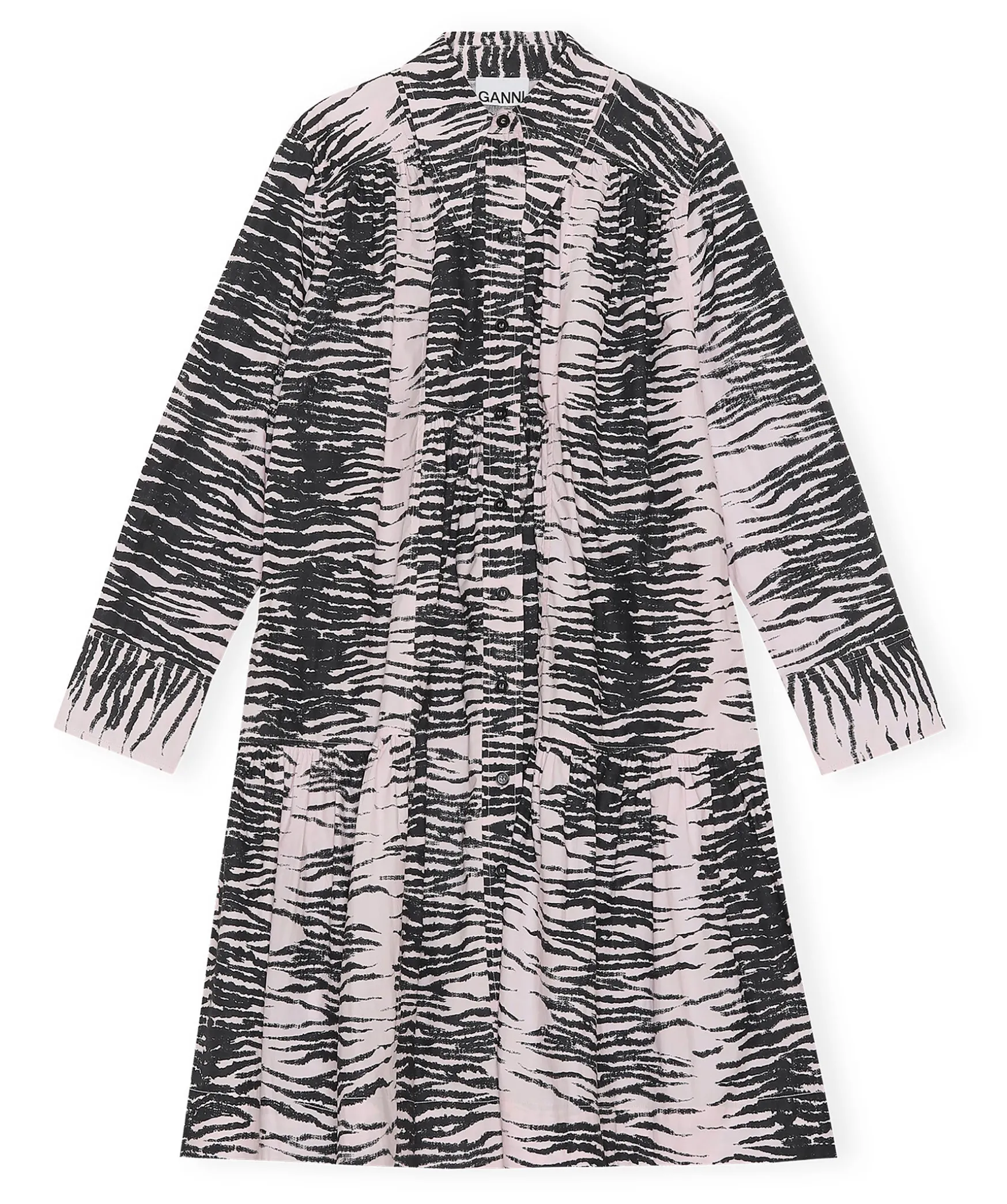 Ljusrosa Och Svart Monstrad Skjortklanning Fran Ganni. Stangs Framtill Med Knappar. Klanningen Har En Lang Spetsig Krage. Manschetter I Armslut. Latt Drapering Under Brostet Och I Hojd Med Midjan. Slutar Strax Ovanfor Knana.