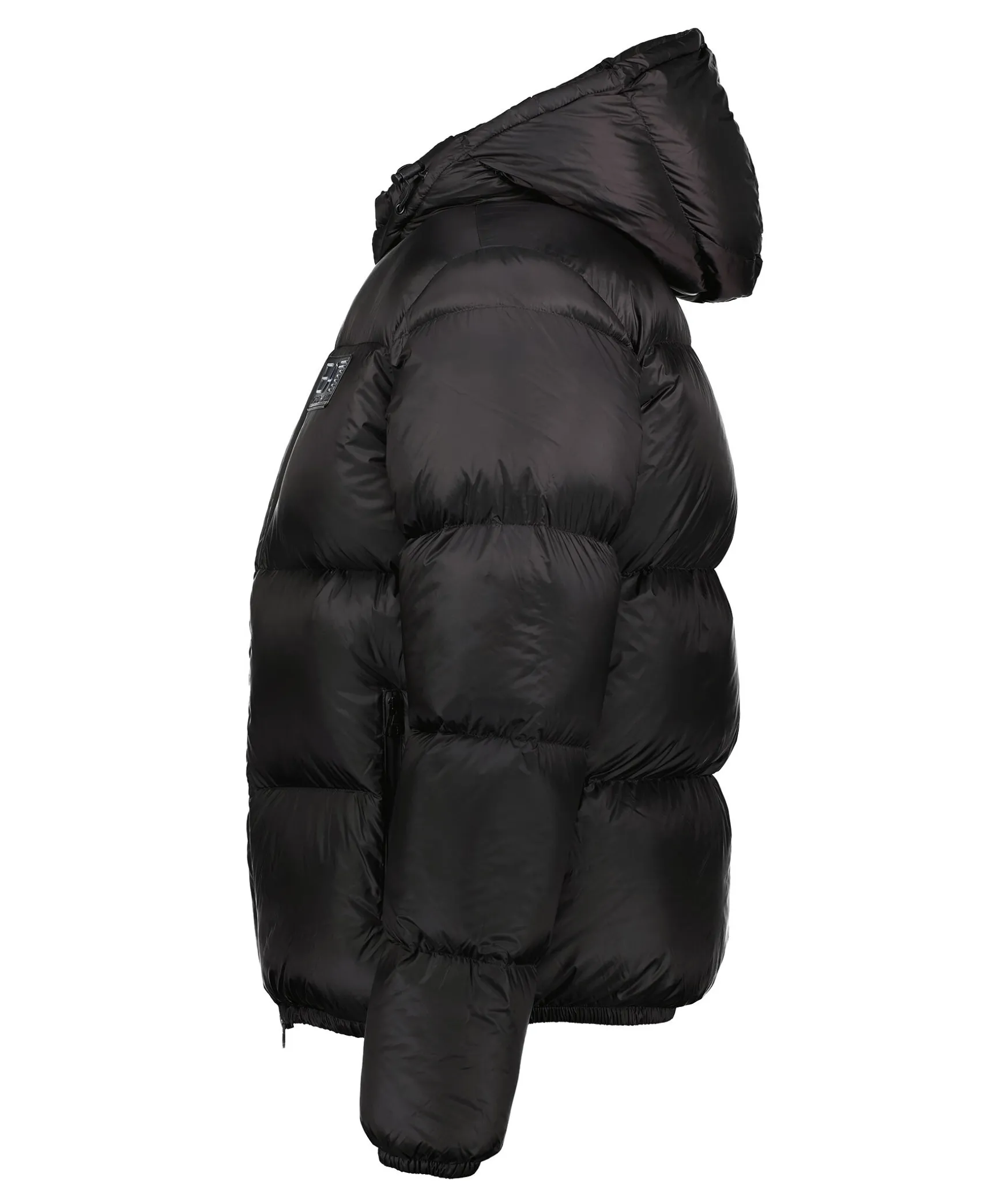 Svart Pufferjacka Fran Armani Ea7. Tillverkad I Polyamid. Jackan Har Huva Med Dragsko, Tva Sidfickor Med Dragkedja Och Tva Innerfickor. Gummerad Logotyp Pa Vanster Sida Av Brostet. Jackan Ar Packningsbar Och Vattenavvisande. 750 Fill Power.