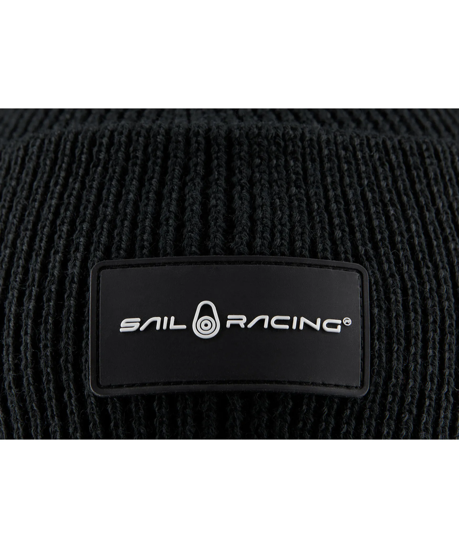 Svart Mossa Tillverkad I Ullblandning Fran Sailracing. Uppvikt Kant Och Svart Patch Med Logga Centrerad Pa Den Vikta Delen.