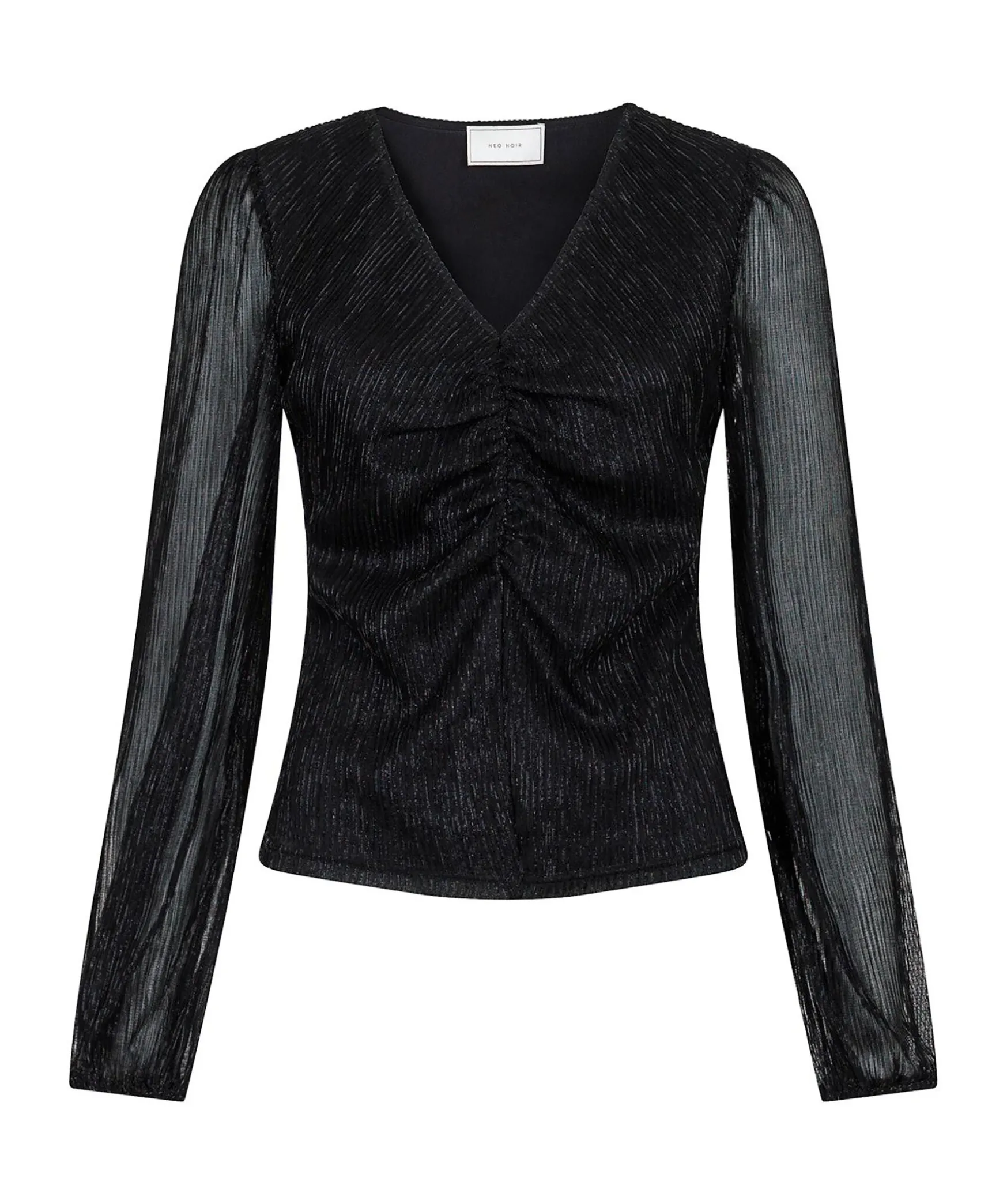 Svart Blus I Fin Glitterkvalitet Fran Neo Noir. Blusen Har Rynkning Fram Och Langa Armar Med Puffeffekt. Blusen Har Foder I Kroppen Sa Den Ar Inte Genomskinlig. Tillverkad I 100% Polyester.