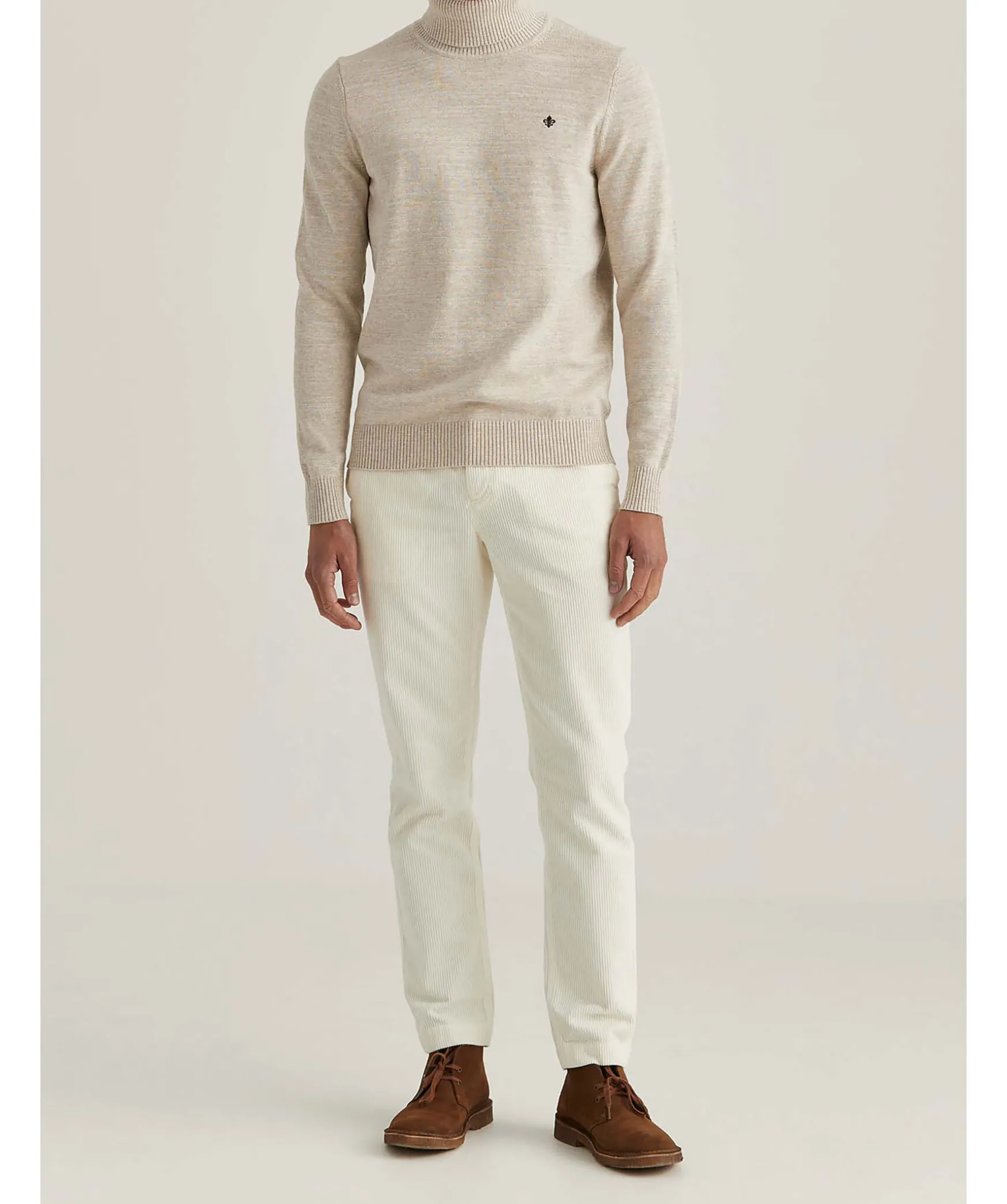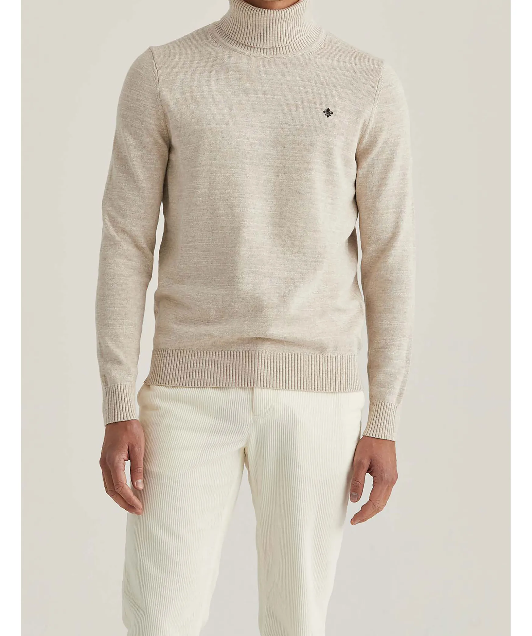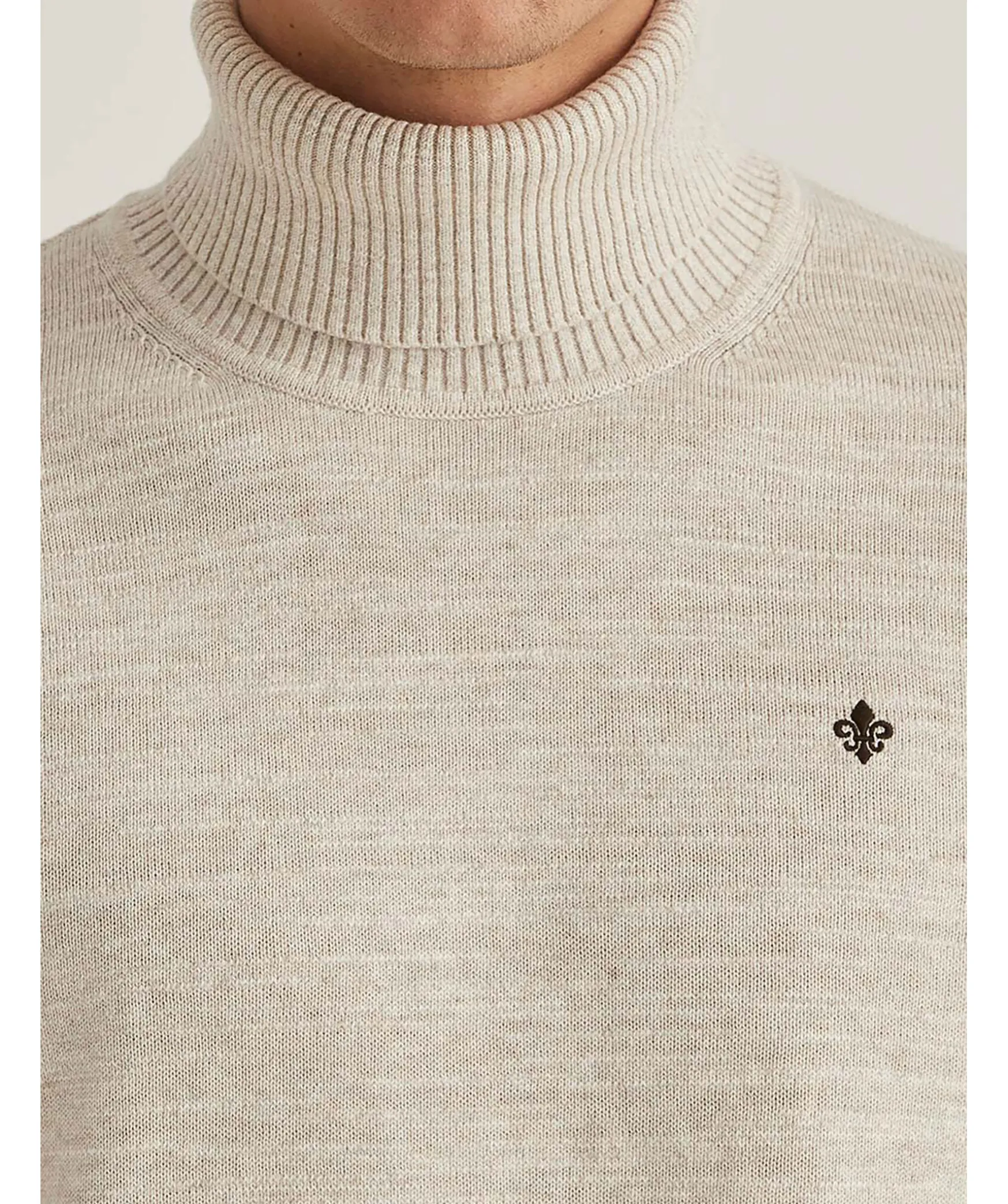 Melerad Polotroja I Beige Fran Morris. Trojan Ar Stickad I 100% Bomull Och Har En Ribbad Polokrage, Muddar Vid Arm Och Plaggslut. Broderad Fransk Lilja Pa Brostet.
